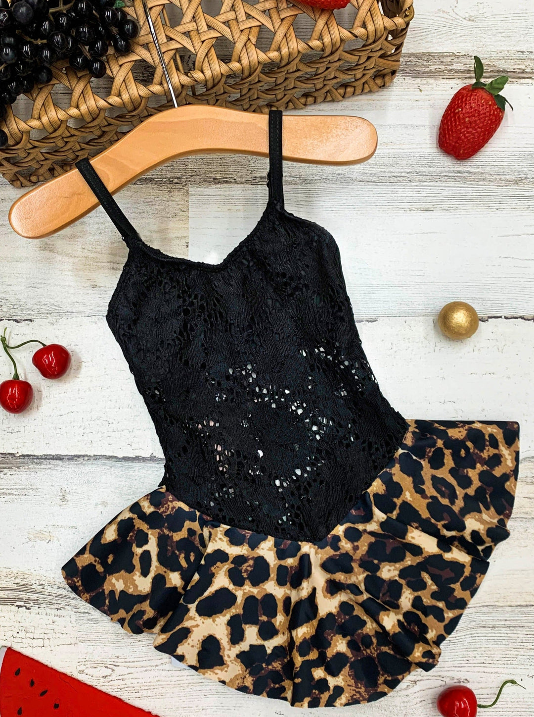 We're bringing all the sassy, chic style to the beach this year with our sophisticated skirted one-piece swimsuit for girls. This one-of-a-kind boutique design features floral lace, and a leopard print ruffle skirt while keeping the shape age-appropriate and adorable.