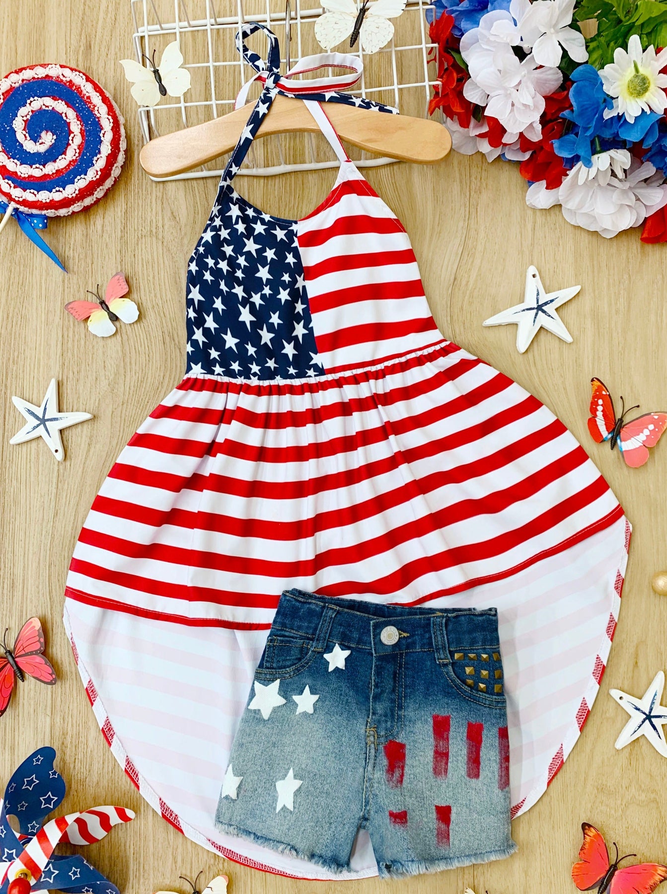 - Oh, say can you see...how adorable this flag top and denim shorts set is? The US flag hi-lo halter top couldn't be cuter if it tried. Get those cameras ready; the fireworks are ready to blow!