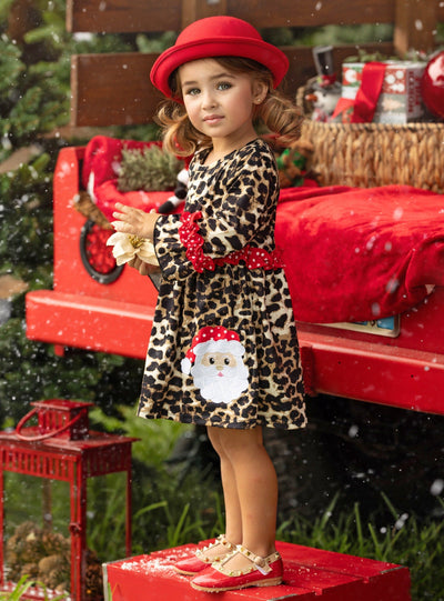- Long-sleeve leopard print dress with polka ruffle details and the cuffs and waist, ruffle cuffs, and Santa face applique