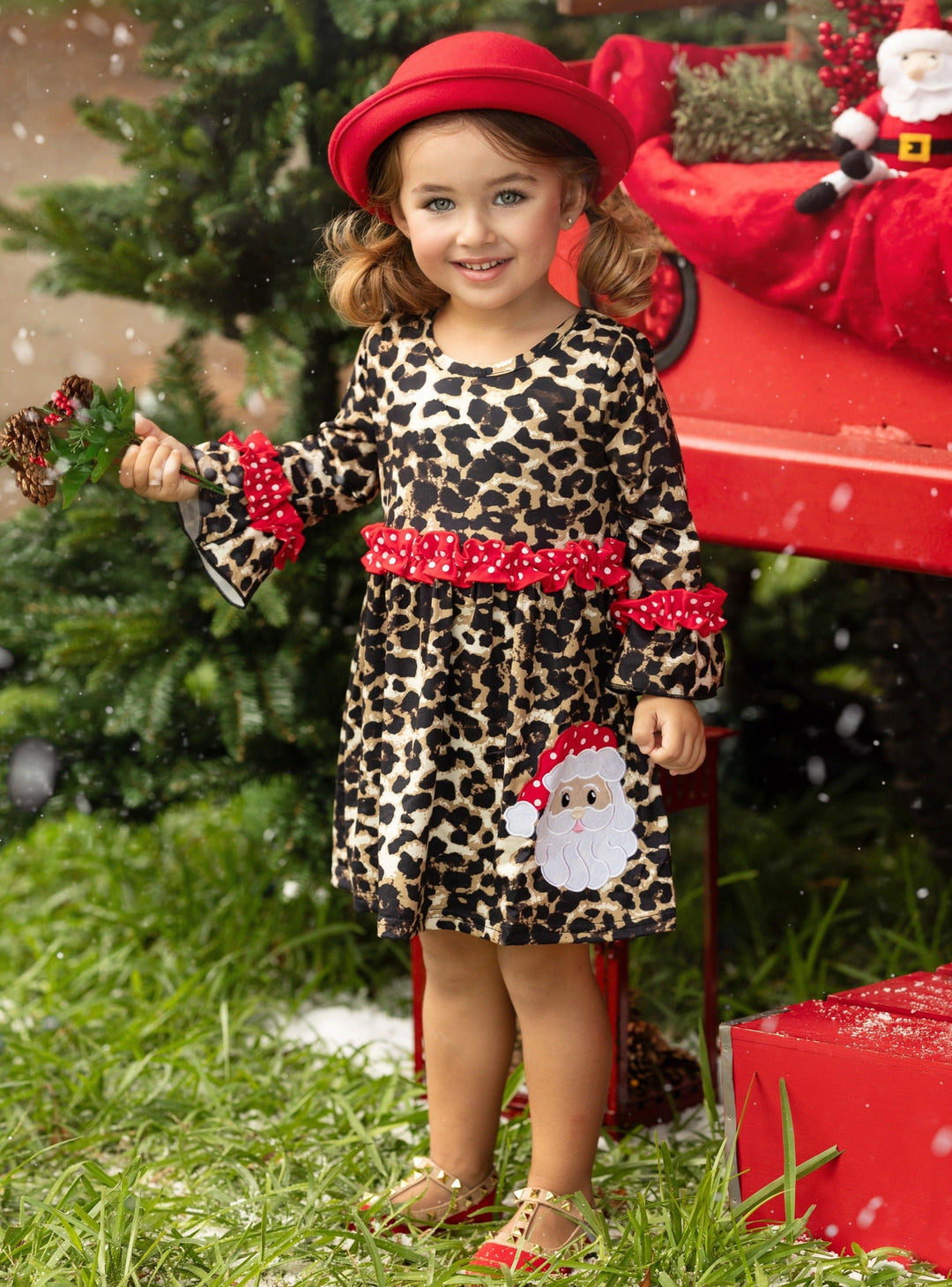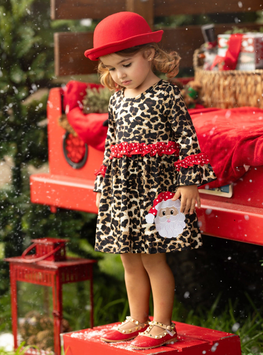 - Long-sleeve leopard print dress with polka ruffle details and the cuffs and waist, ruffle cuffs, and Santa face applique