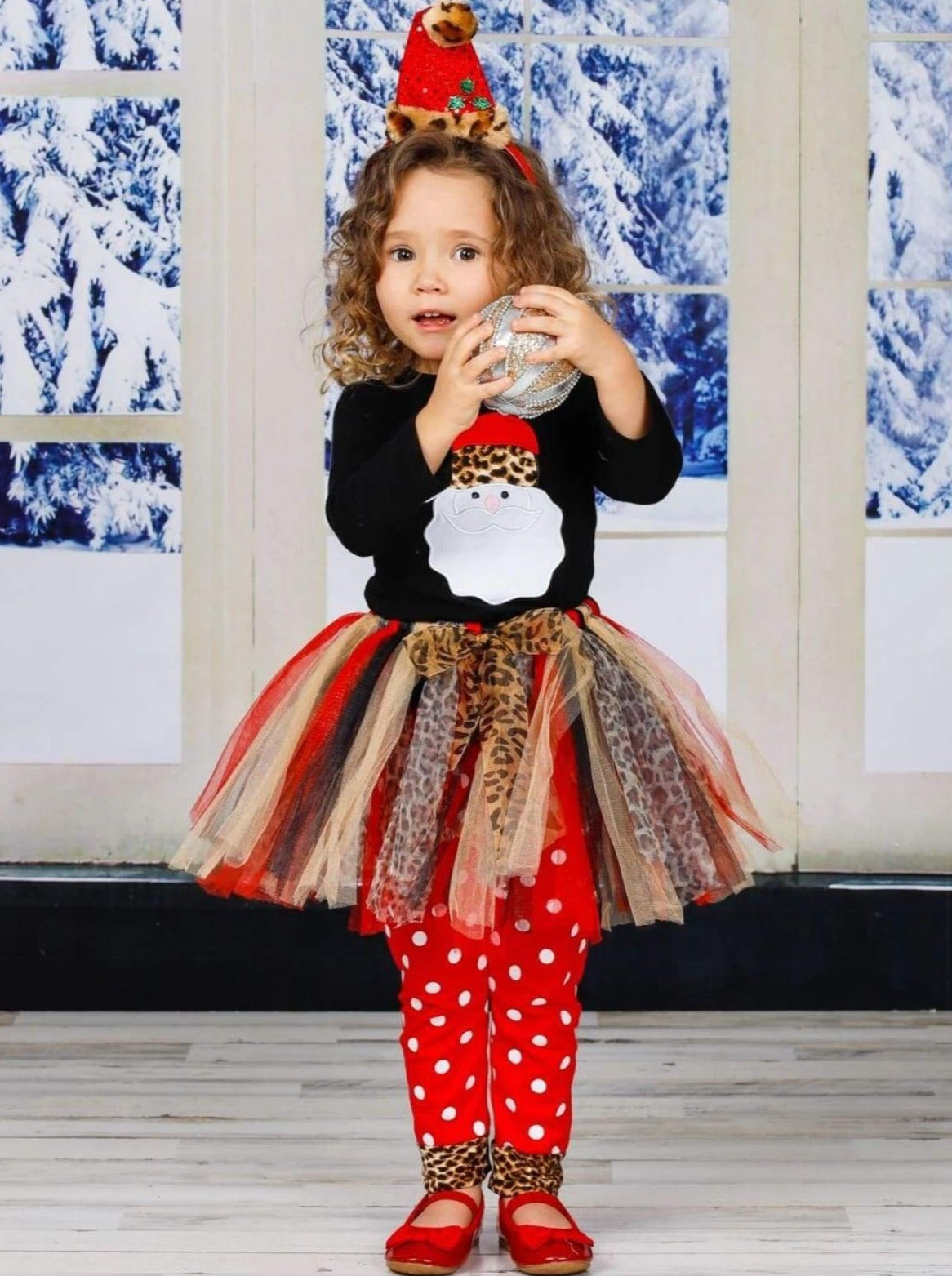 Long-sleeve top with Santa face applique, tutu skirt features multicolor tulle strands and polka dot leggings with leopard print cuffs