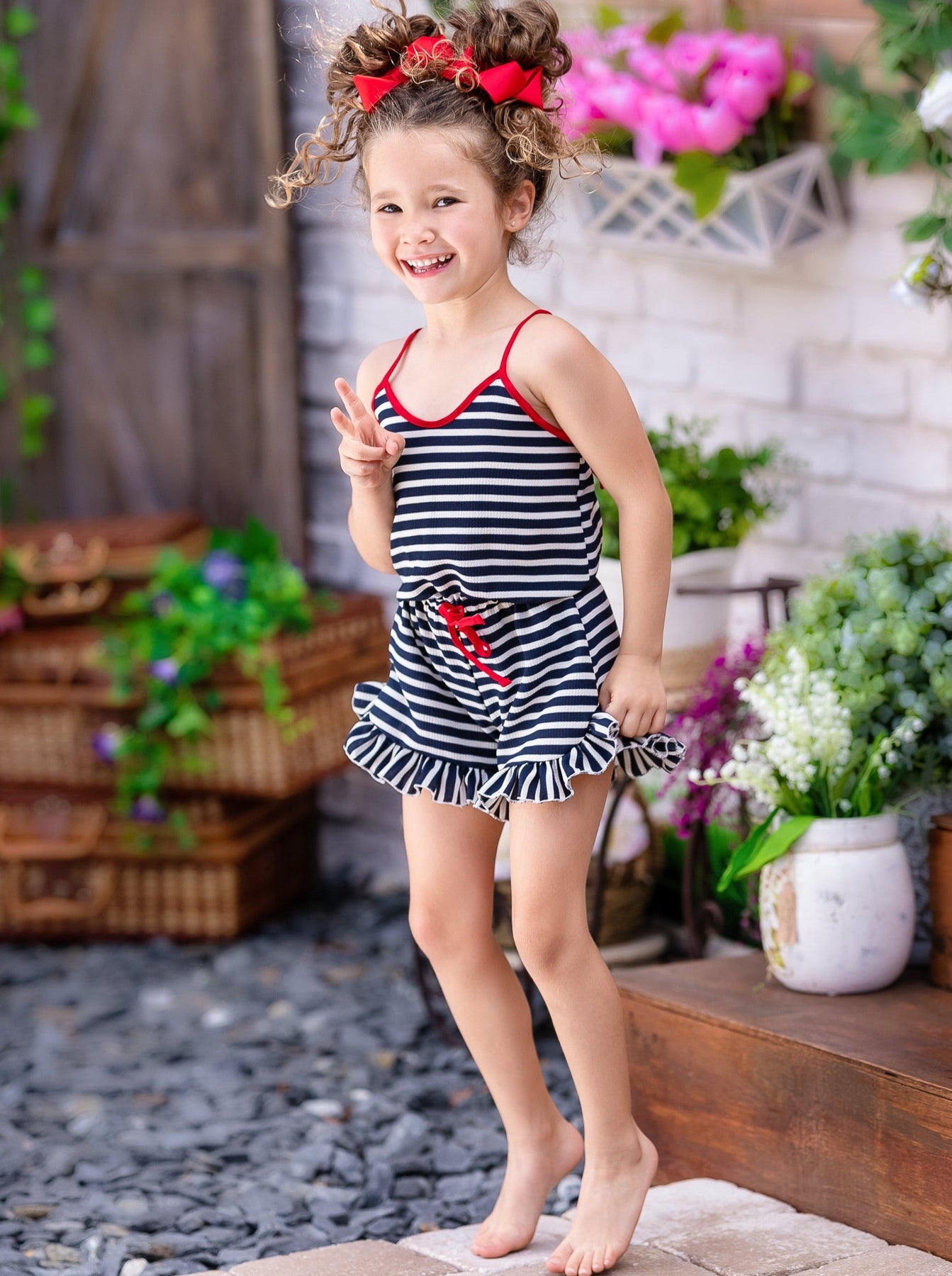 - Sleeveless striped ruffle hem romper with built-in red drawstring