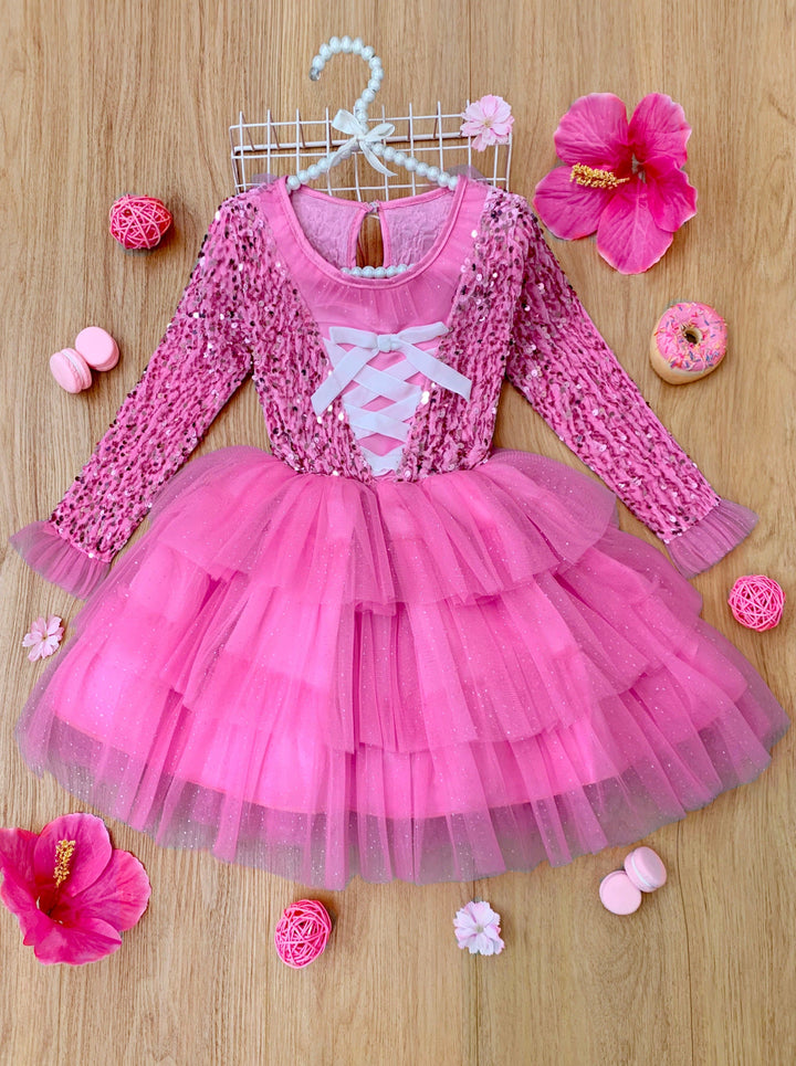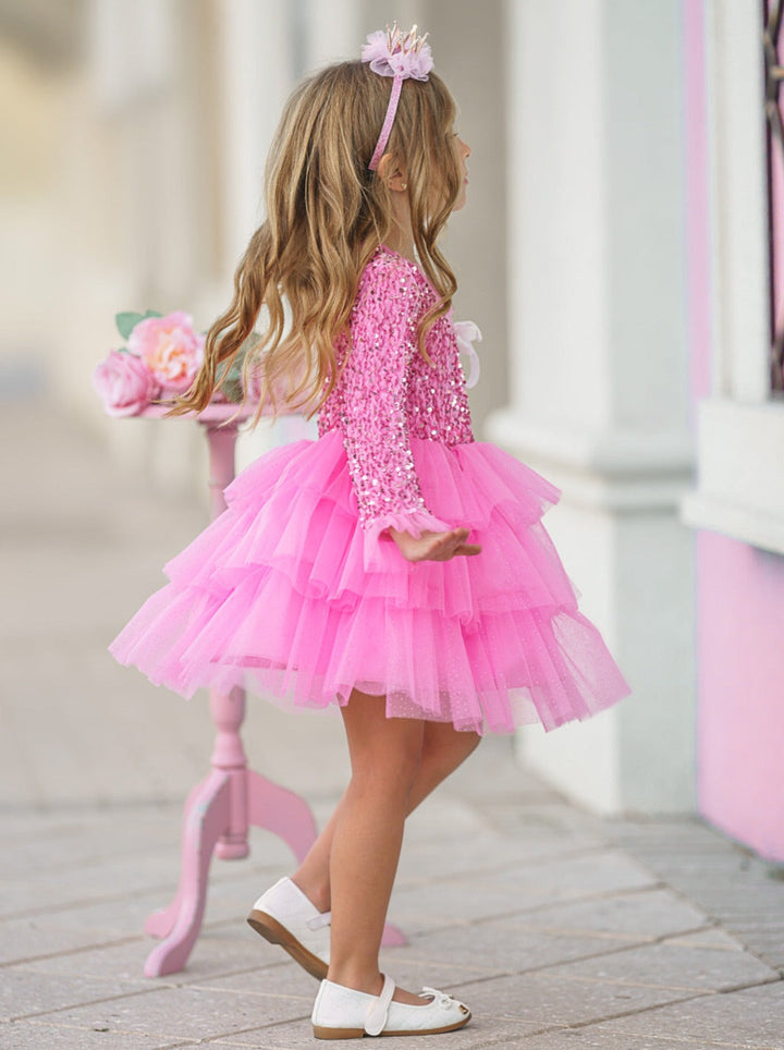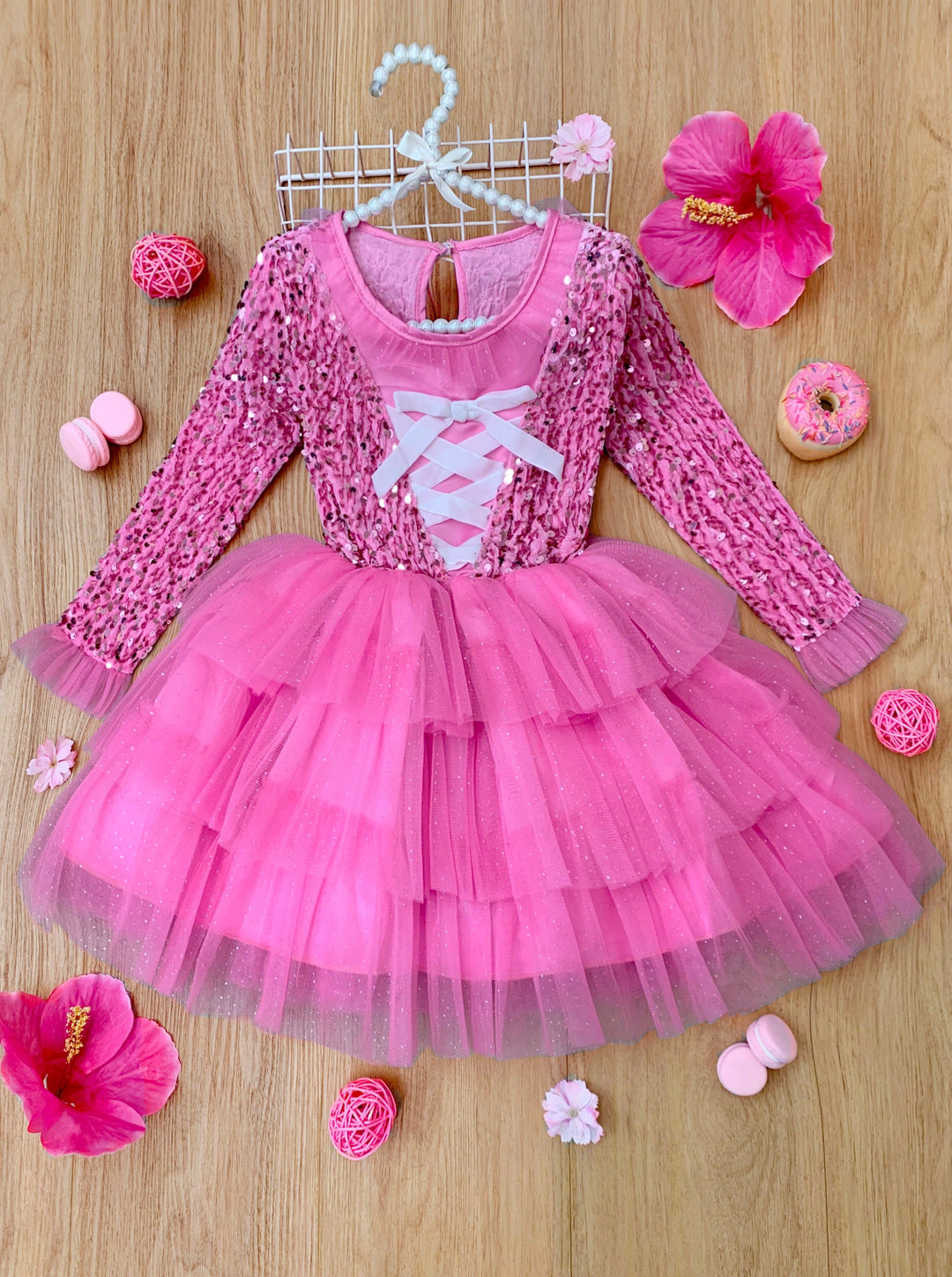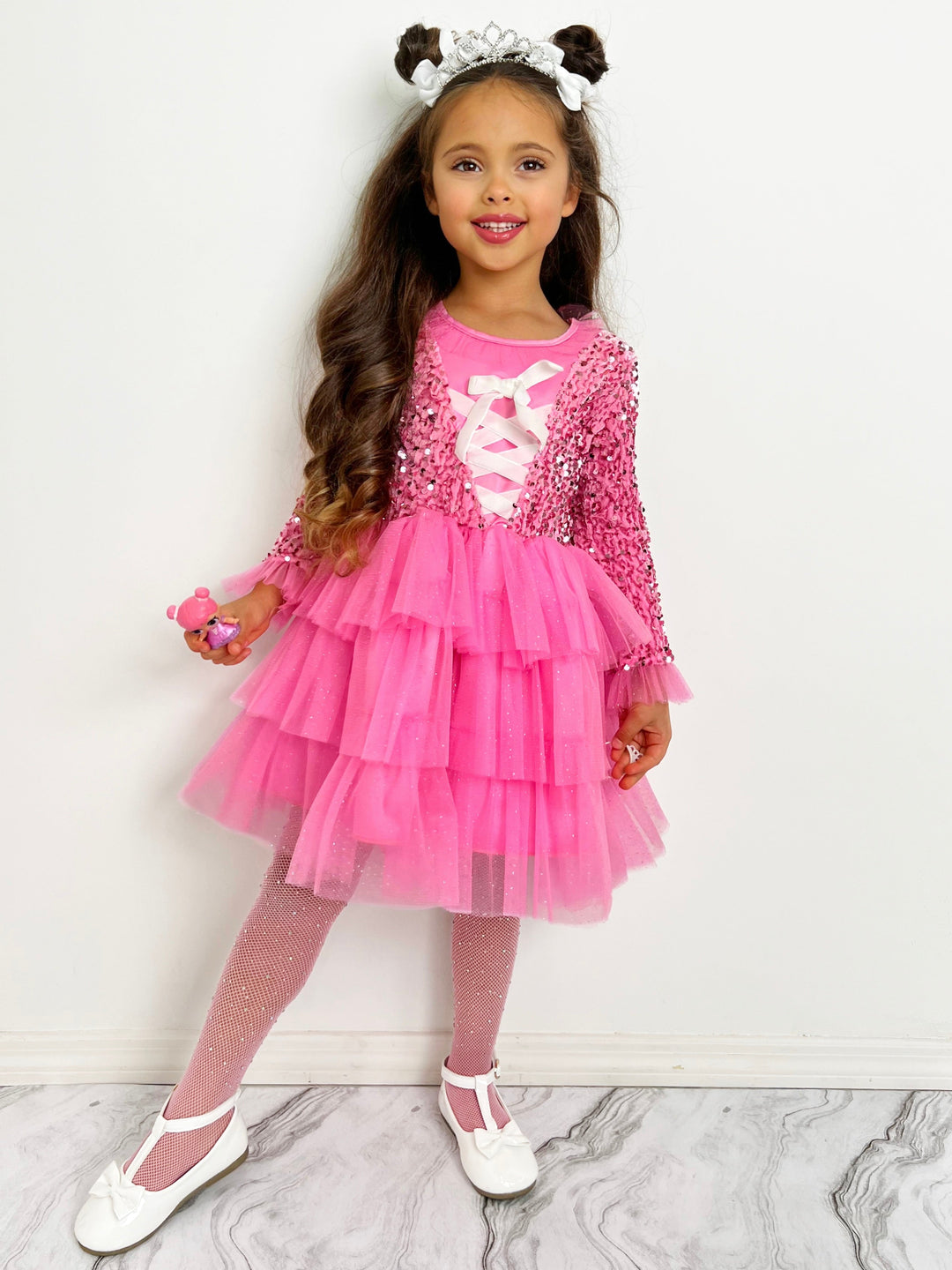 - Long sleeve pink velvet ballerina dress with sequin-threading body, white velvet corset ribbon details a tiered skirt, flutter tulle cuffs, and tiered skirt; zips with keyhole finish in back.