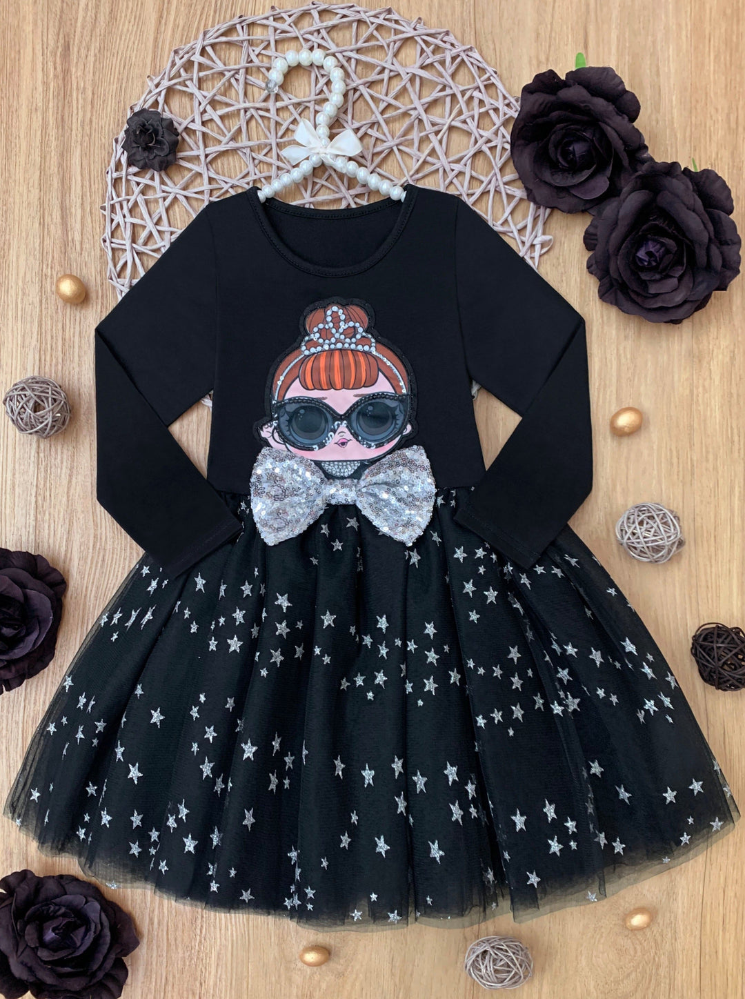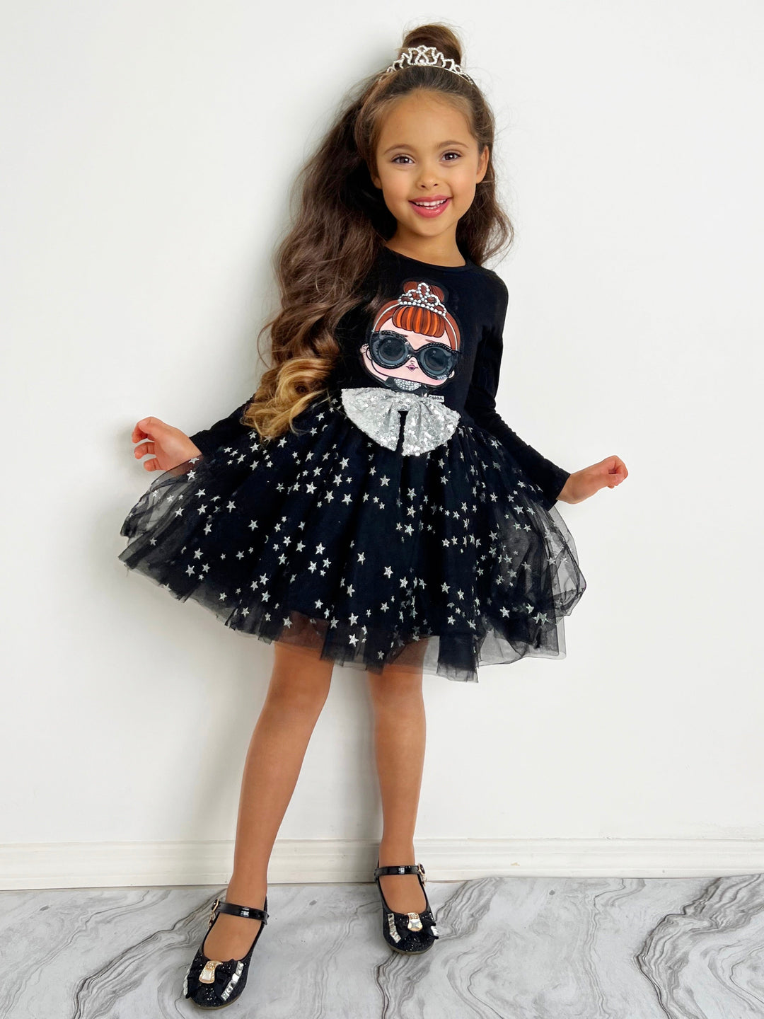 • Long sleeve black tutu dress with sequin-thread embroidered L.O.L. SURPRISE!™ IT Baby character, glitter star tulle skirt, and sequin-thread statement bow at the waist