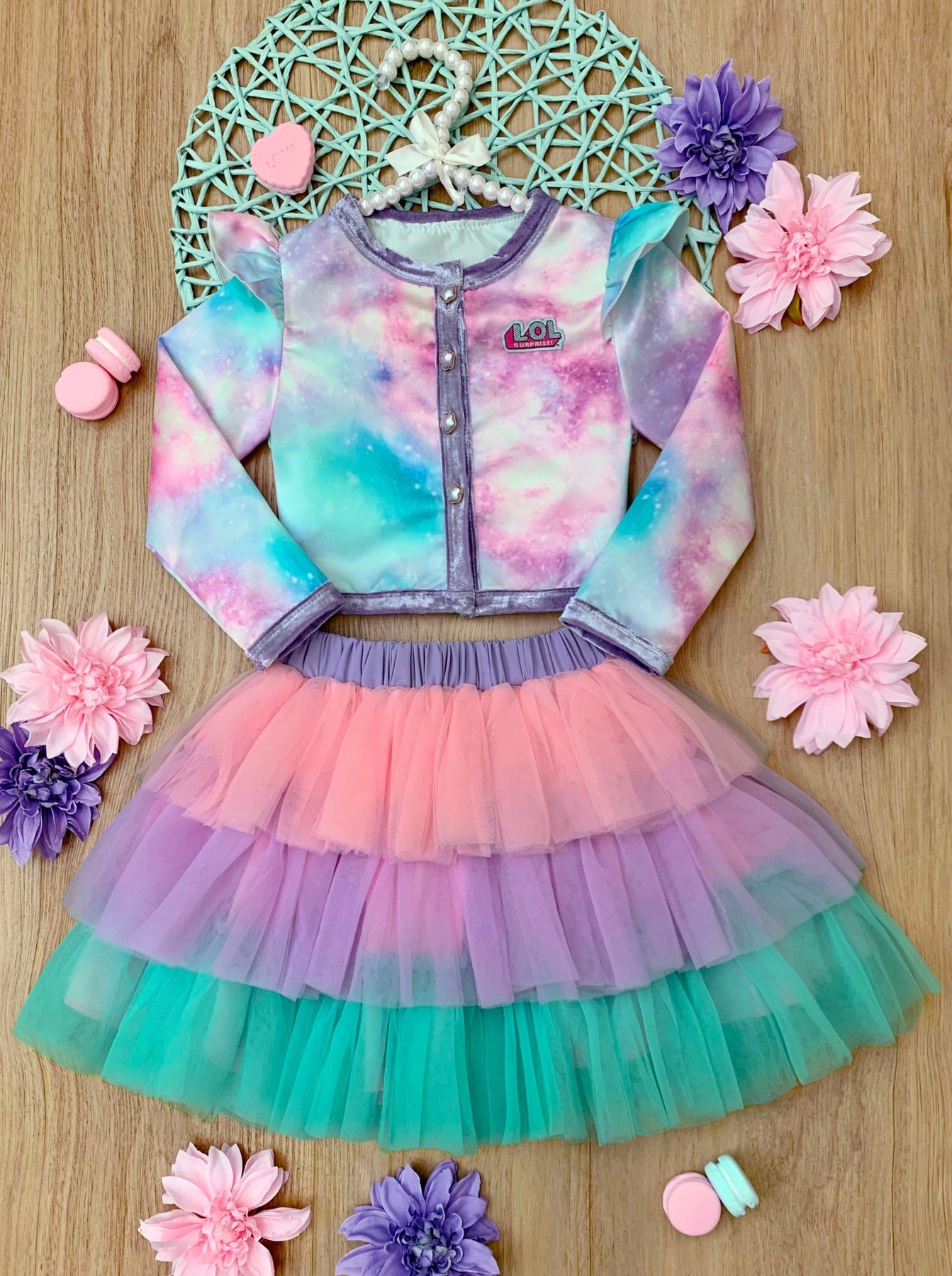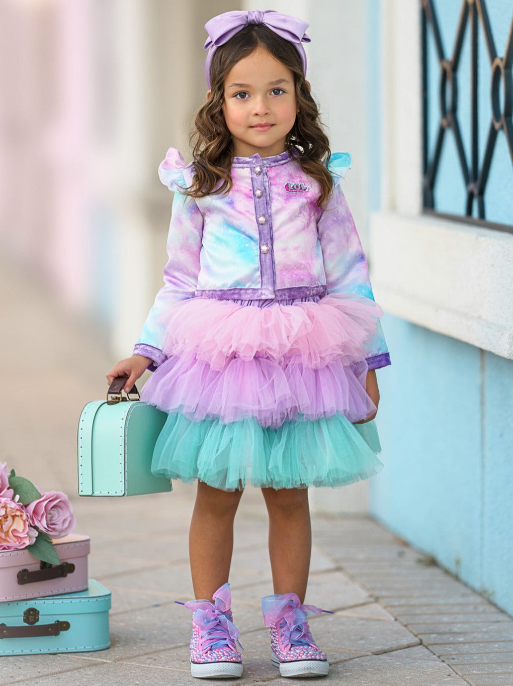 - Galaxy print satin jacket with pearled heart buttons, flutter shoulders, velvet trim, embroidered L.O.L. SURPRISE!™ logo, and tri-color pastel tiered tutu skirt. No shirt included.