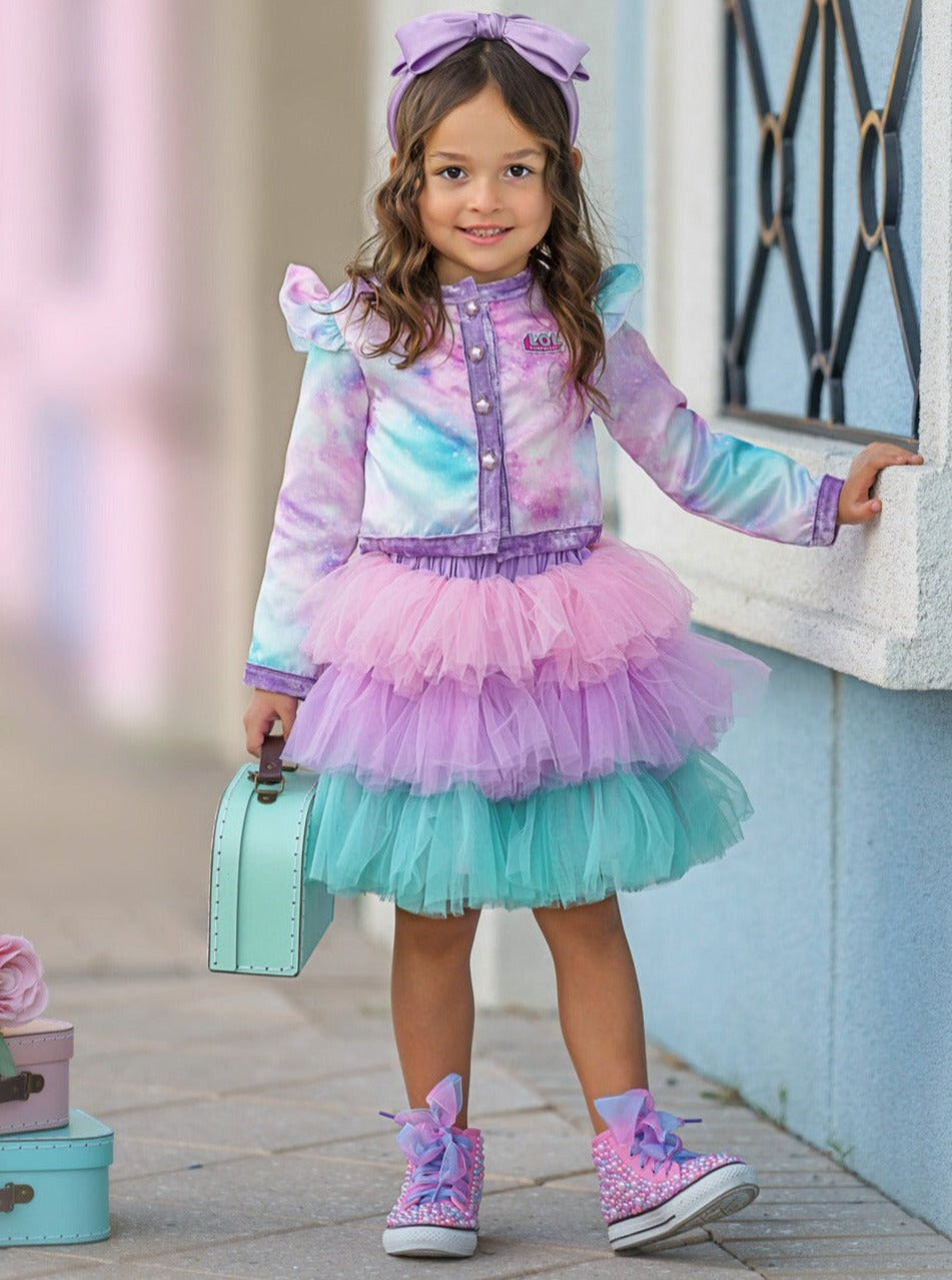 • Galaxy print satin jacket with pearled heart buttons, flutter shoulders, velvet trim, embroidered L.O.L. SURPRISE!™ logo, and tri-color pastel tiered tutu skirt. No shirt included.