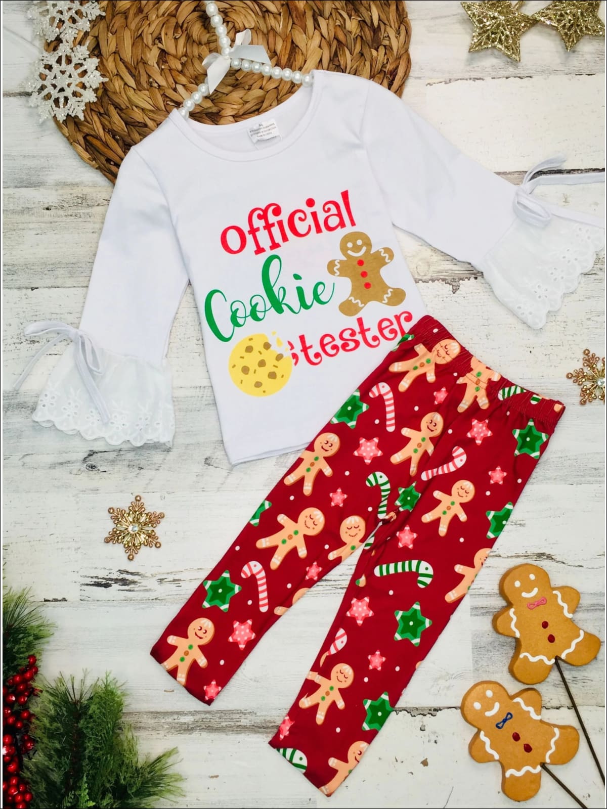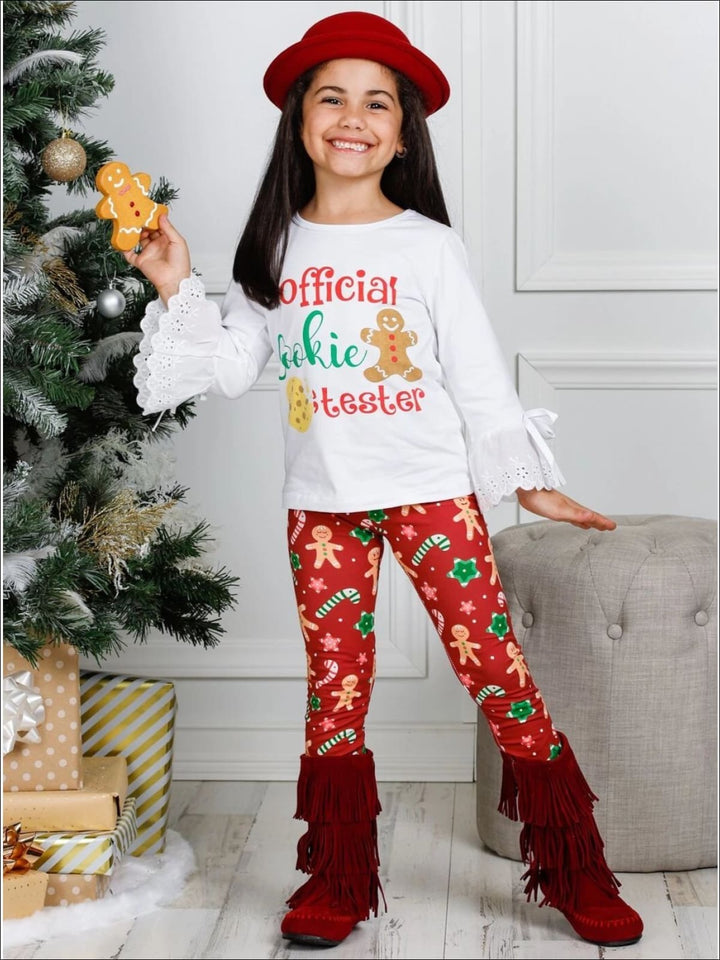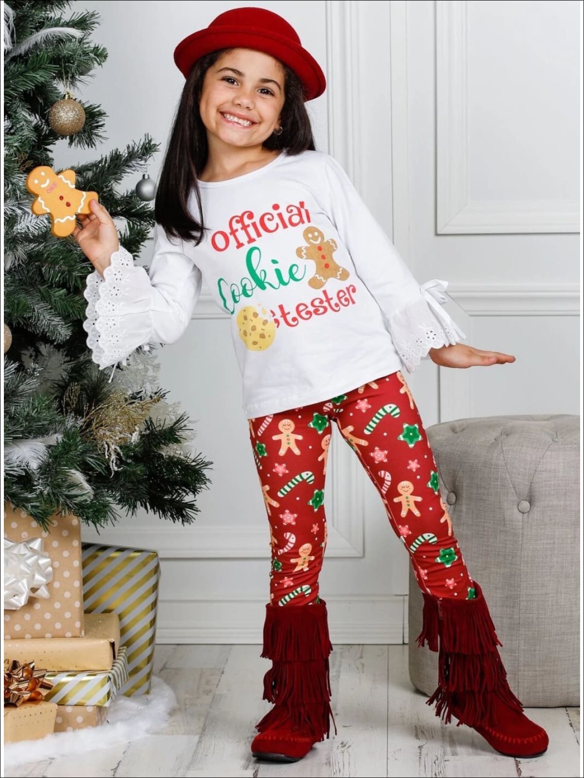 Soft, cheery & bright, this holiday set will layer your little cookie monster in a personality-filled, lace-detailed top & matching leggings. A festive gingerbread print completes her holiday look!