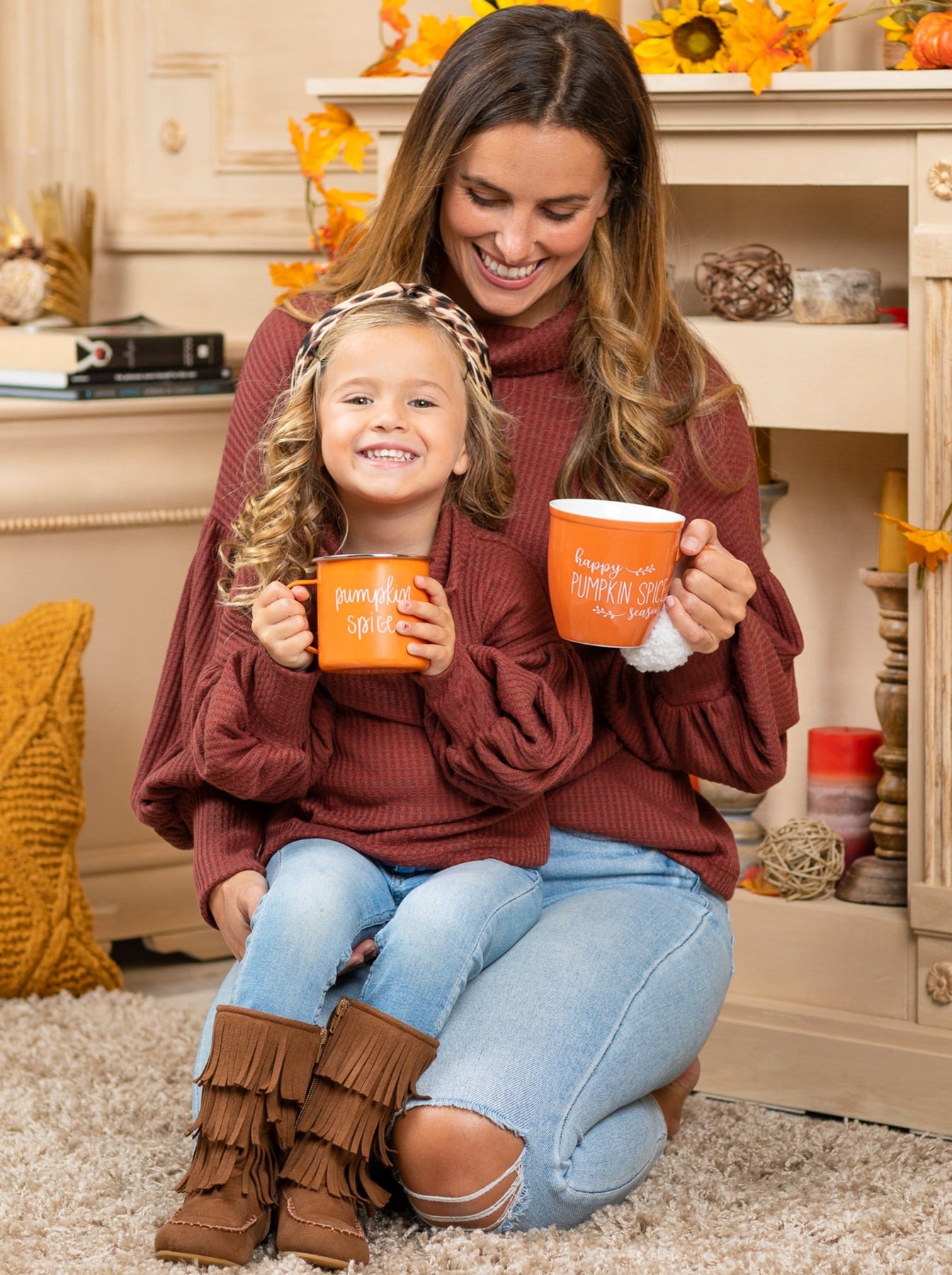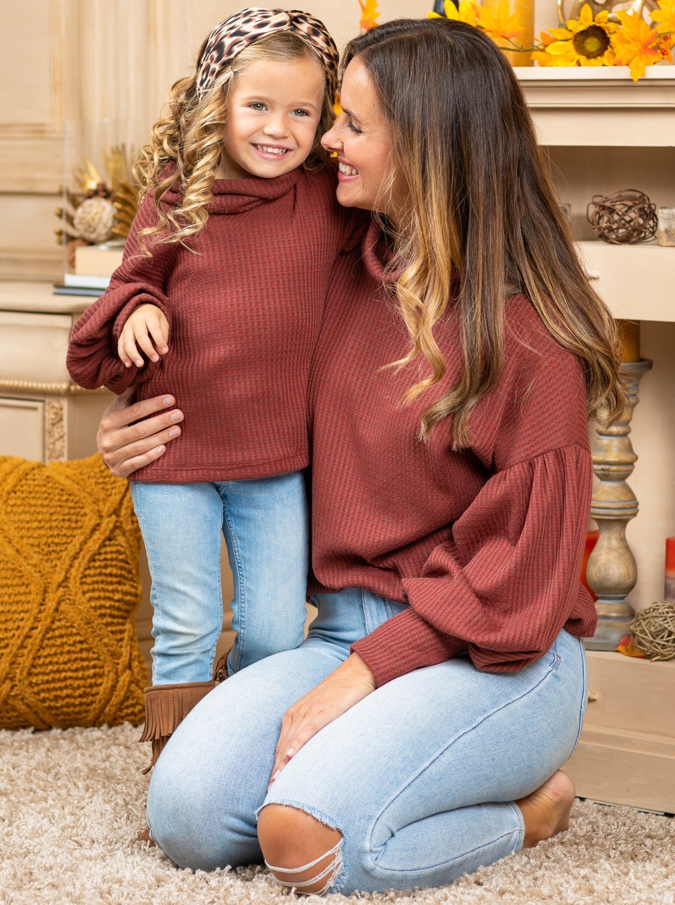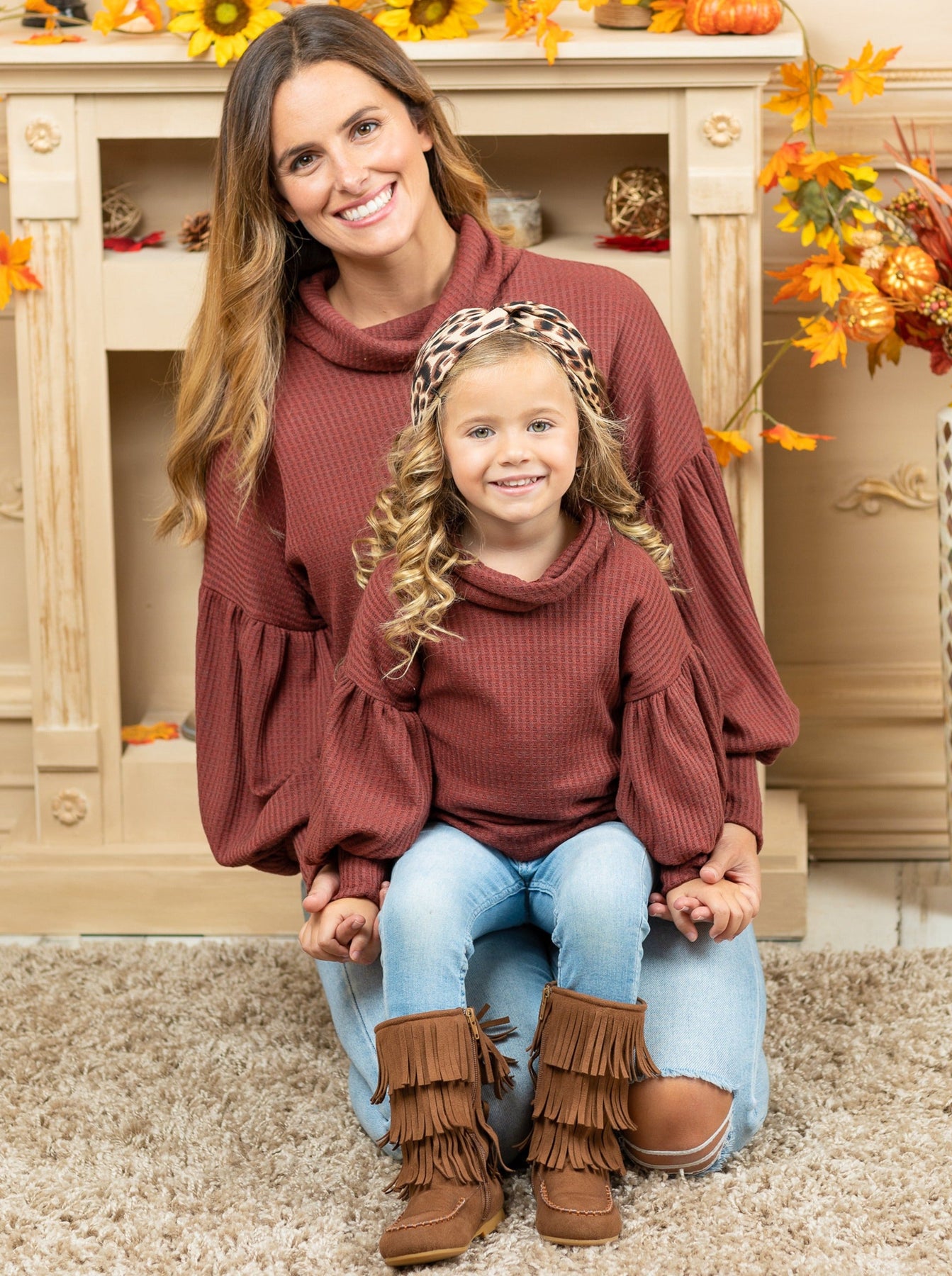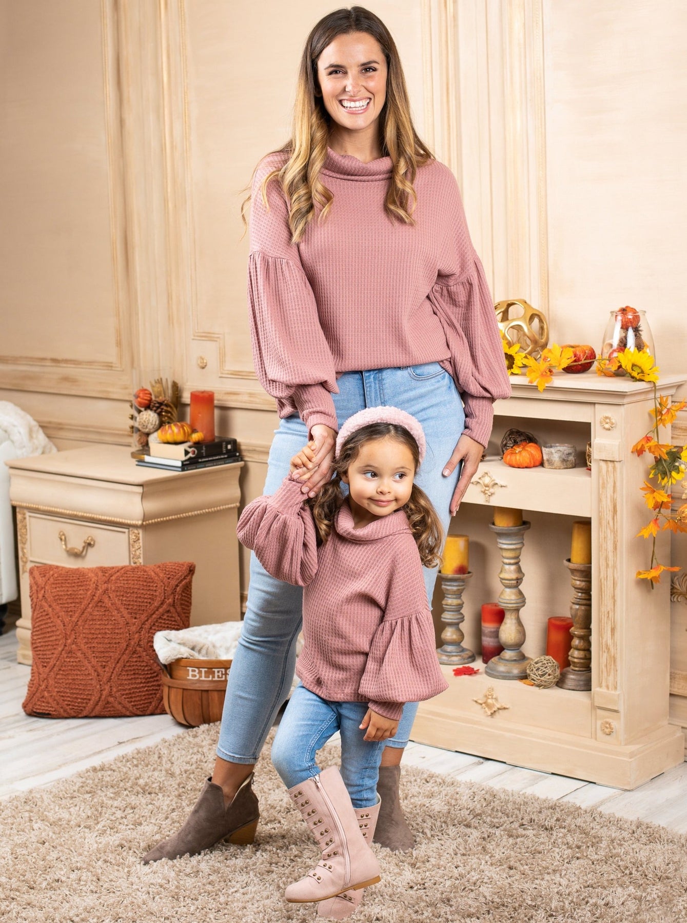 Make a statement in our mother-daughter matching puff-sleeve turtleneck sweaters. The brilliant color and cozy waffle-knit will make you the cutest diva-duo around.