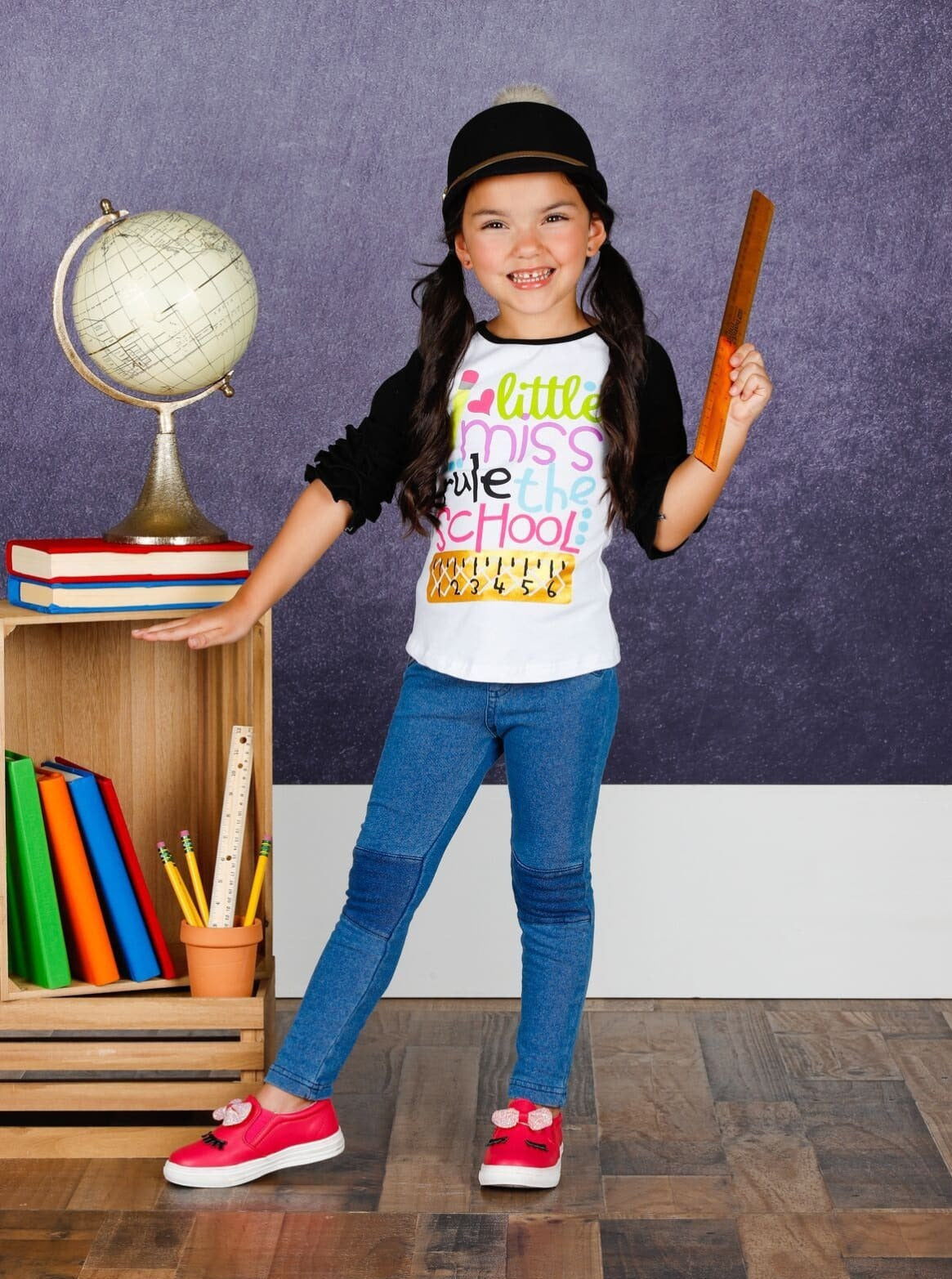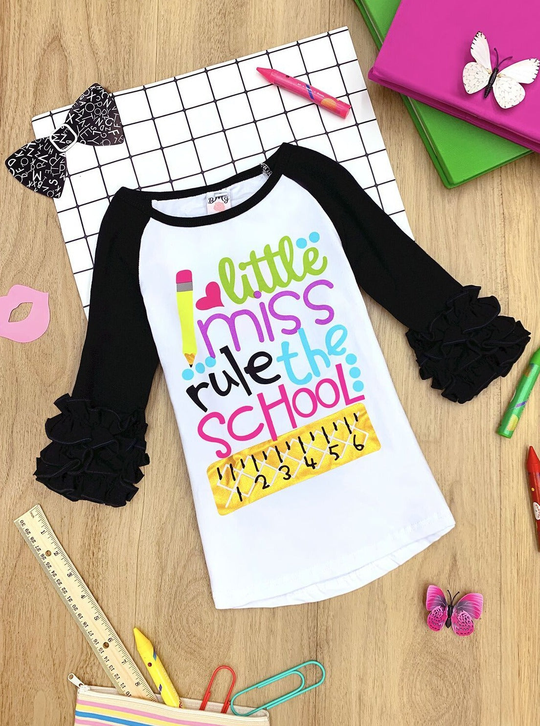 - Raglan Long-sleeve top with "Little Miss Rule The School" graphic and ruffles