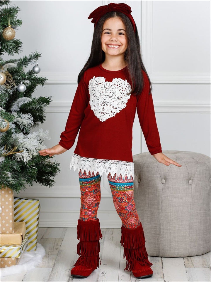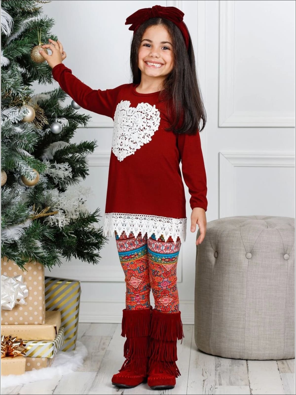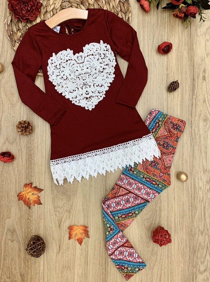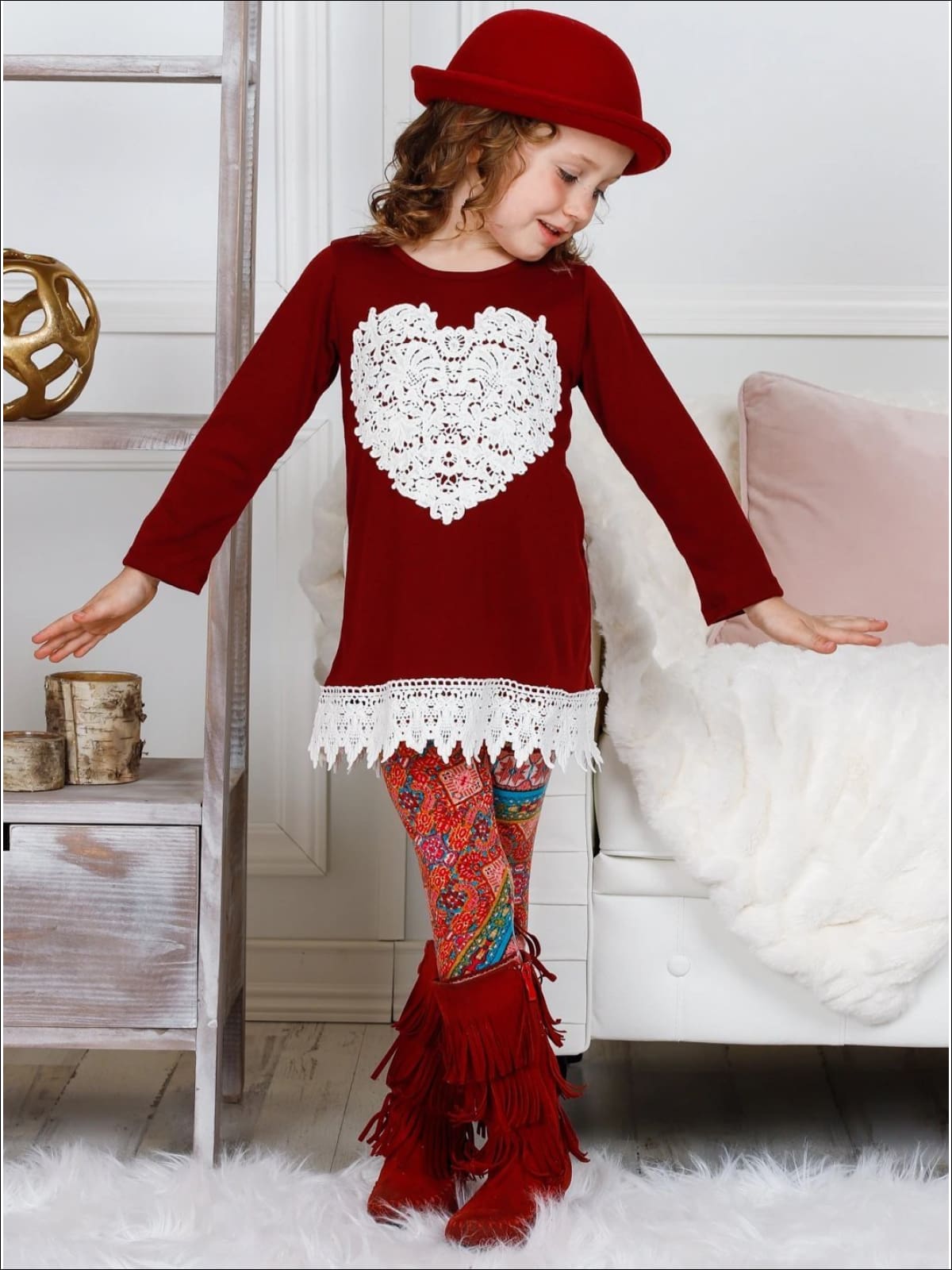 Long-sleeve tunic with crochet heart and hem, and colorful abstract print leggings
