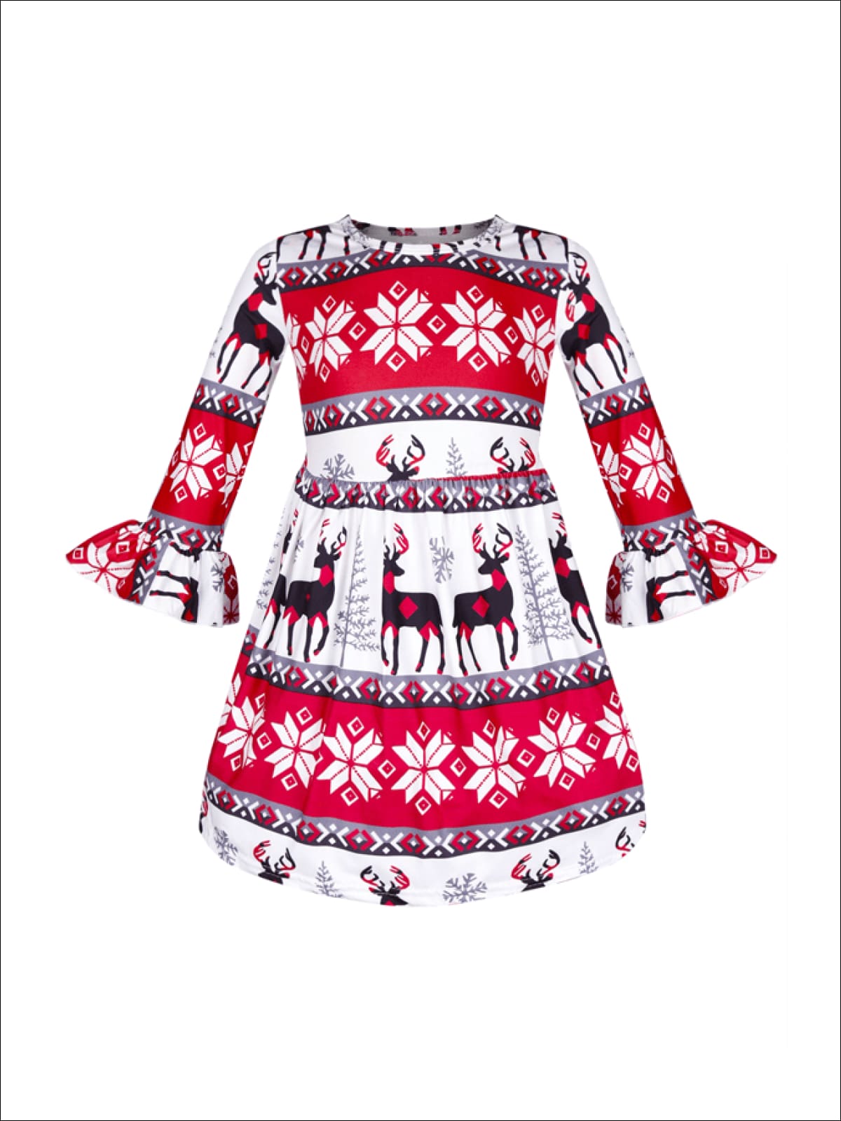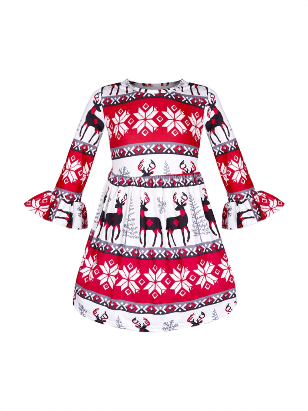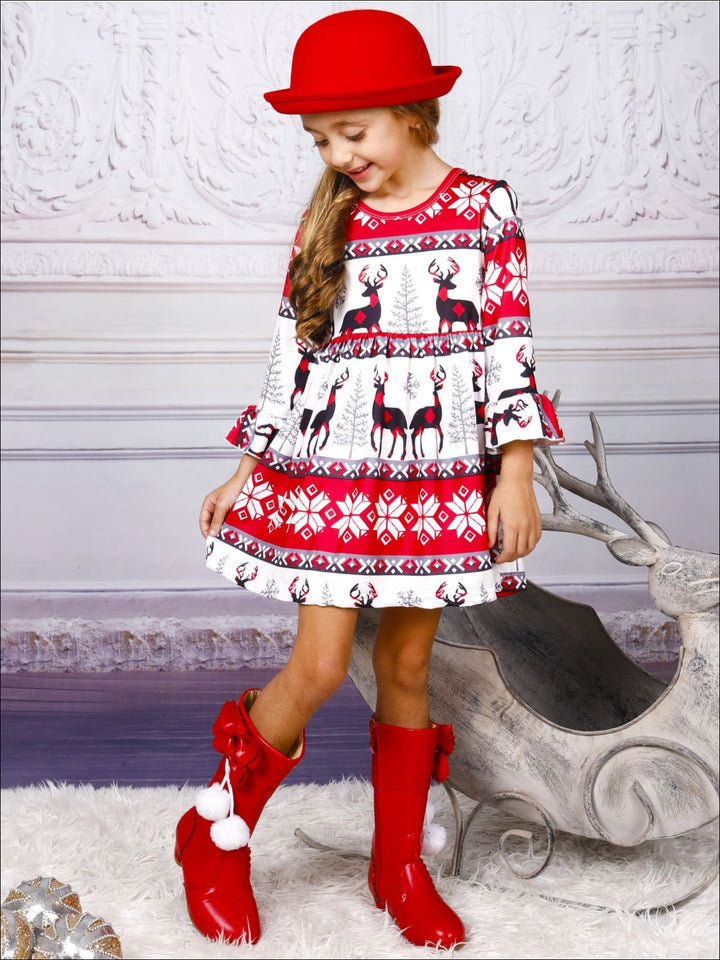Girls Long Sleeve Moose Print Dress with Bell Sleeves