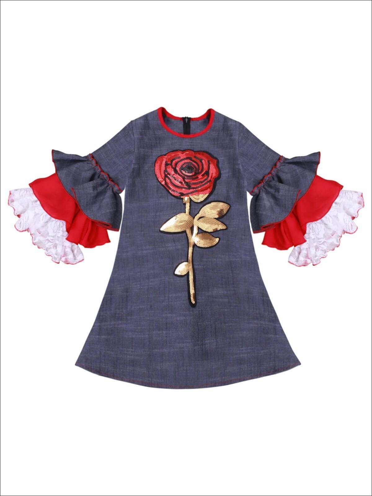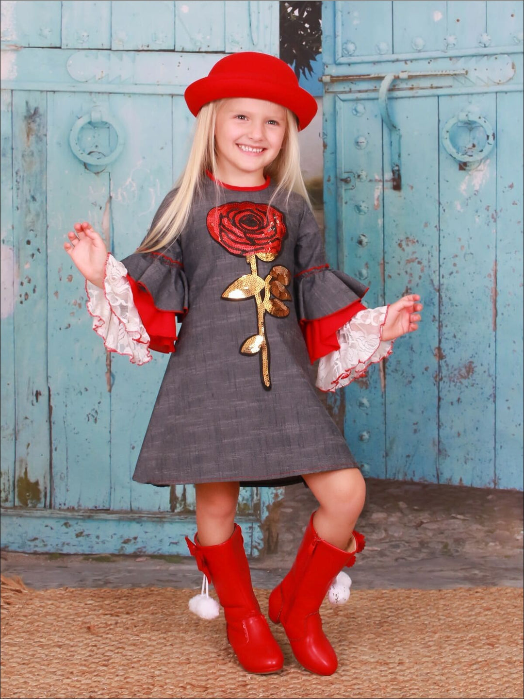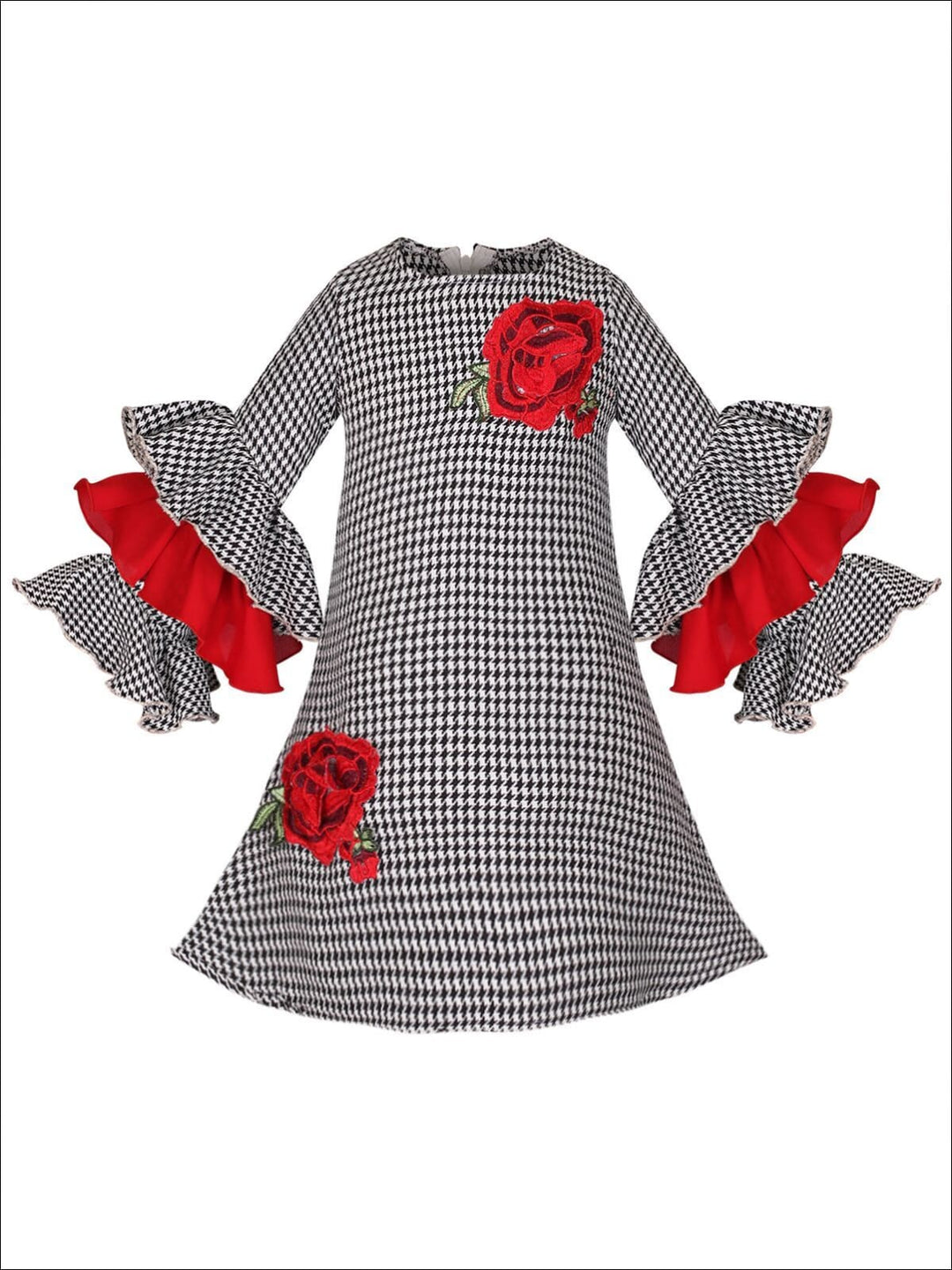 Girls Long Tiered Ruffled Sleeve Dress with Floral Trim - Girls Fall Dressy Dress