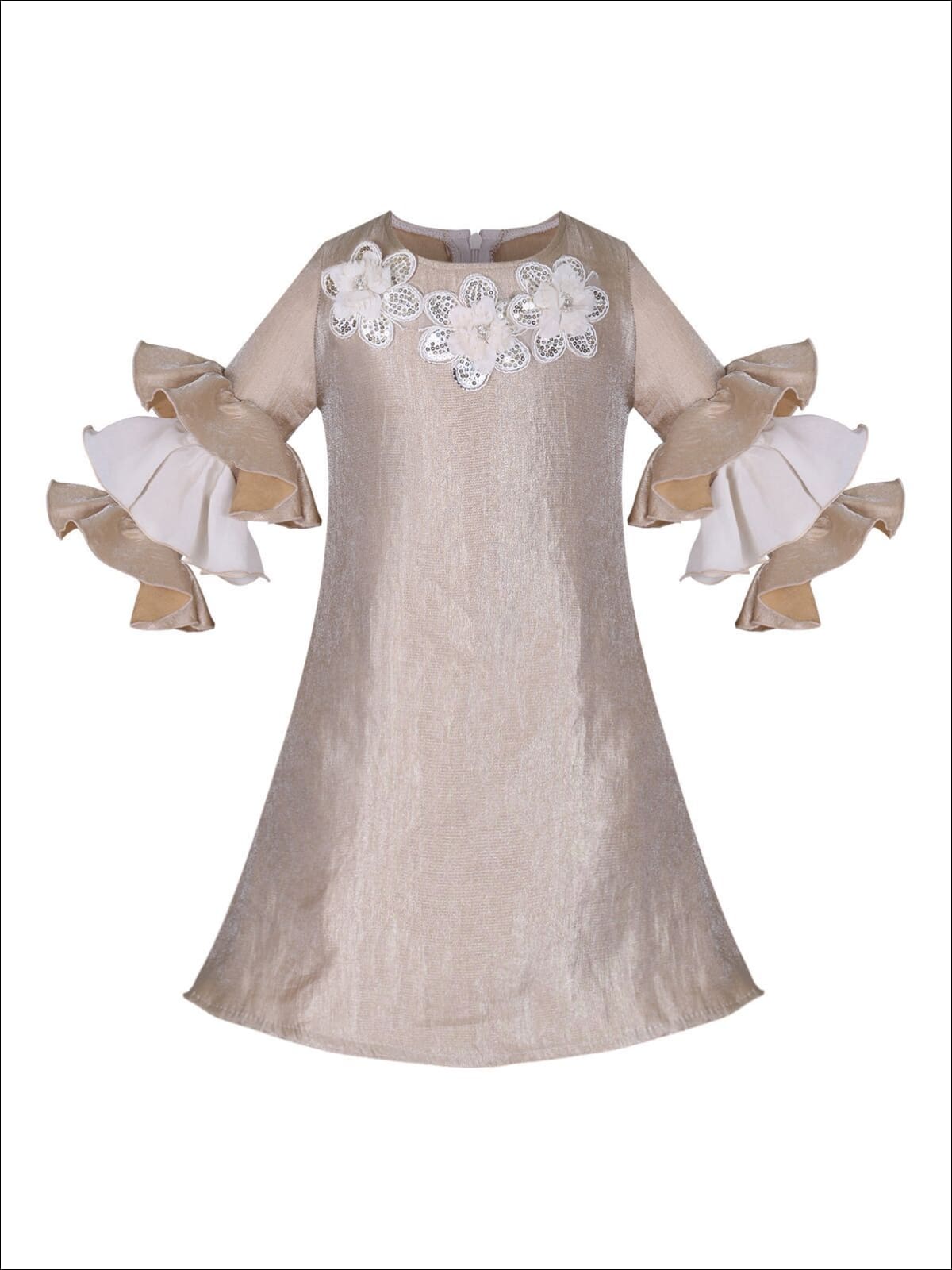 Girls Long Tiered Ruffled Sleeve Dress with Floral Trim - Gold / 2T-3T - Girls Fall Dressy Dress
