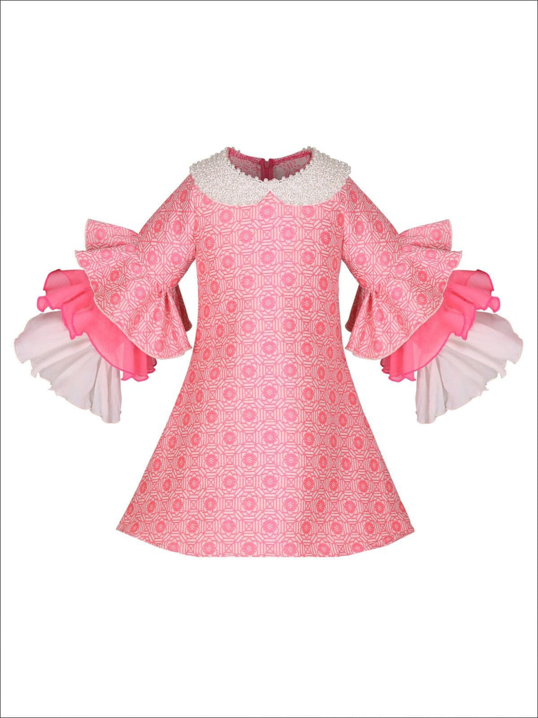 Girls Long Tiered Ruffled Sleeve Dress with Floral Trim - Pink / 2T-3T - Girls Fall Dressy Dress