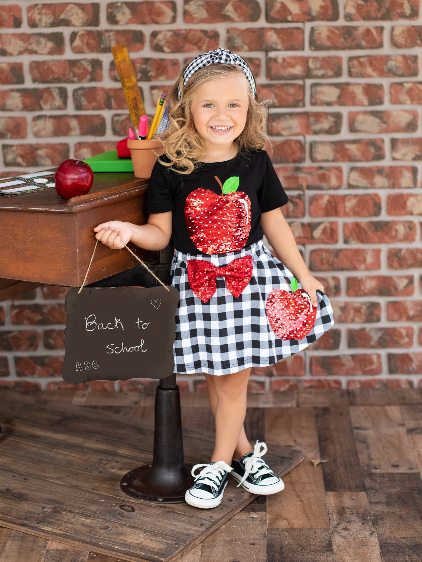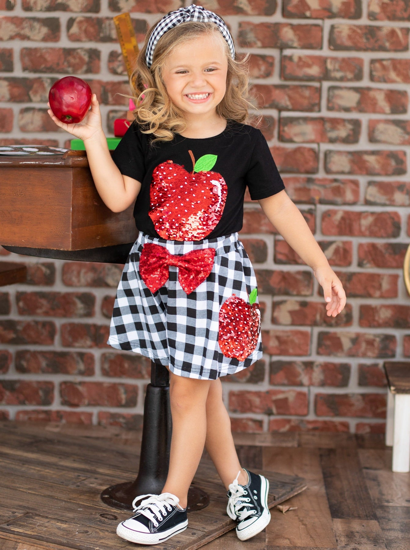 - Your little learner is going to adore this perfectly pre-styled preppy chic skirt set as she turns her school hallways into runways. Check out the reversible sequin apples for added sparkle and fun!