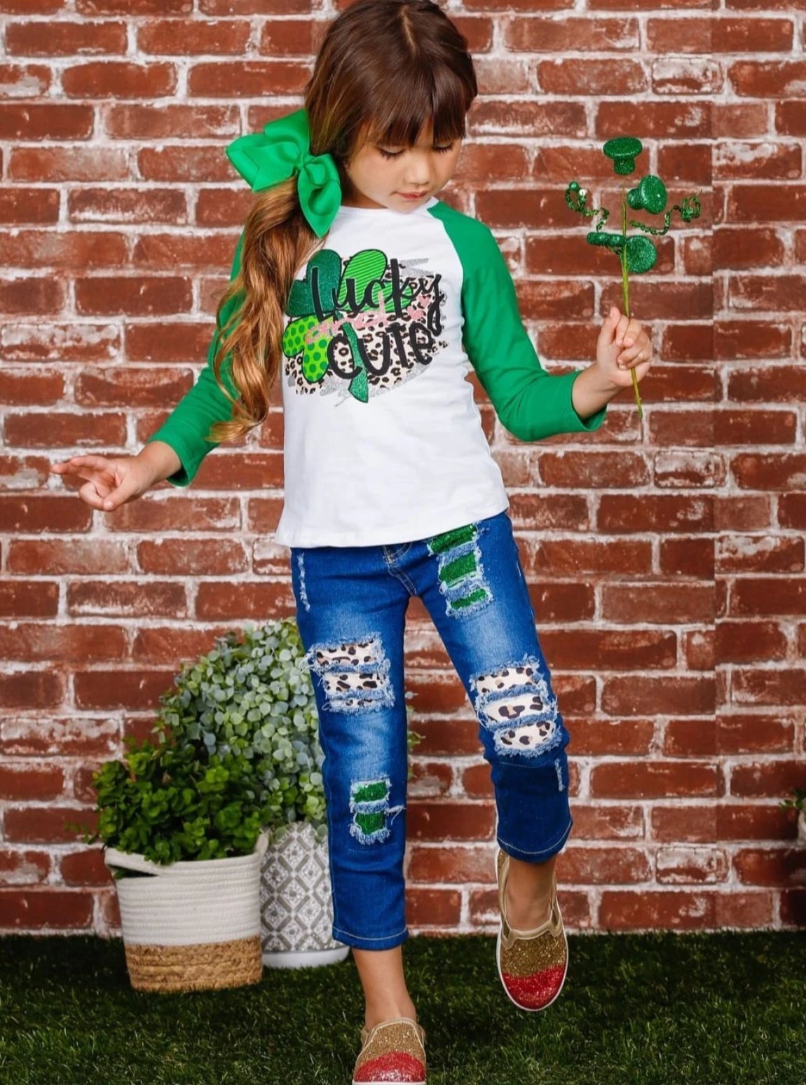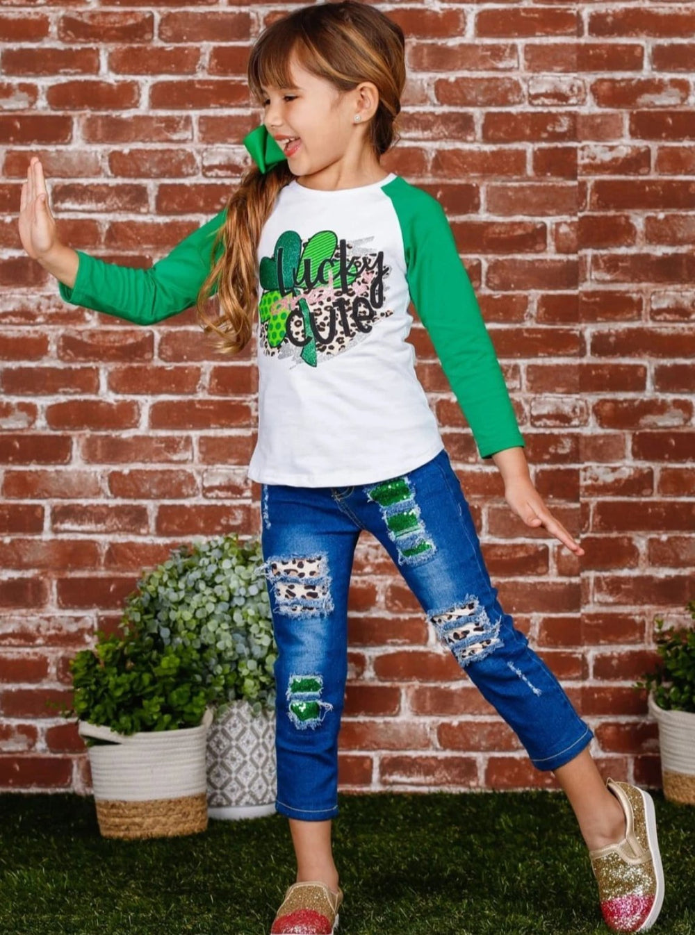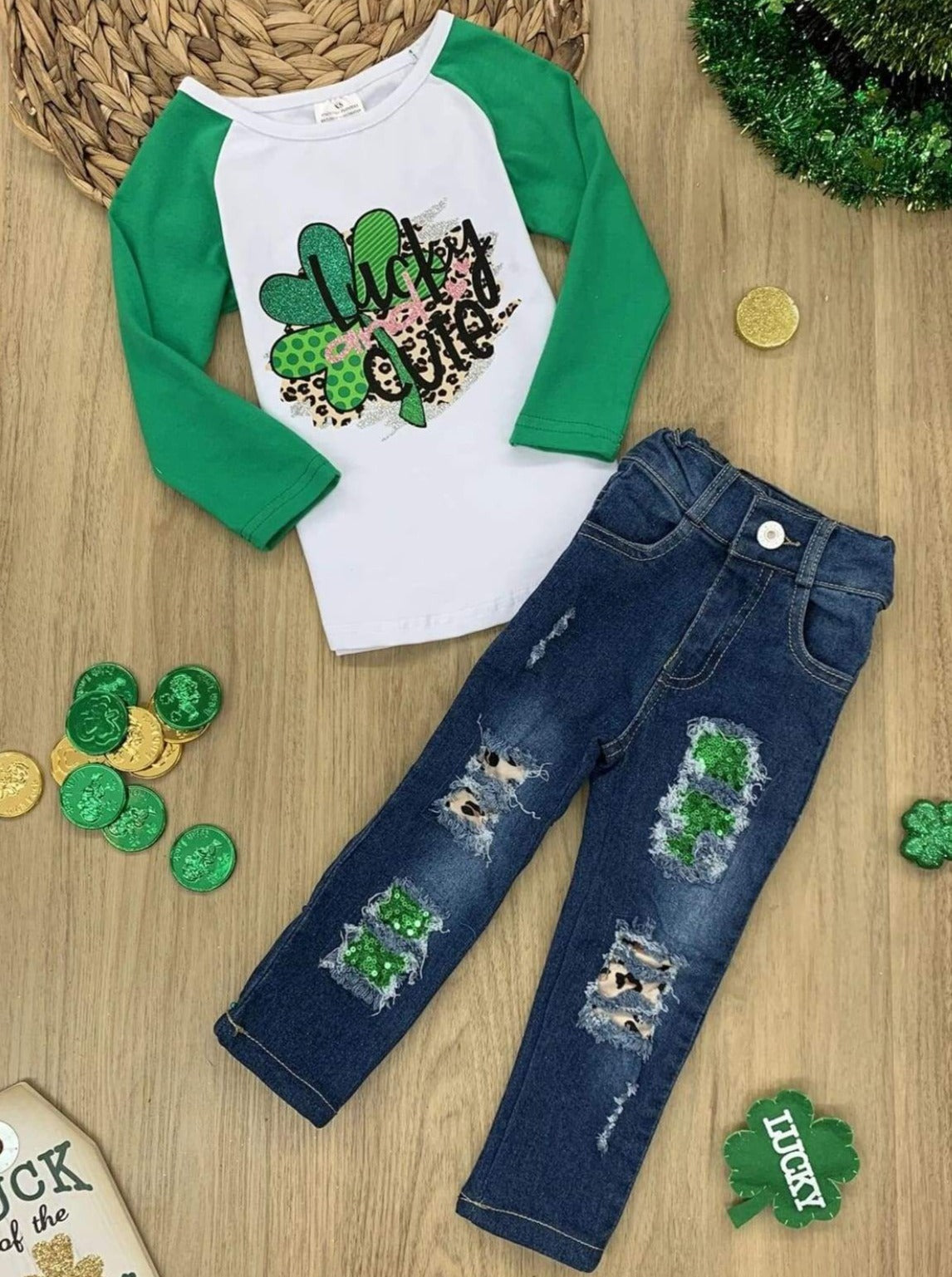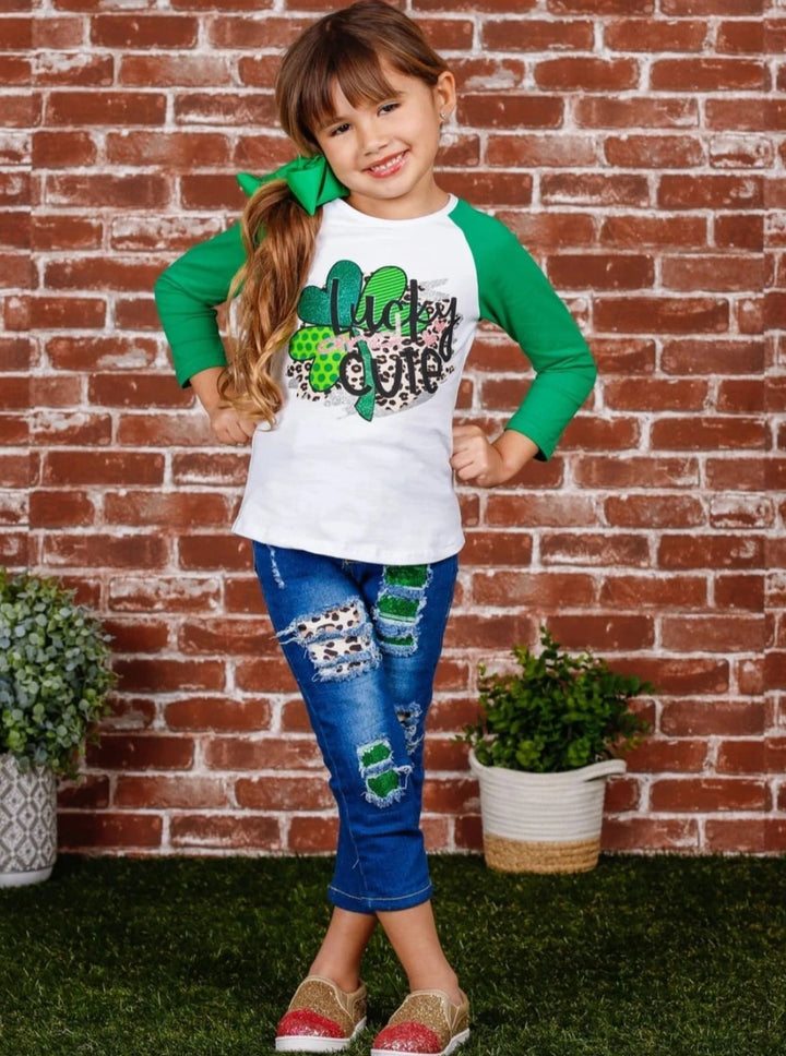 Raglan top design with a "Lucky and Cute" clover graphic enhanced with glitter and leopard print; ripped jeans feature sequin and leopard print fabric patches