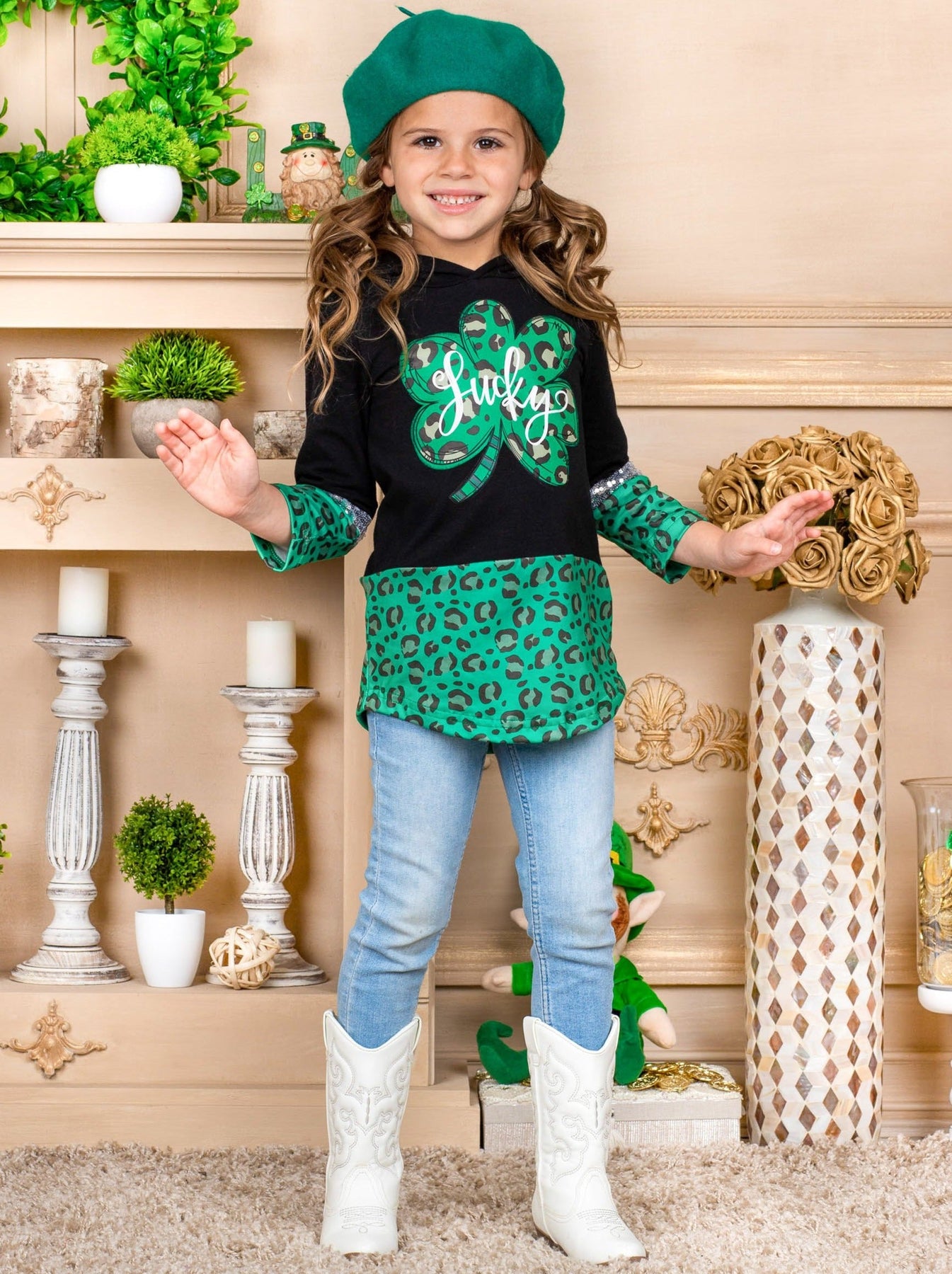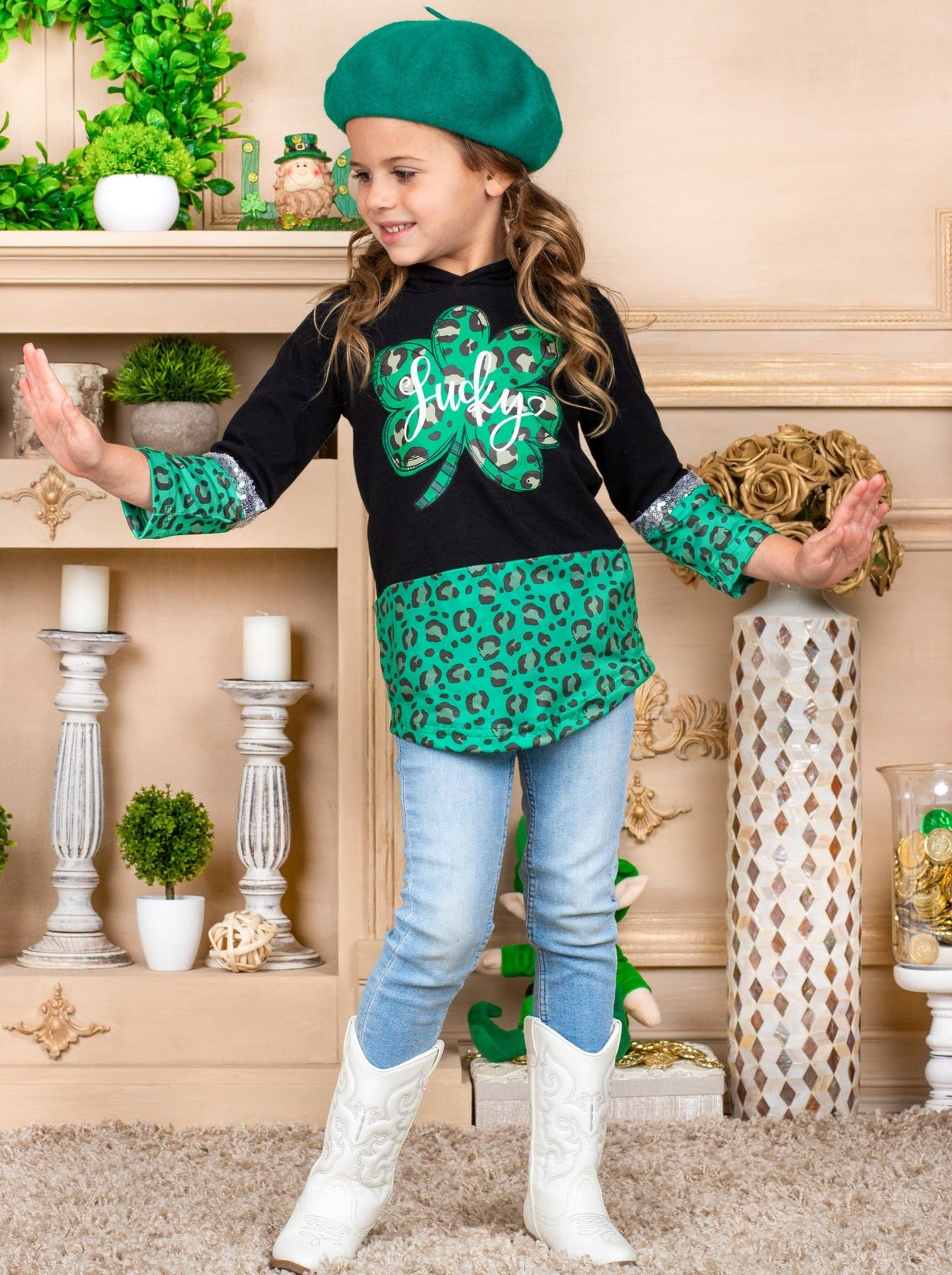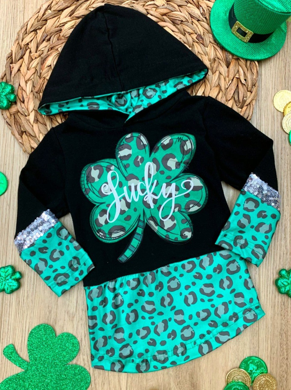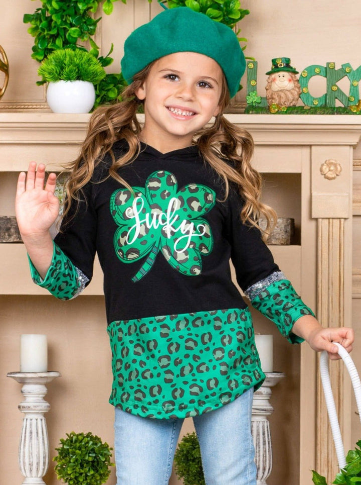 Keep all that charming cuteness under your hood with an adorable green leopard print-lined, color-blocked pullover hoodie. Perfect for chilly days that could use a little luck, sparkly sequins, and clover magic. Layer over her favorite top and jeans to complete the look.