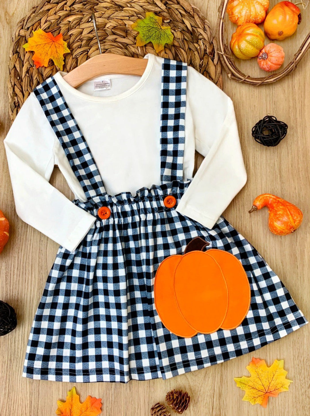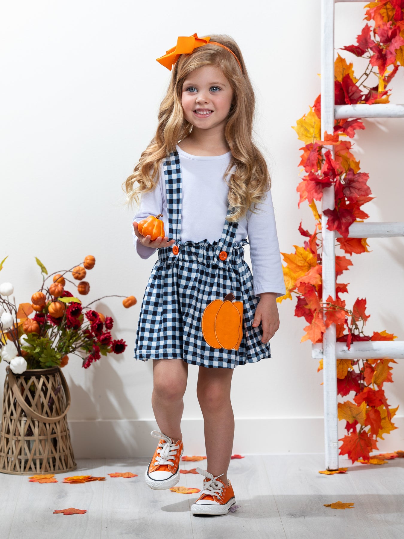 - (Pumpkin) Spice up your little girl's fall wardrobe with this precious plaid overall skirt set. Preppy chic mixed with simple style for a casual outfit she'll love wearing all season long.