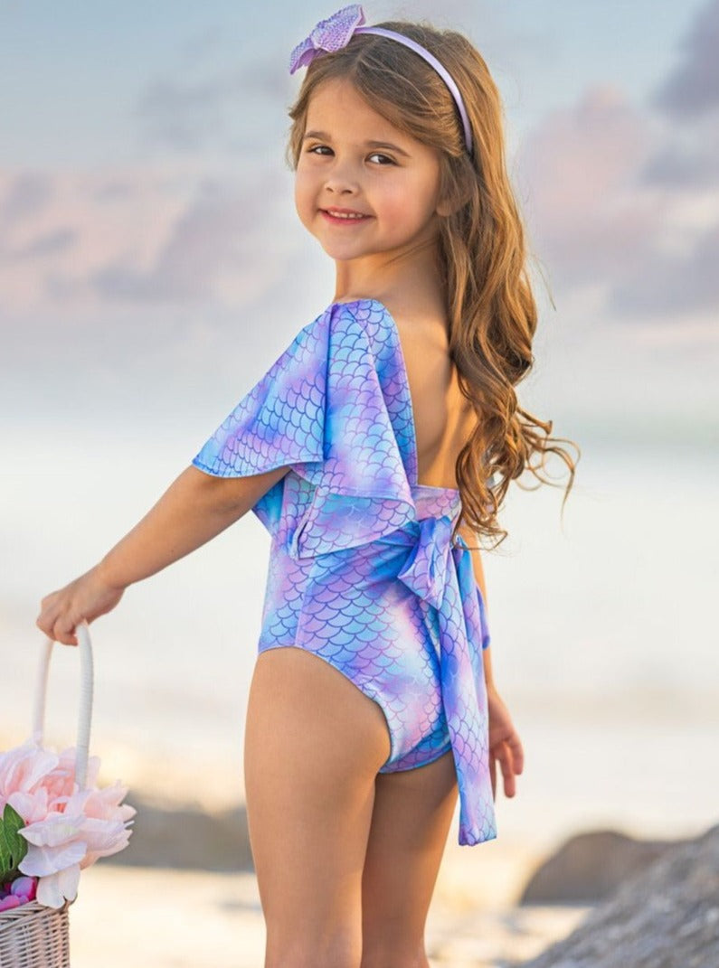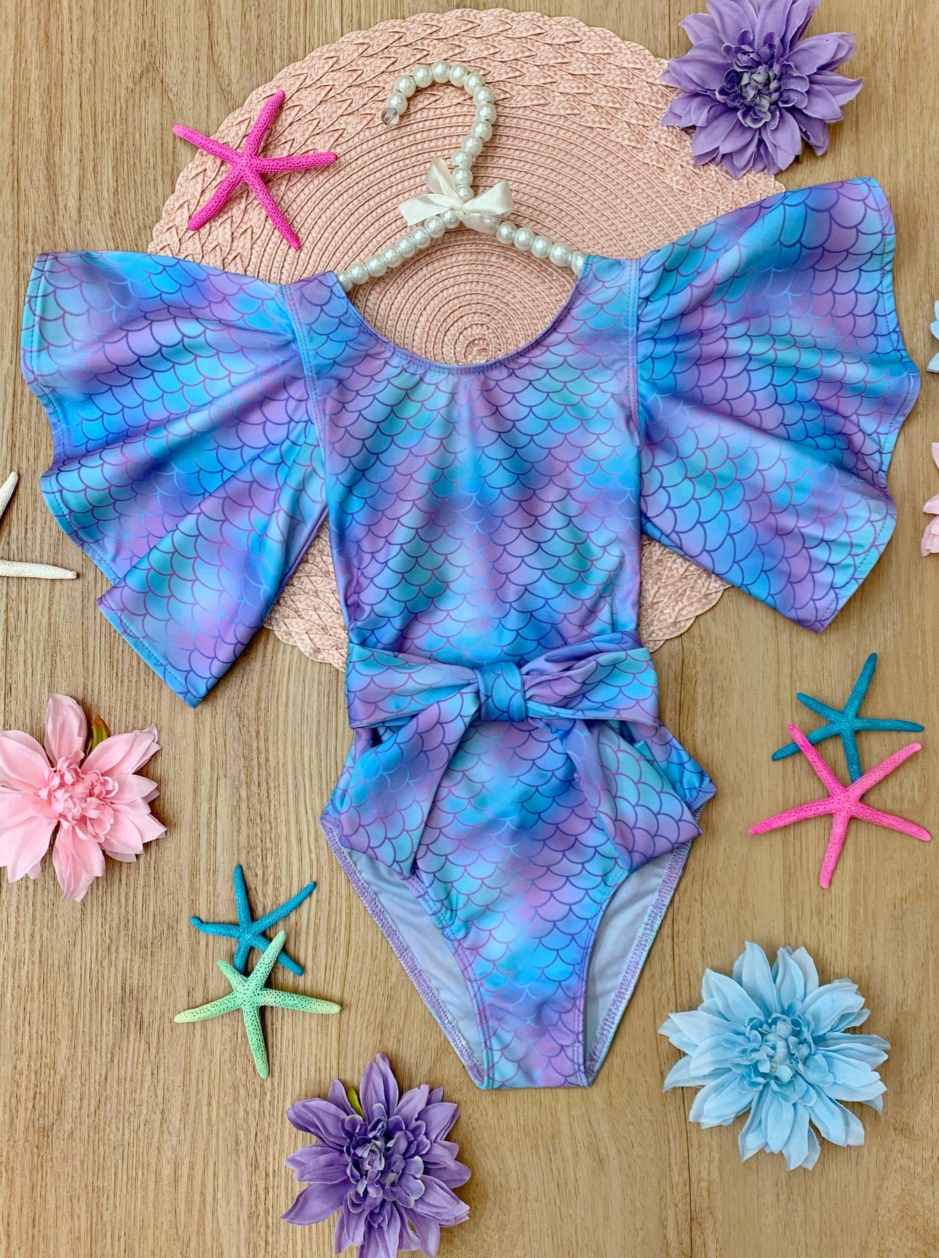 • Ocean vibes and high tides call for our fin-tastic flare sleeve one-piece swimsuit. The vibrant purple and blue mermaid scales will have your sweet swimmer slaying the 7 seas with a fashionable flair. And the adjustable waist tie creates an even cuter shape for your mini!