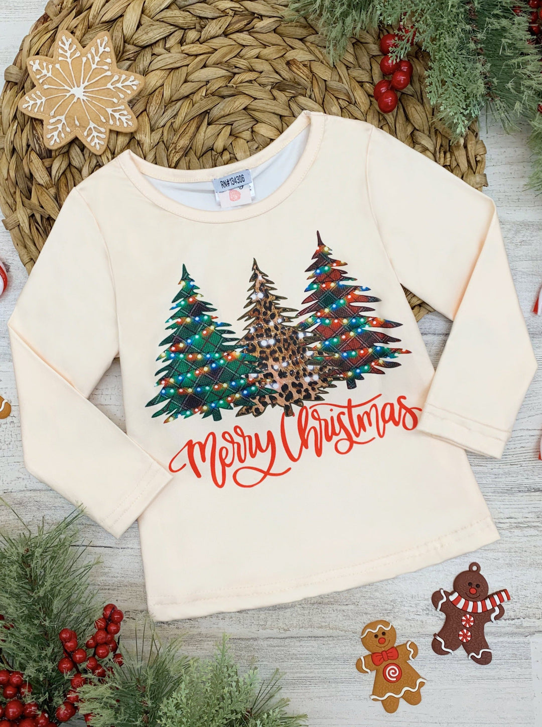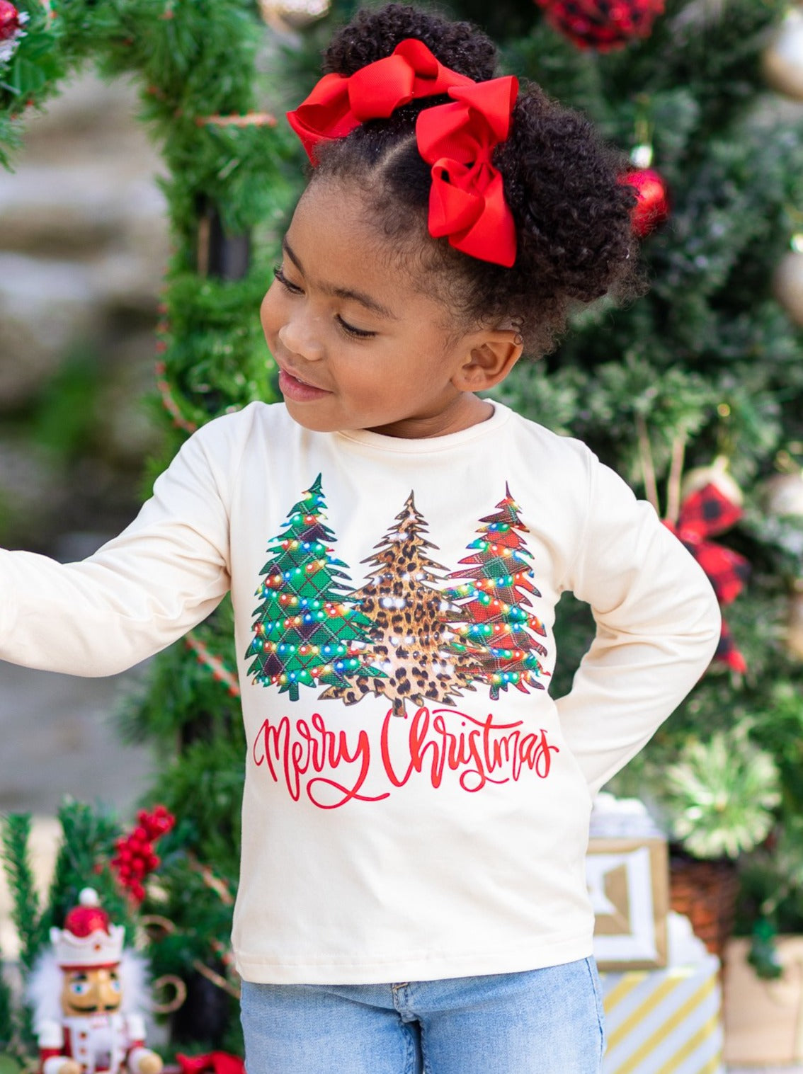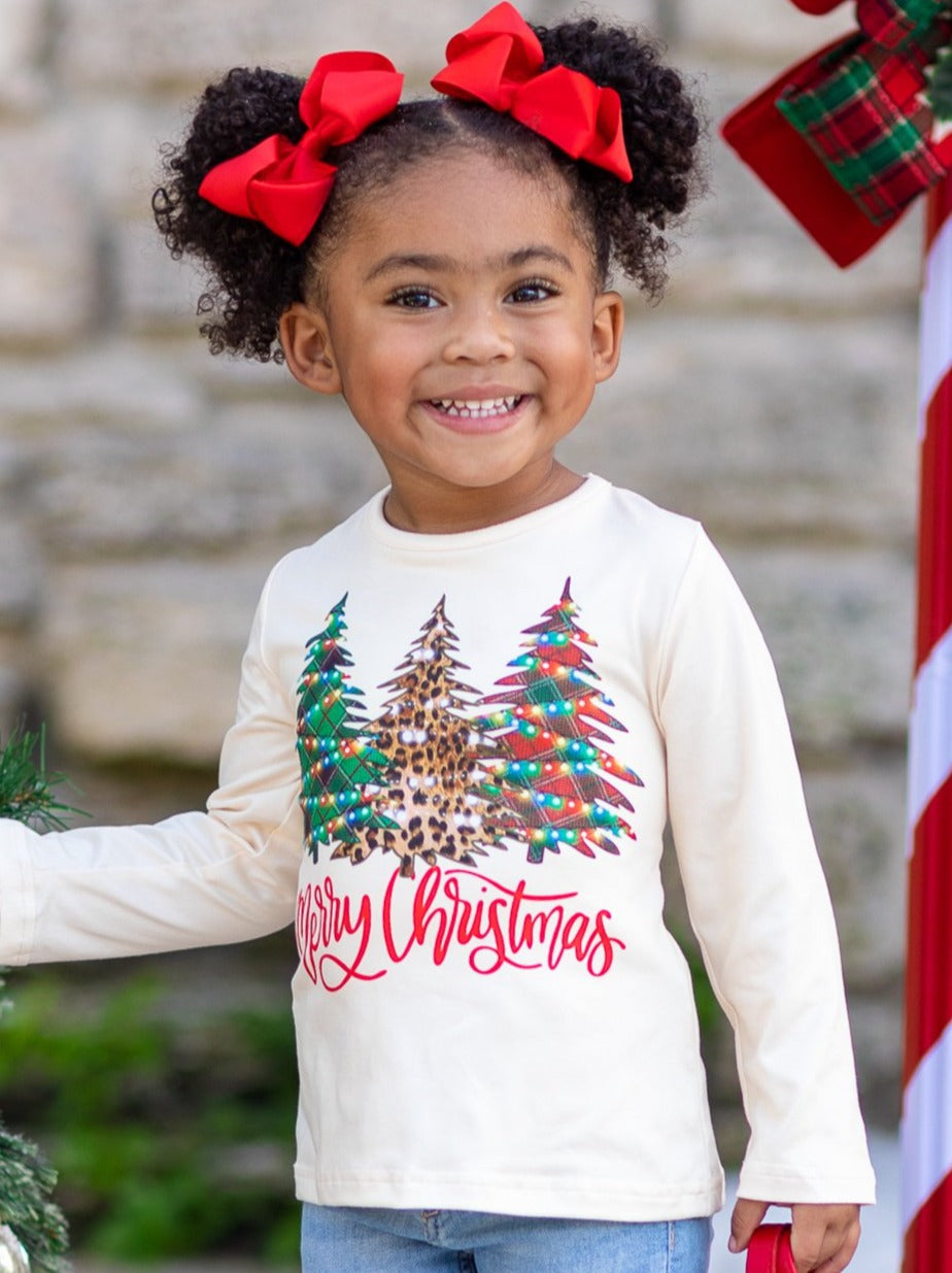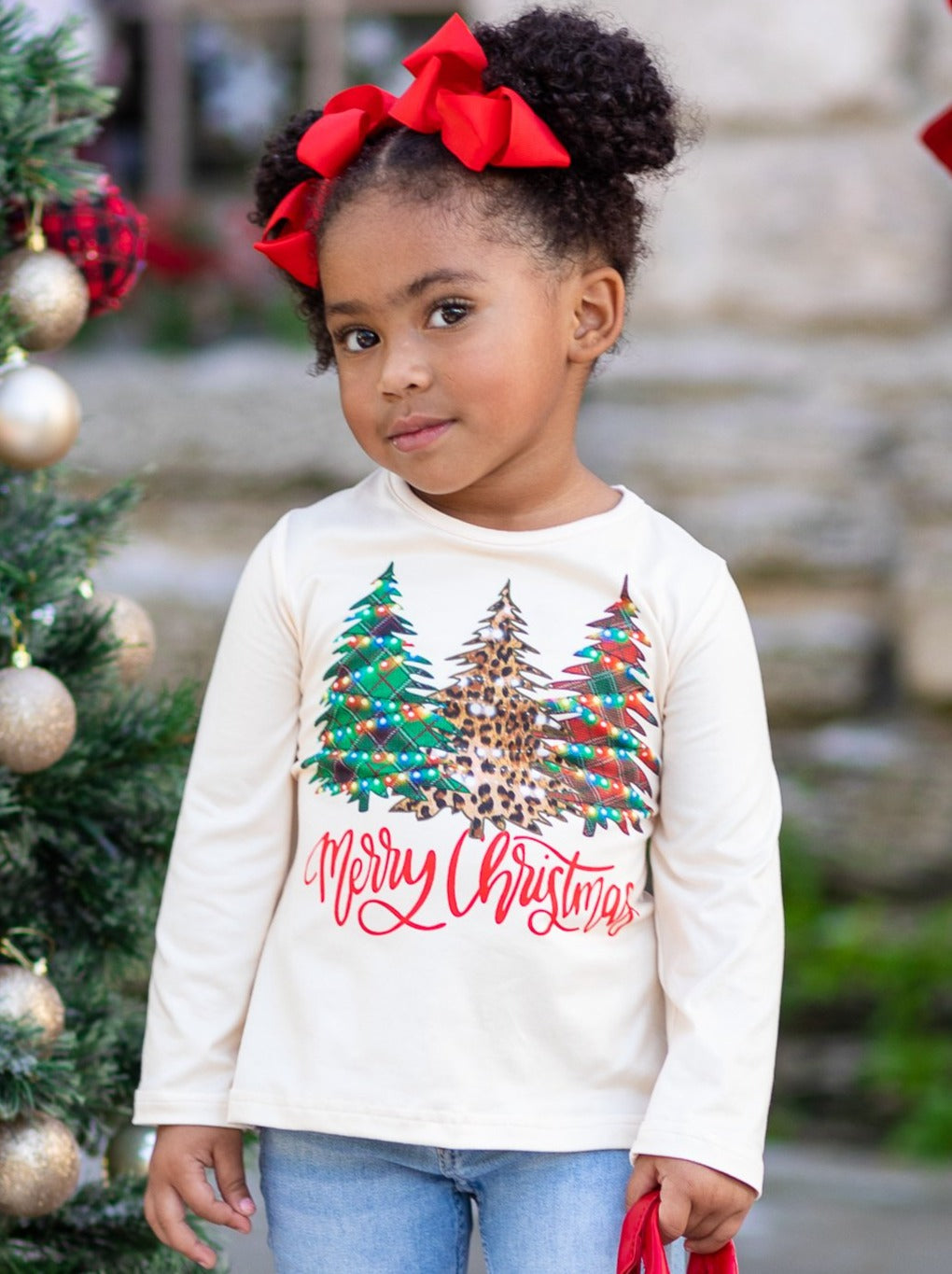 Looking to add a little Christmas magic to your sugarplum's closet? Get her this sweet long-sleeve graphic tee. Delightful Christmas trees dazzle with plaid and leopard print patterns and cheerful font below