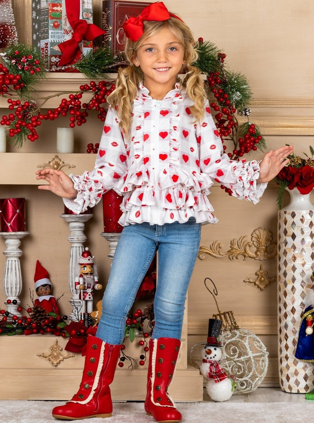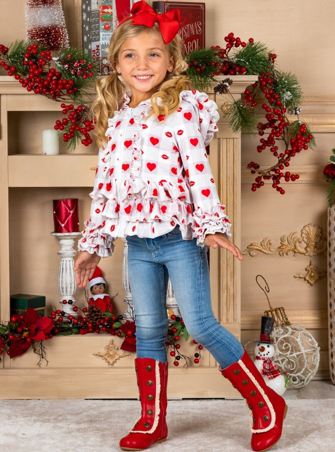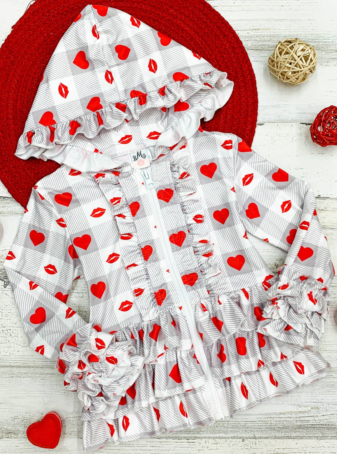 - Hearts and kisses are raining down their cuteness on this adorable plaid ruffle hoodie. Keeps her chic, cozy, and ready for any weather!