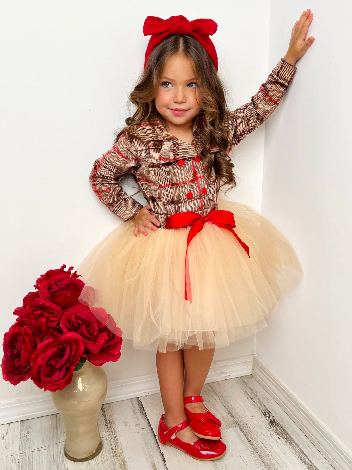 Long-sleeve tutu dress with plaid button-down blazer-style bodice and gathered tulle skirt topped with red satin bow