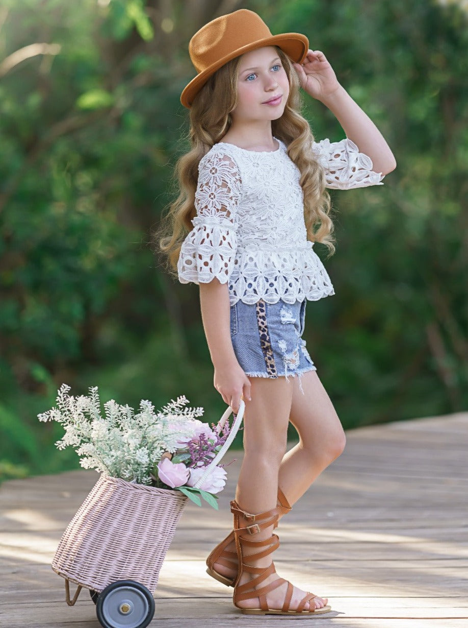 Summer cuteness, here we come! Stay cool while heating up the season in this adorable denim shorts set perfect for your little lady. She'll be best dressed in an eyelet ruffle top and leopard-lined shorts. Don't wait; get it now!