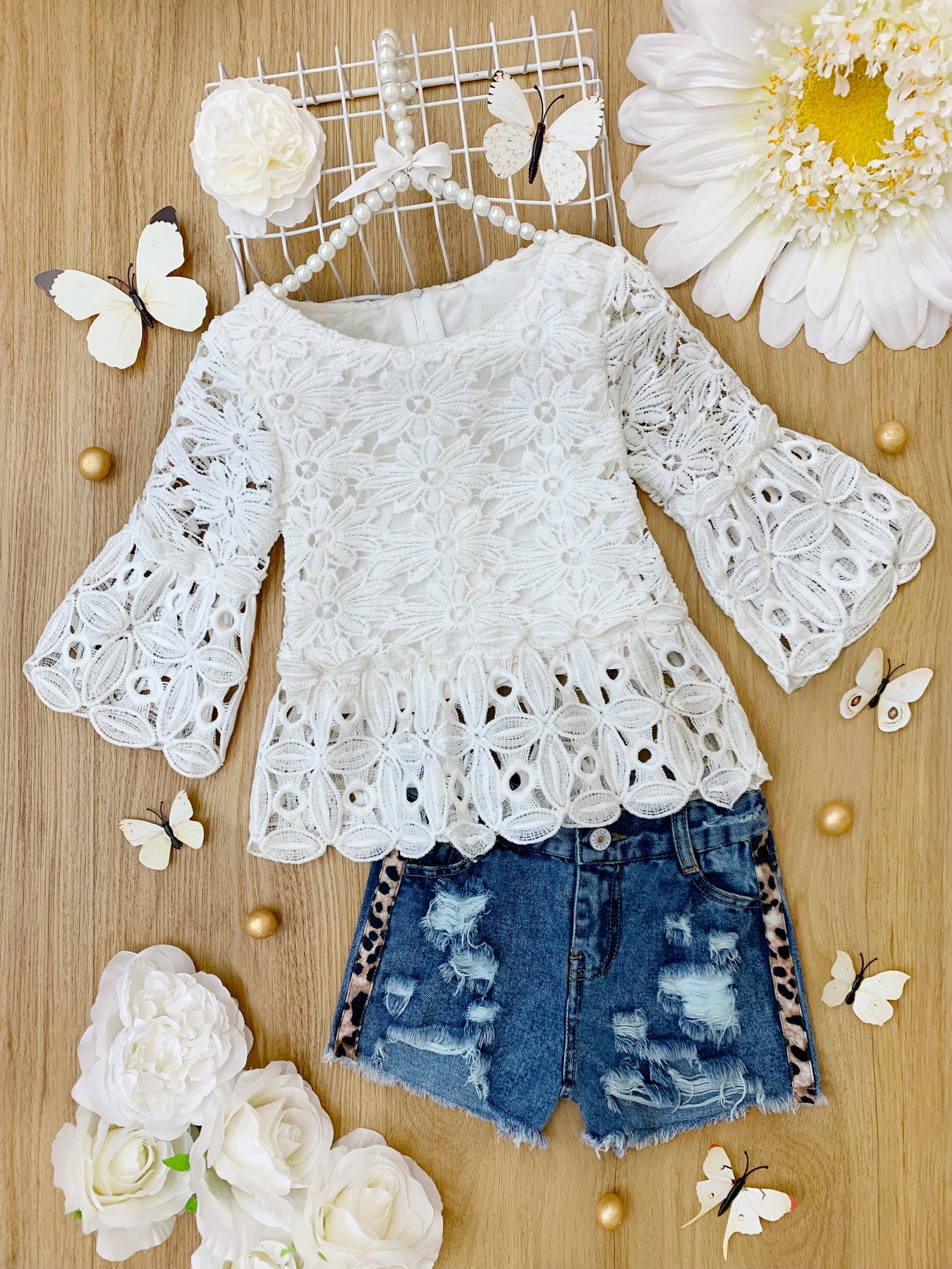 The set features a half-sleeved eyelet lace top and distressed leopard-print lined denim shorts
