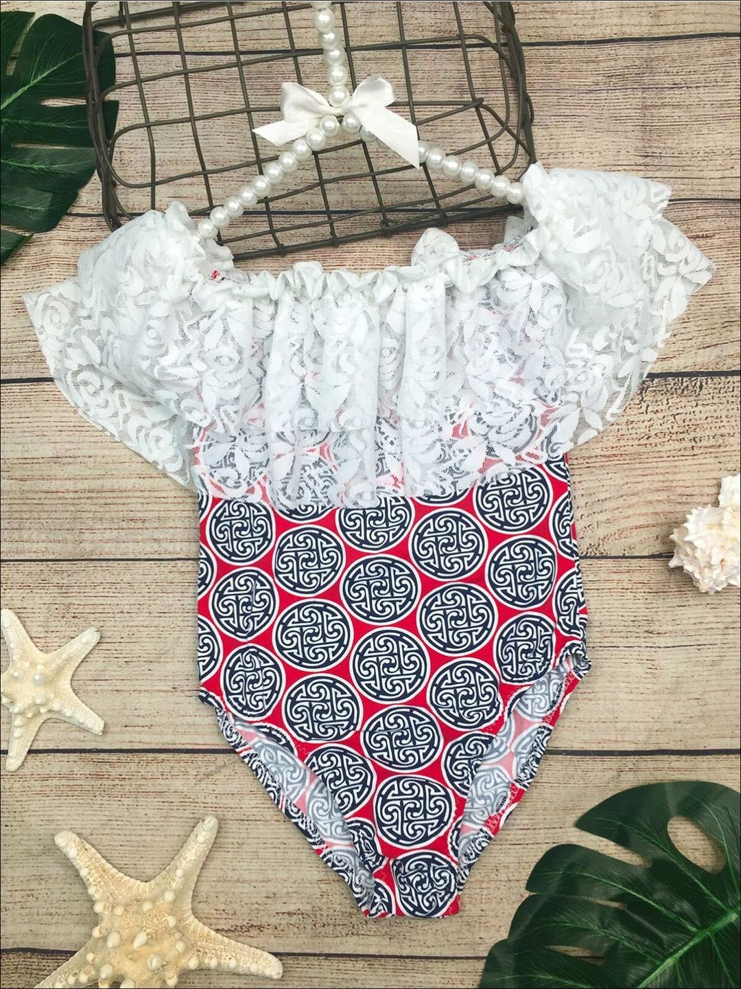 One-piece off-shoulder swimsuit with geometric print and large lace bib