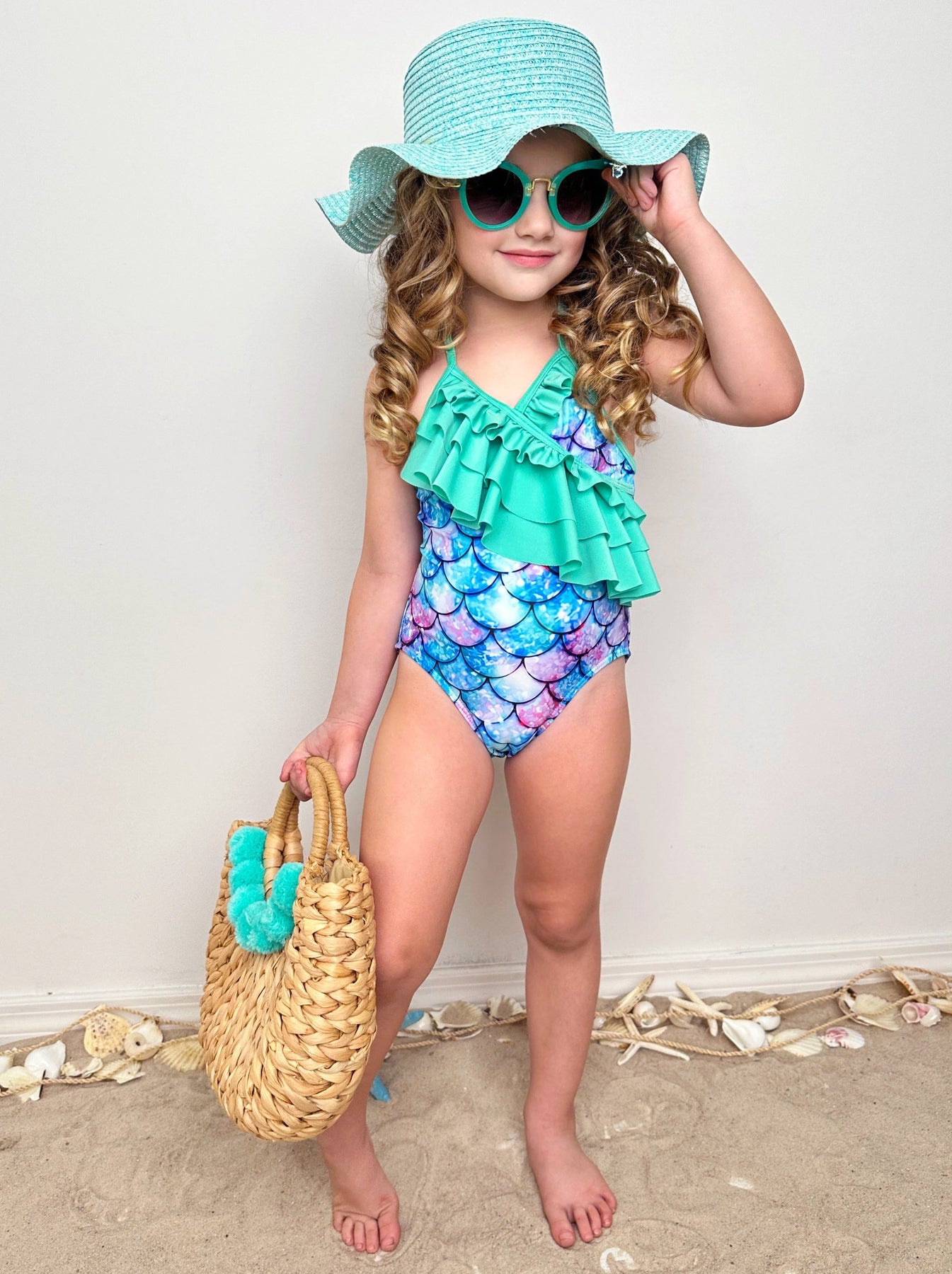 Makin' waves, mermaid style! Our mermaid print one-piece swimsuit is sure to make your little one's vacay a lot more memorable. Cute pastels and a ruffle accent make this a totally enchanting look for your sea princess.