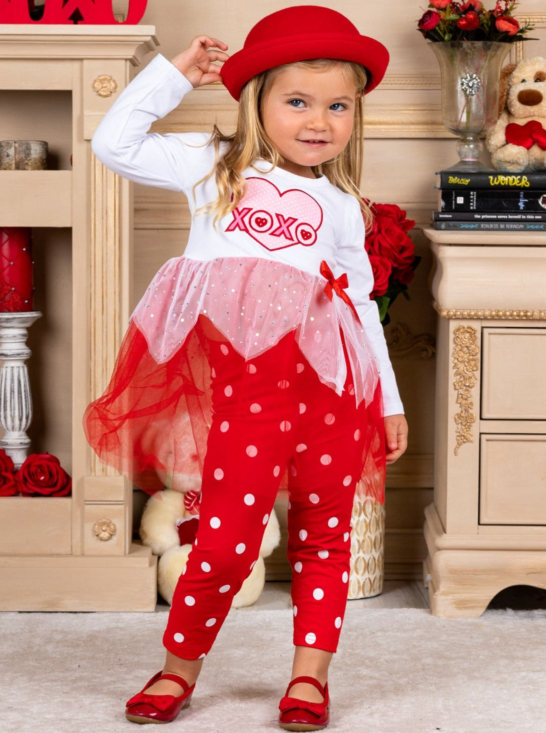 Long-sleeve XOXO layered tulle tunic and polka dot leggings
