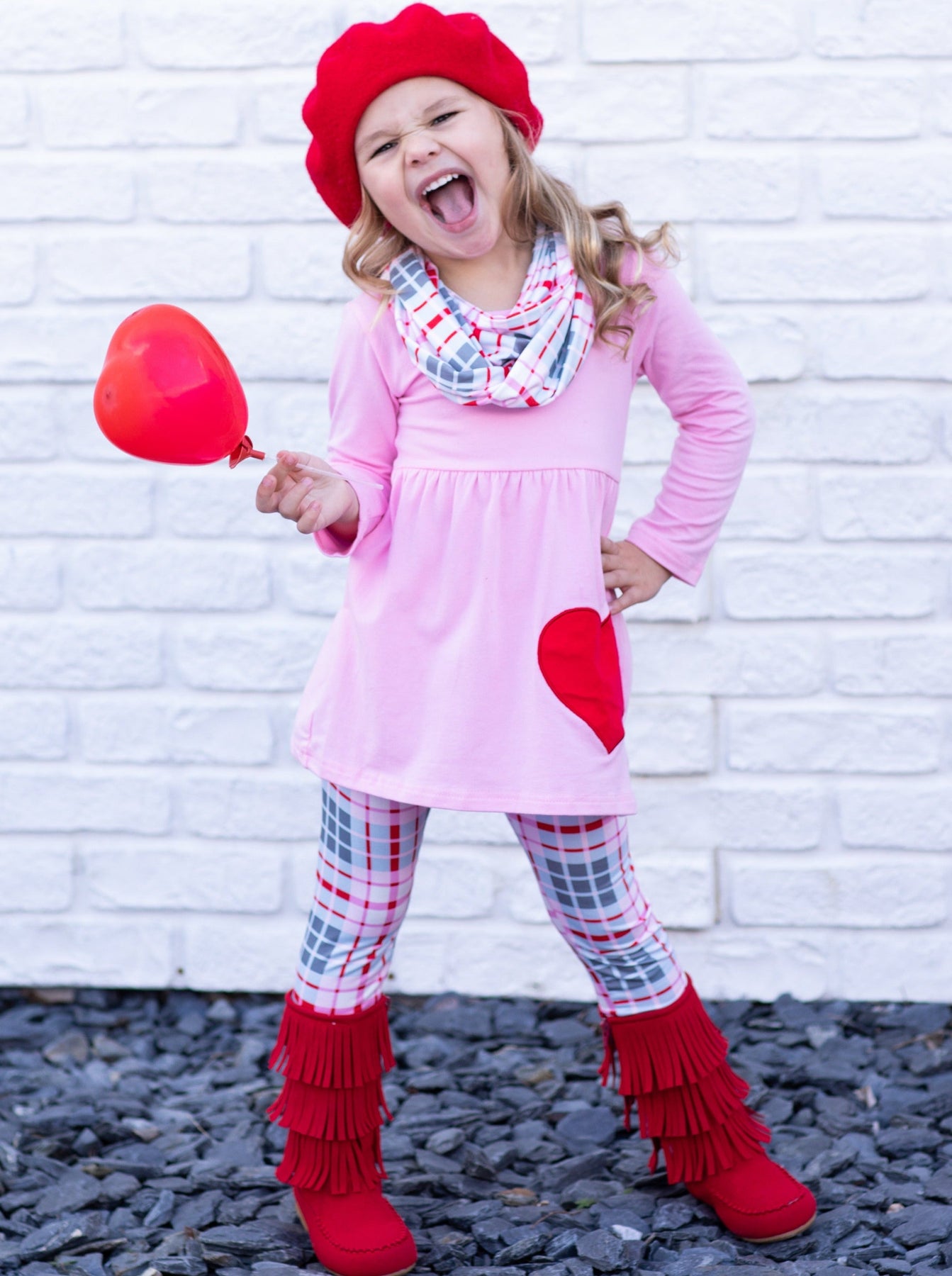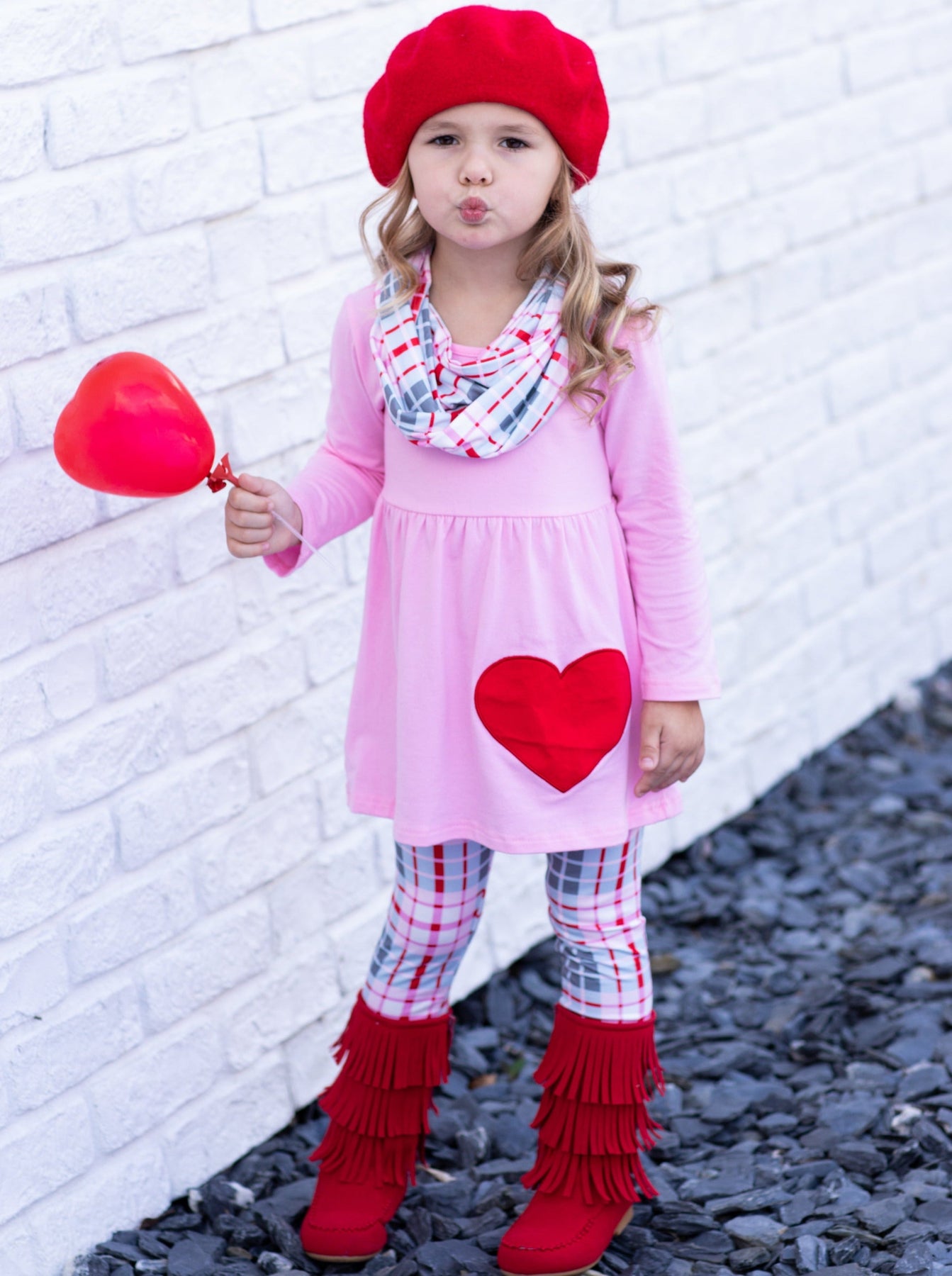 Toddlers Valentine's Outfits | Heart Tunic, Plaid Scarf & Legging Set
