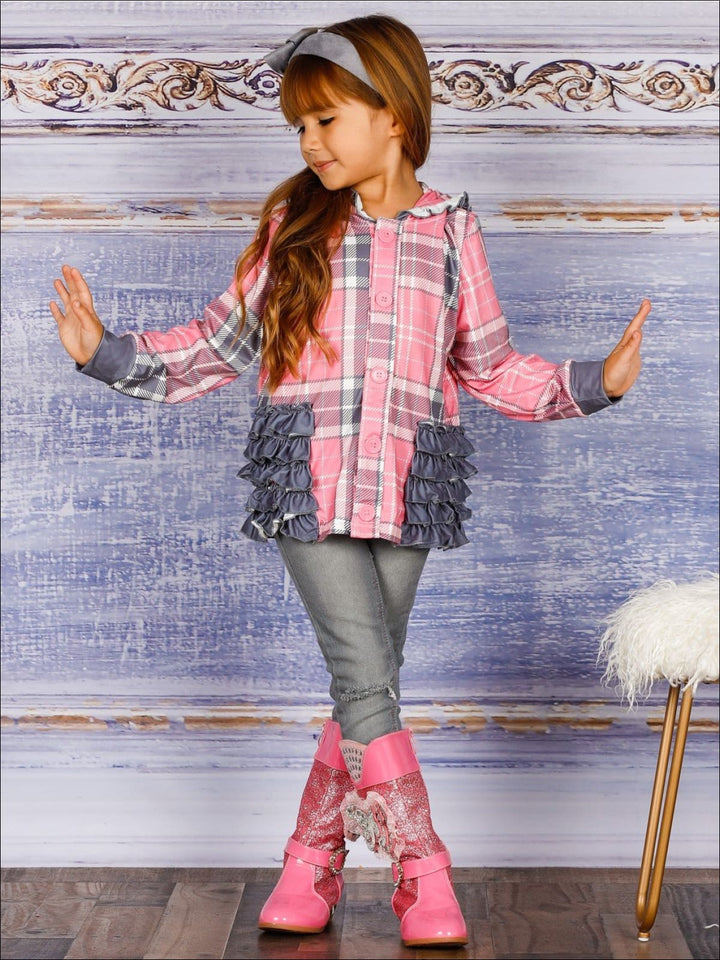 We are living for the precious plaid colors and fancy ruffle details in this button-down hoodie cardigan. Just the thing to style up your diva's everyday wardrobe!