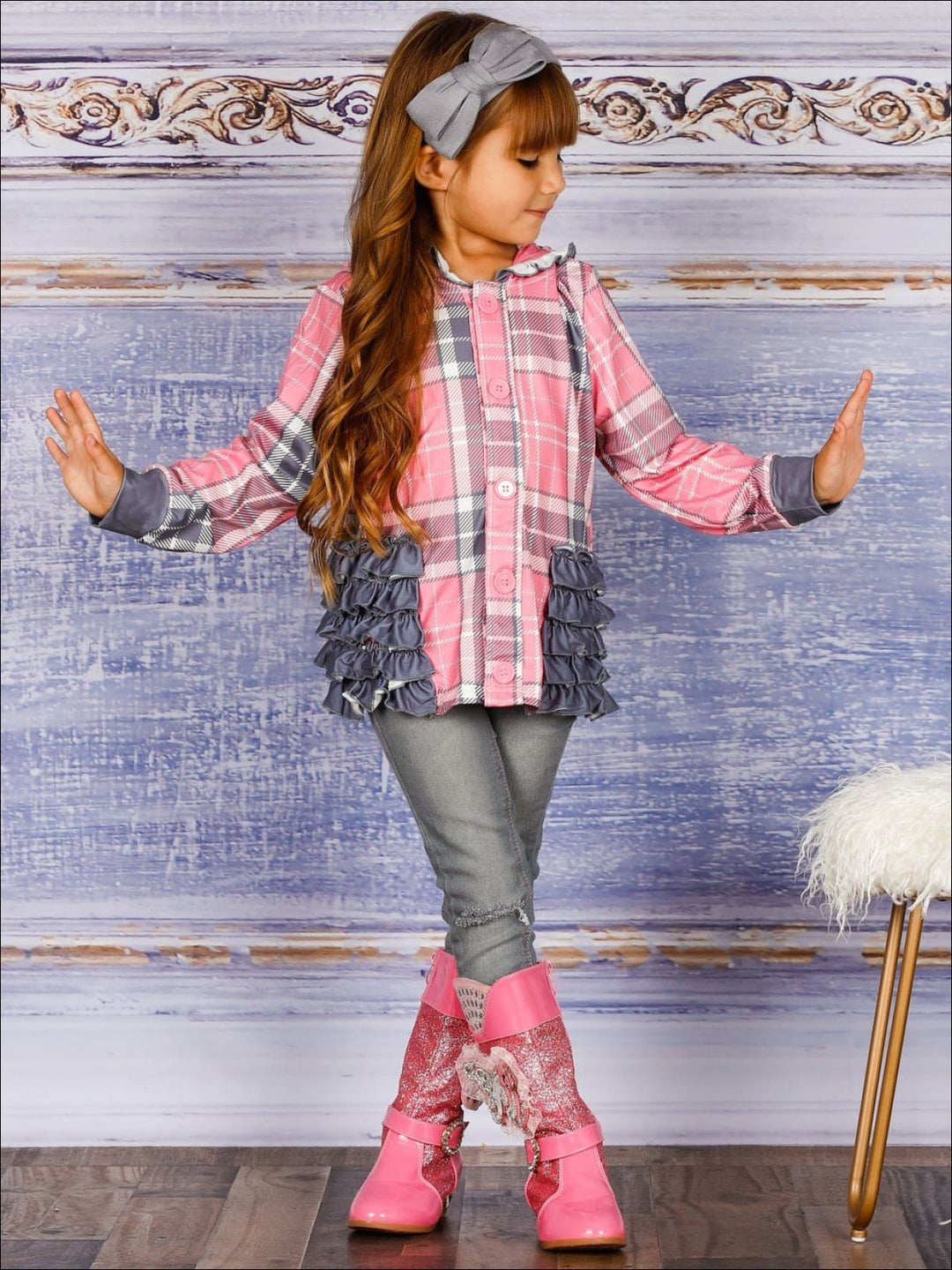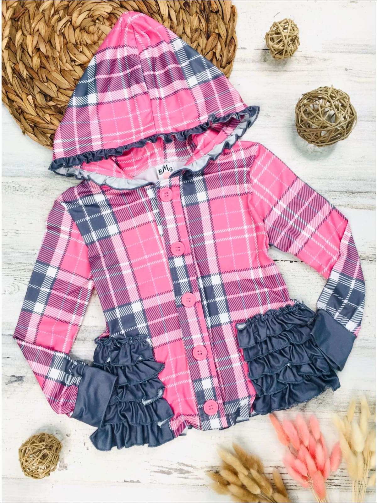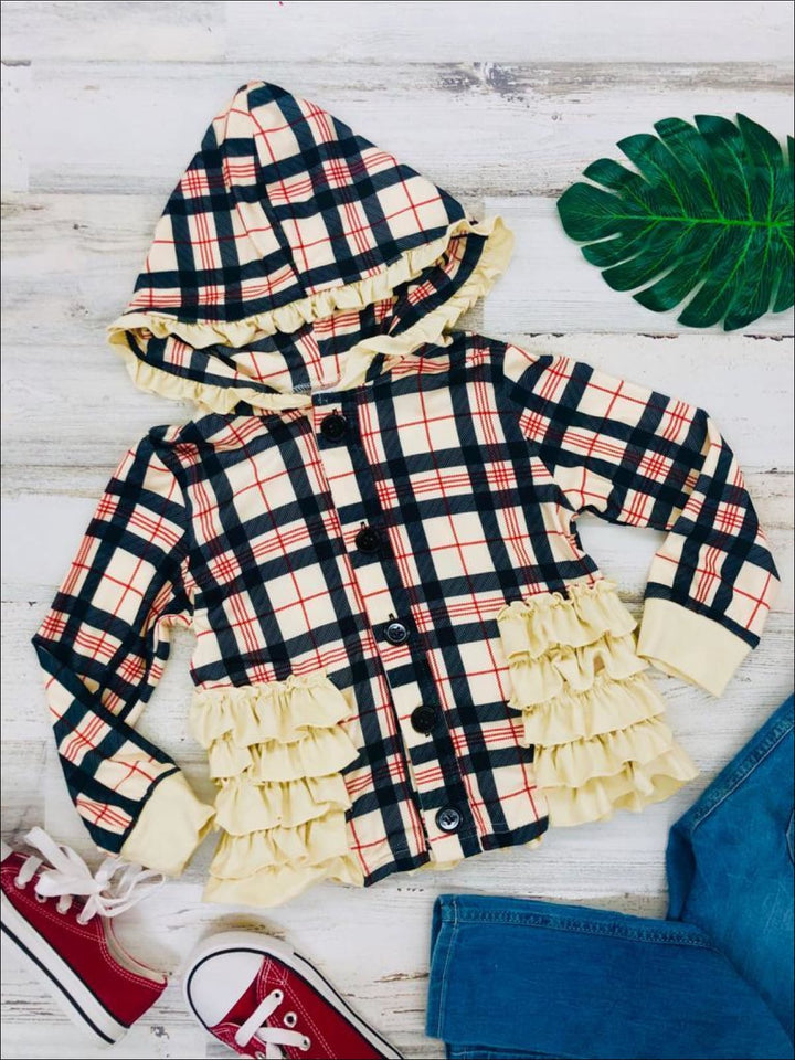 Plaid long-sleeve button-down ruffle hooded cardigan with hood, side, and back ruffles