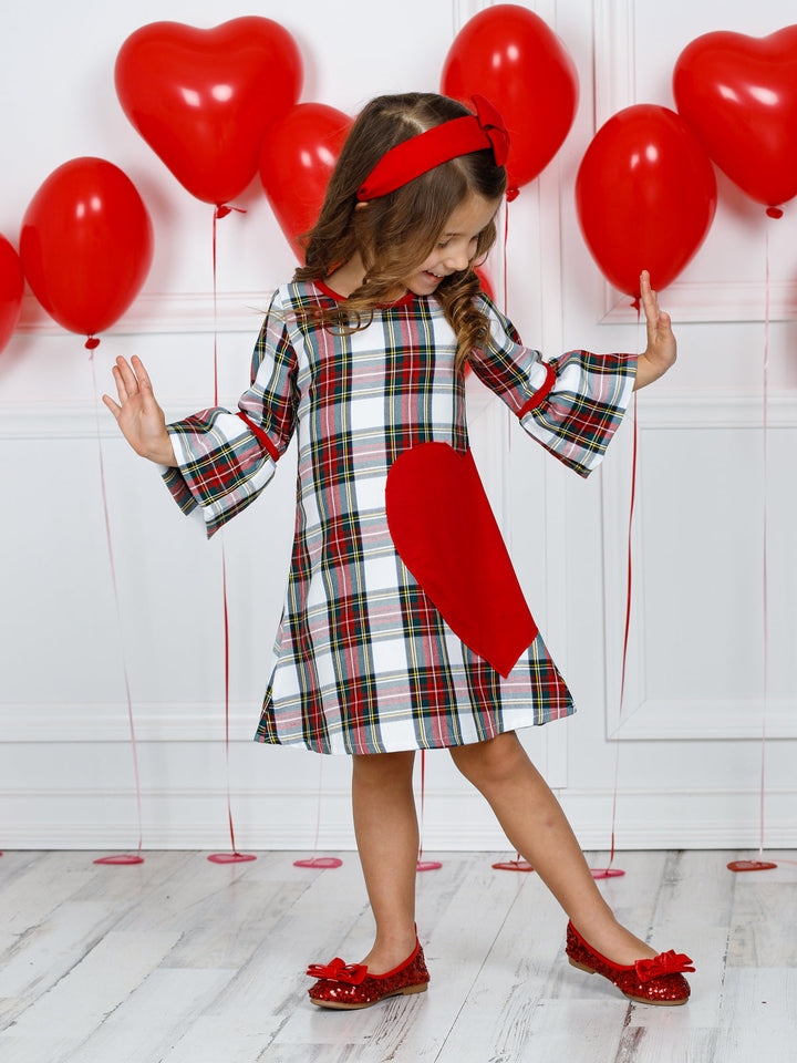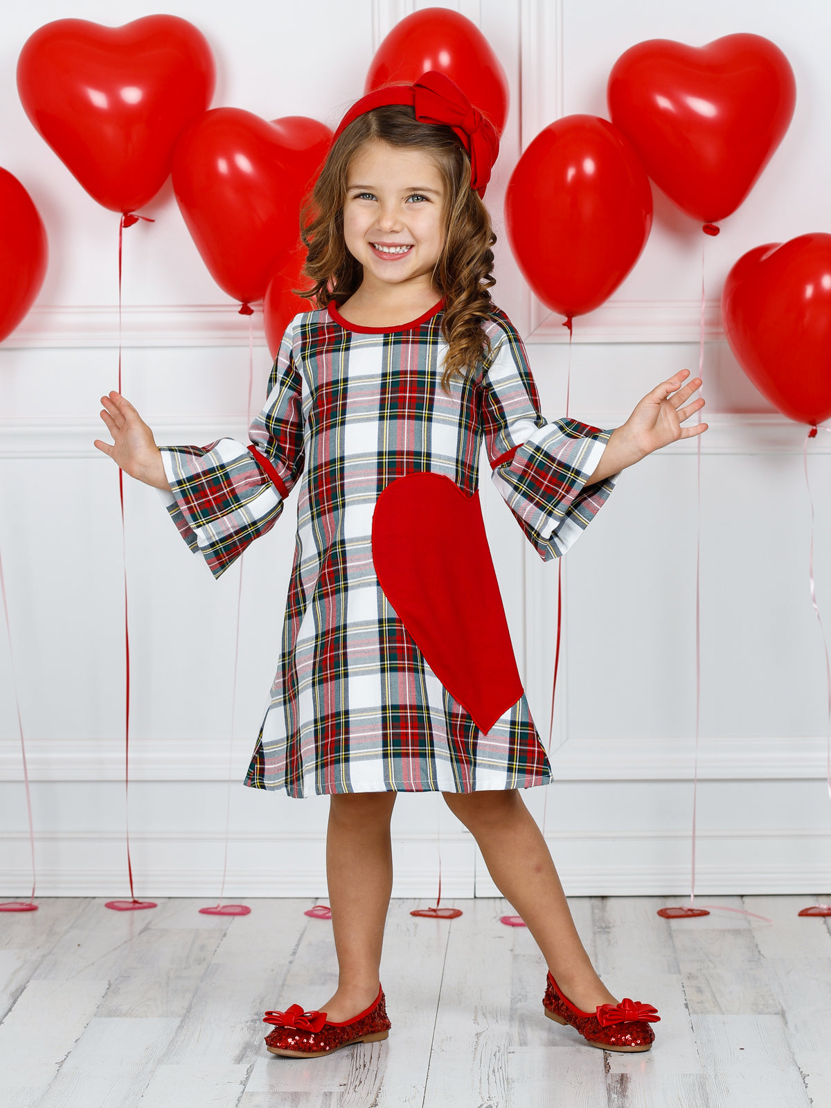 Girls Valentine's Day Dress | Plaid Bell Sleeve Heart Applique Dress