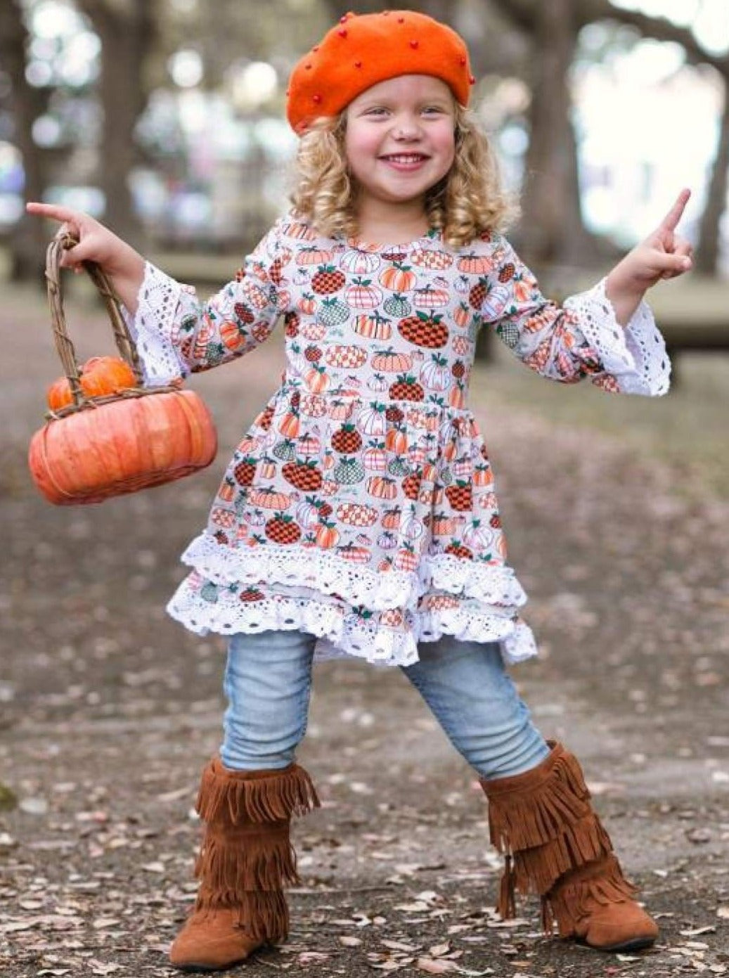 - Your little pumpkin is going to look scrumptious in this precious tiered tunic that screams fall! Different printed pumpkins and crochet details create a boho-chic look to ensure she's ready for anything!