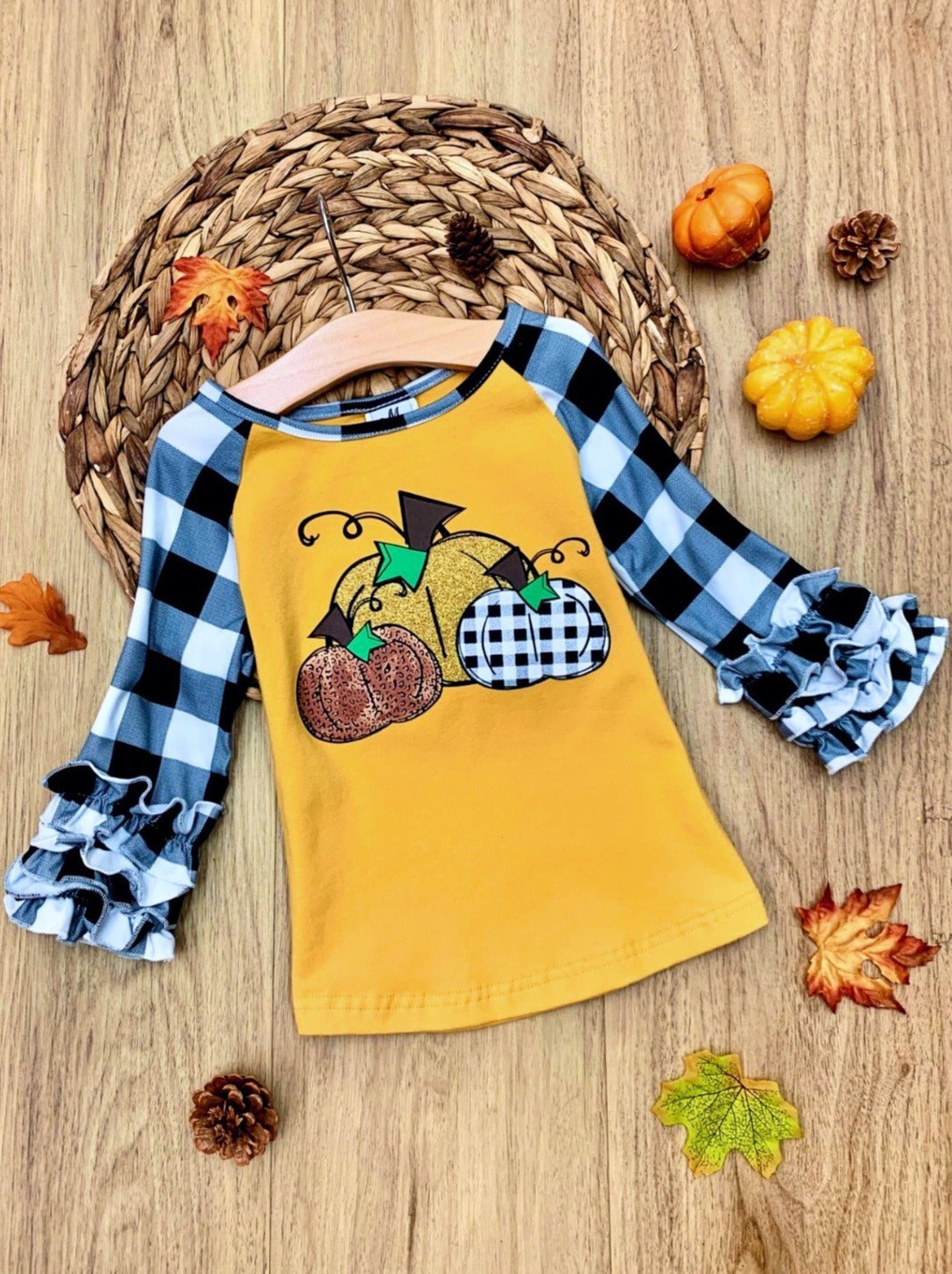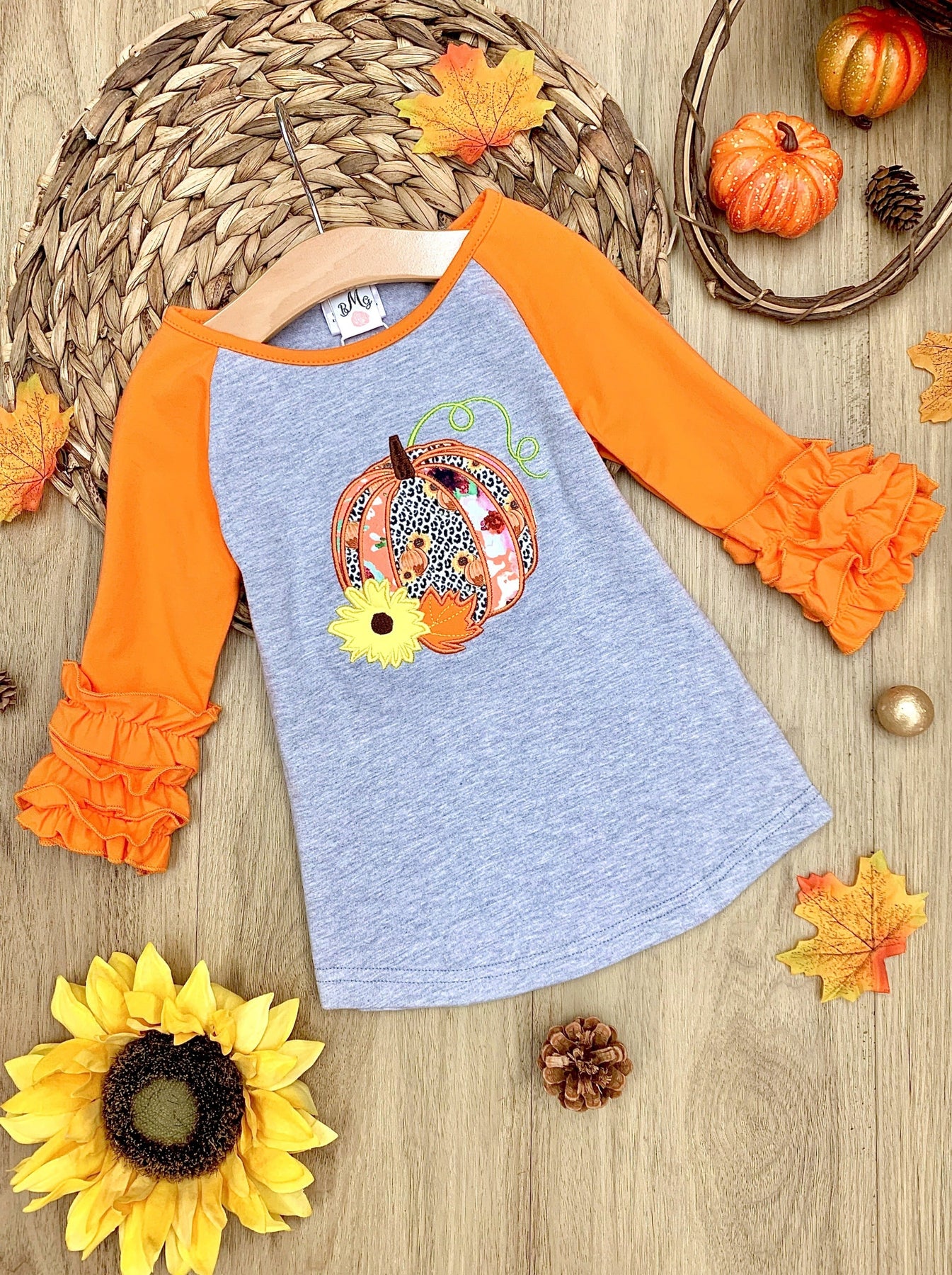 Girls Cute Fall Pumpkin Print Ruffled Raglan Top - Mia Belle Girls