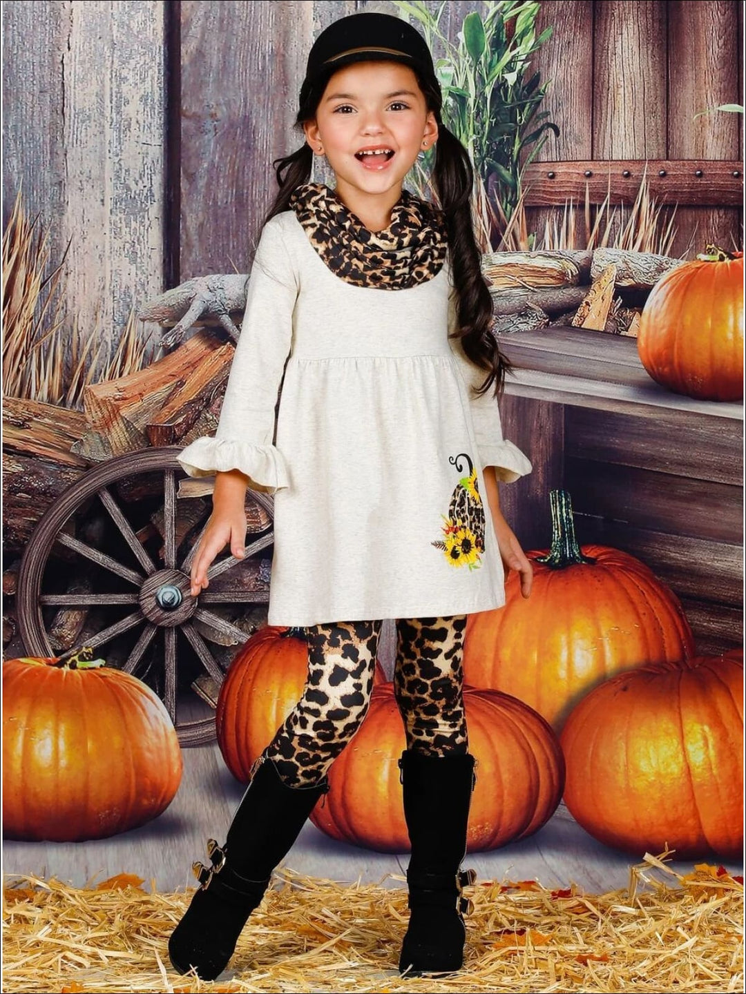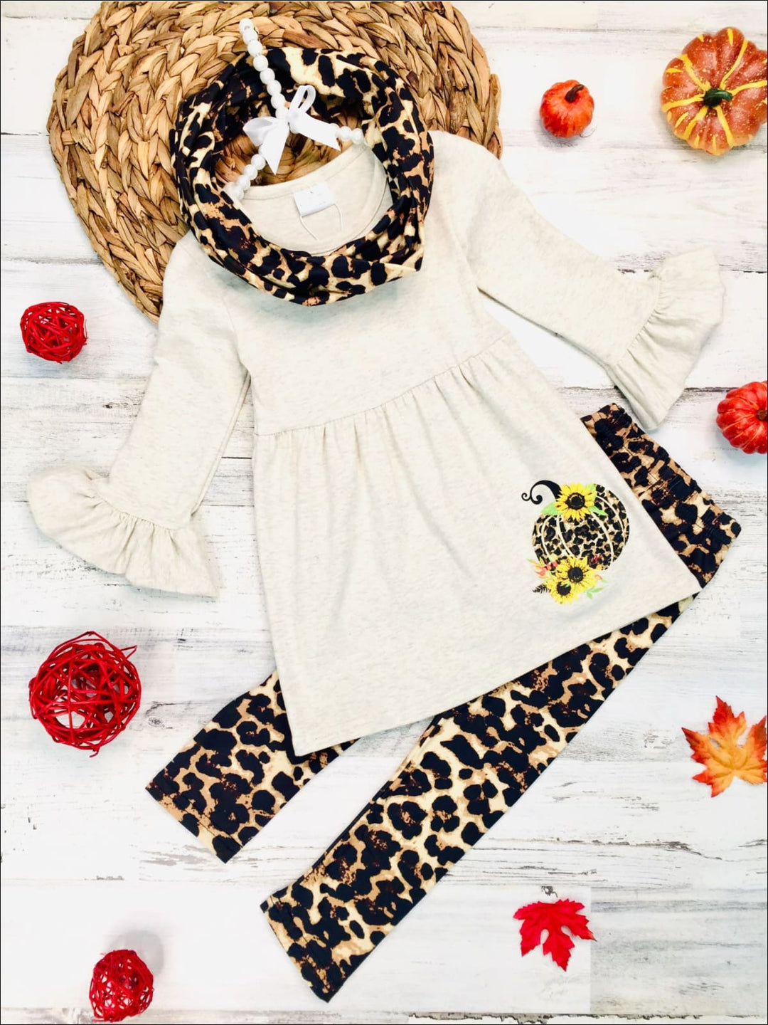 Girls Pumpkin Sunflower Print Long Ruffled Sleeve Top, Animal Print Leggings And Scarf Set