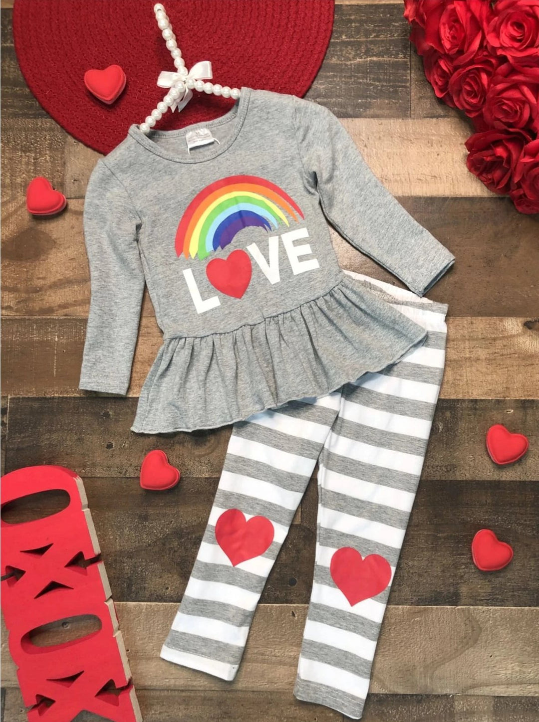 Girls Rainbow "Love" Peplum Top and Striped Heart Legging Set