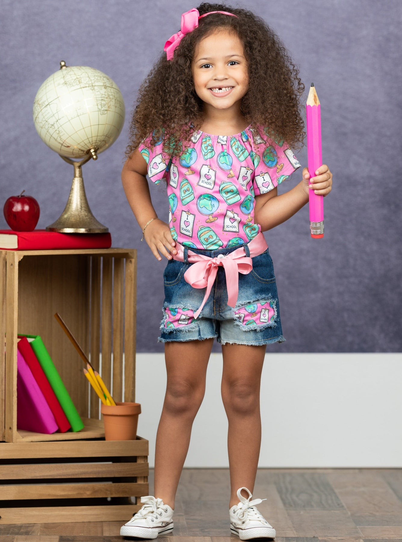 - Ruffle sleeve top with school-themed print and matching patched denim shorts