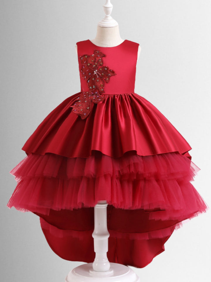 Sleeveless hi-lo dress with sequin floral applique satin bodice and peplum hi-lo train, tiered ruffle tulle skirt, and large back bow
