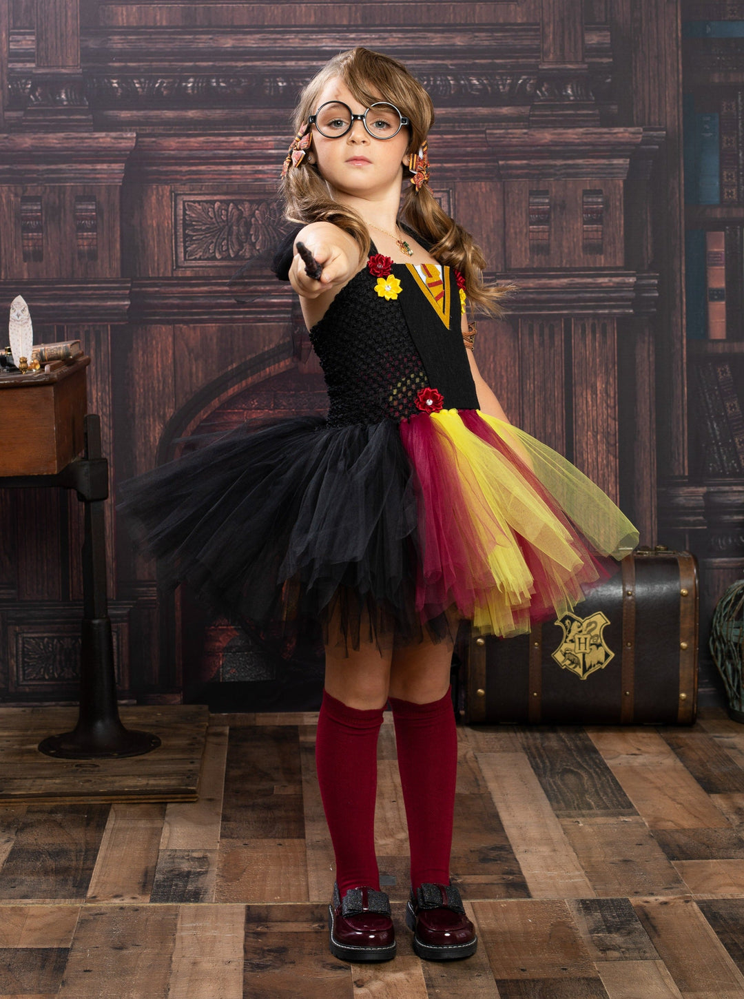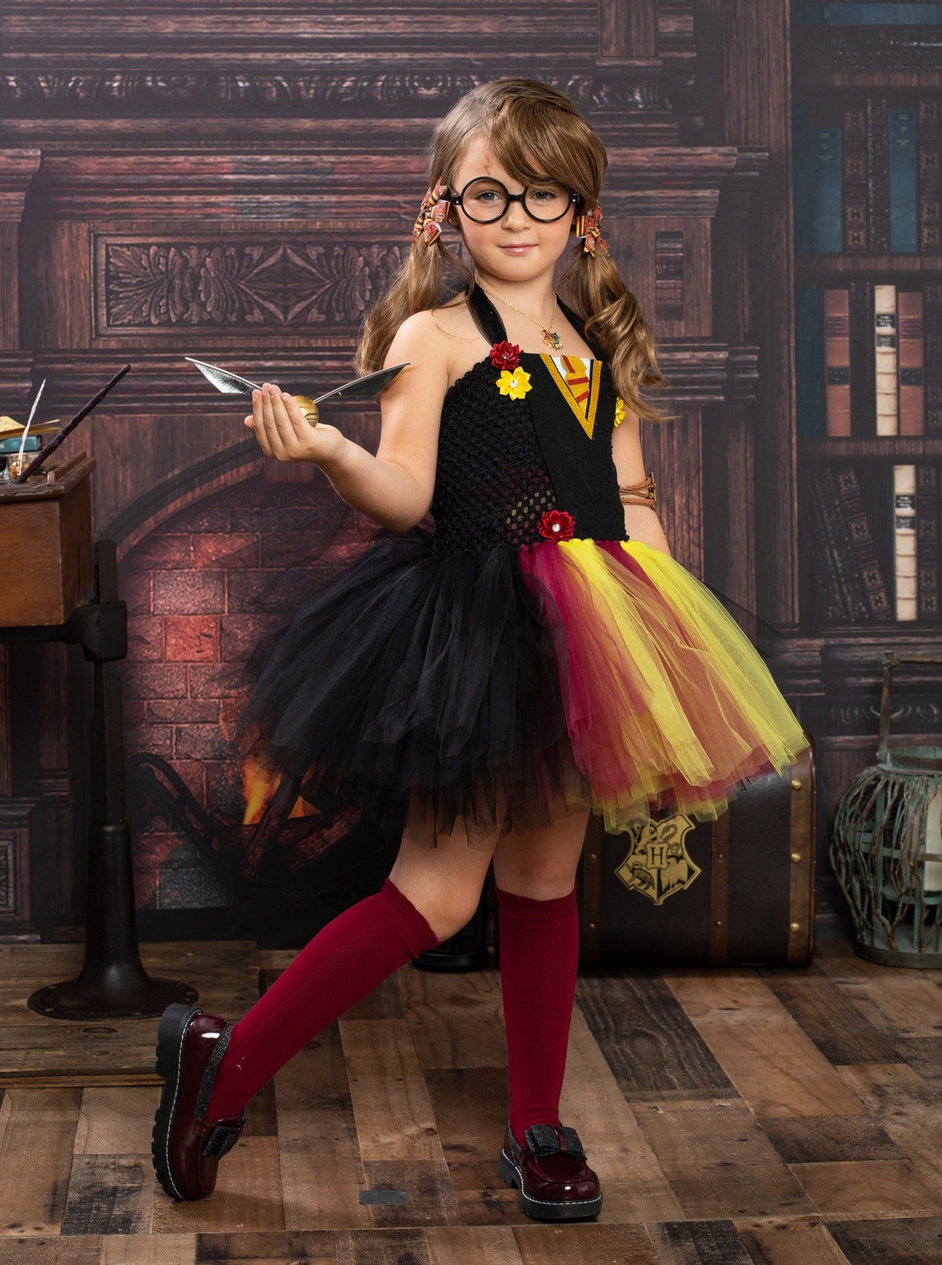 • The sorting hat has spoken; your little witch is top of class! So she's going to love this Red and Gold Wizard Tutu Costume Dress with a magical wand included! The stretchy, soft fabric is guaranteed to stay in place as she casts her spells and makes magic.