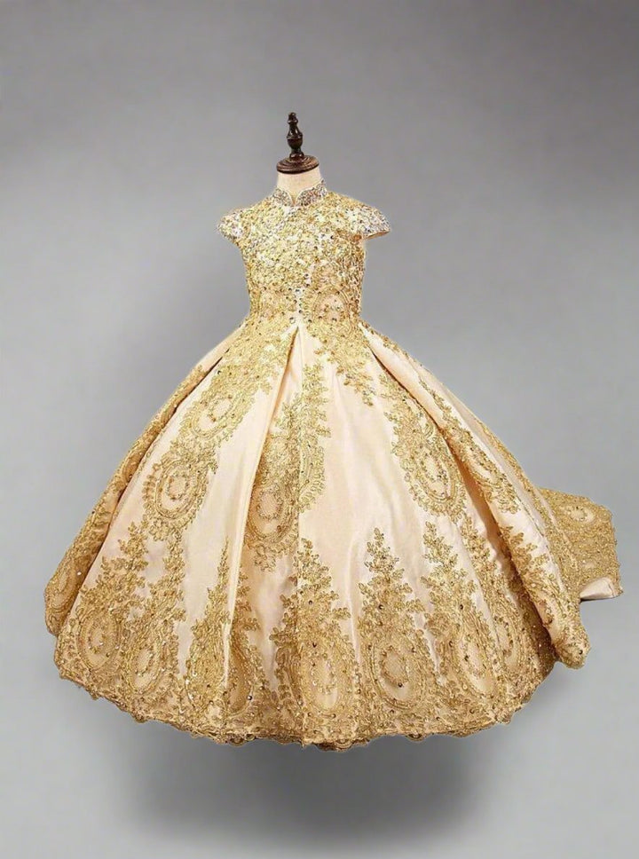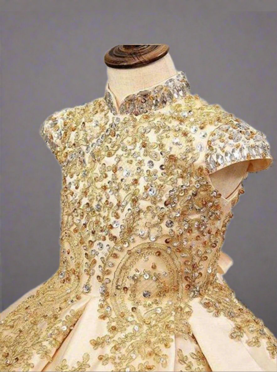 - The royal ball can't be complete without a stunning dress. Champagne-colored satin fabric covered with layers upon layers of gold appliques and sequins meticulously sewn by hand. The high neck, cap sleeves, and long elegant train give this formal dress a regal flair.
