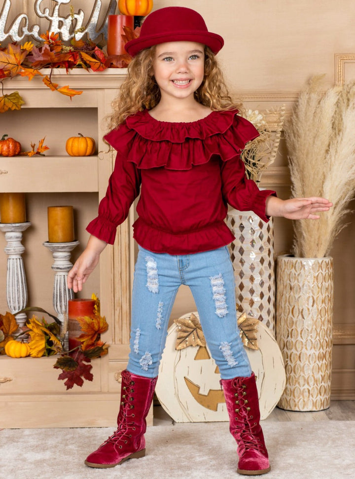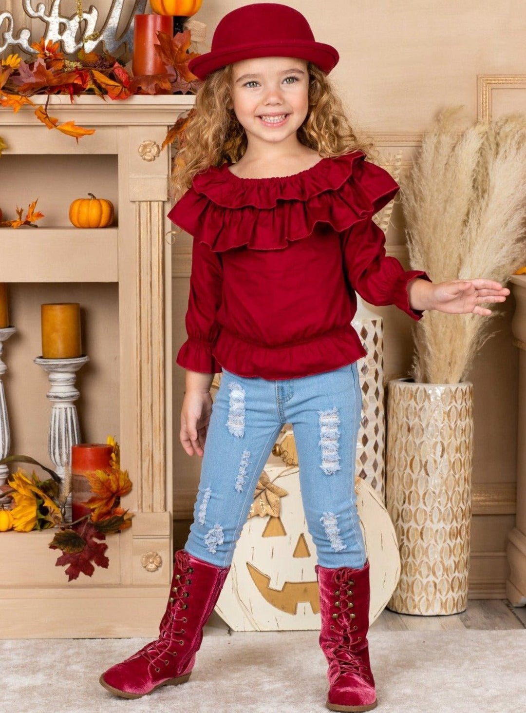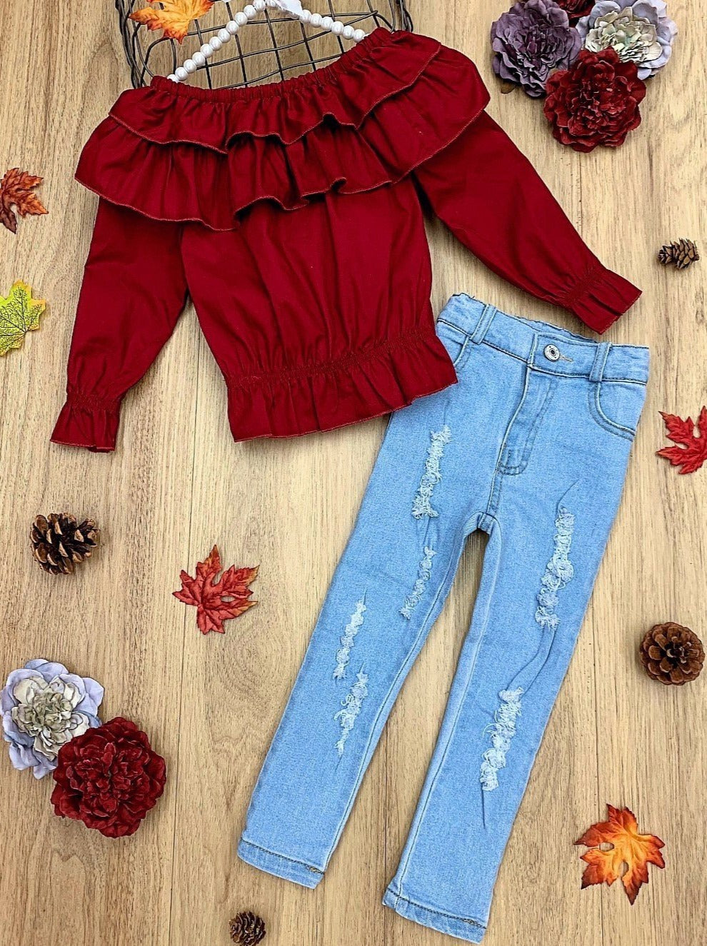 Cranberry Ruffled Bib Top And Distressed Jeans Set
