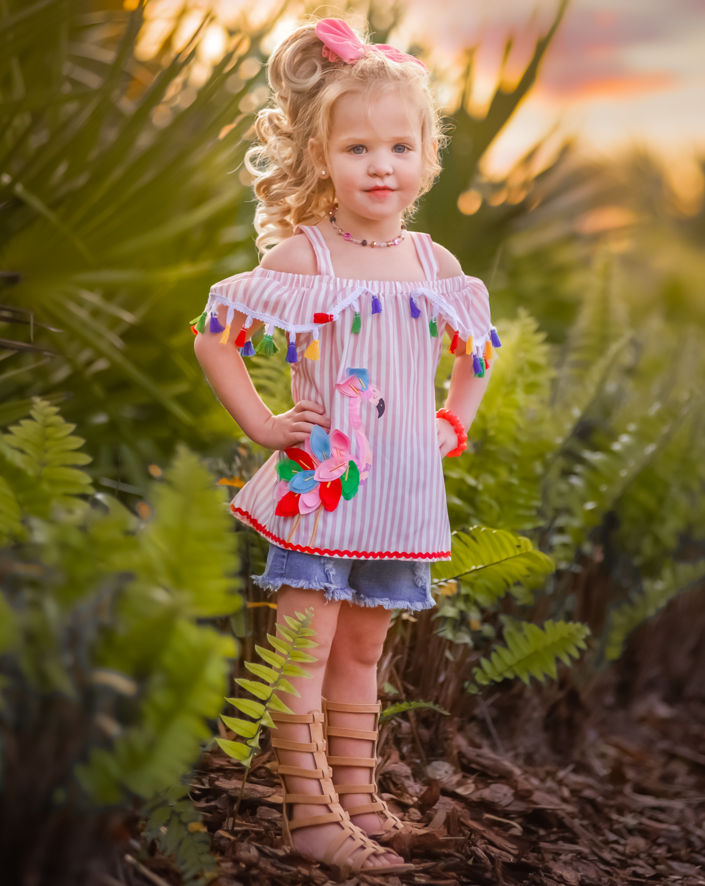 - You flamin-GLOW, girl! It's time to party and have summertime fun in this cute-as-can-be tassel top and jean shorts set. Multicolor tassels mixed with pink pinstripes and flamingo applique make this such a fun and charming ensemble that's sure to get her compliments!