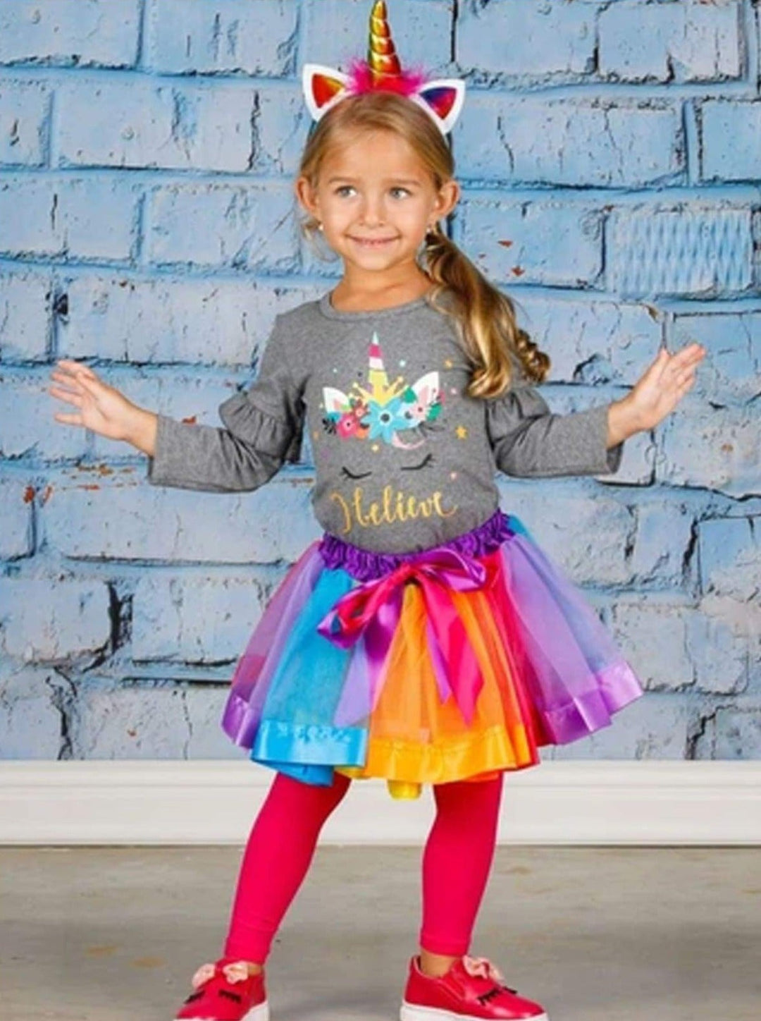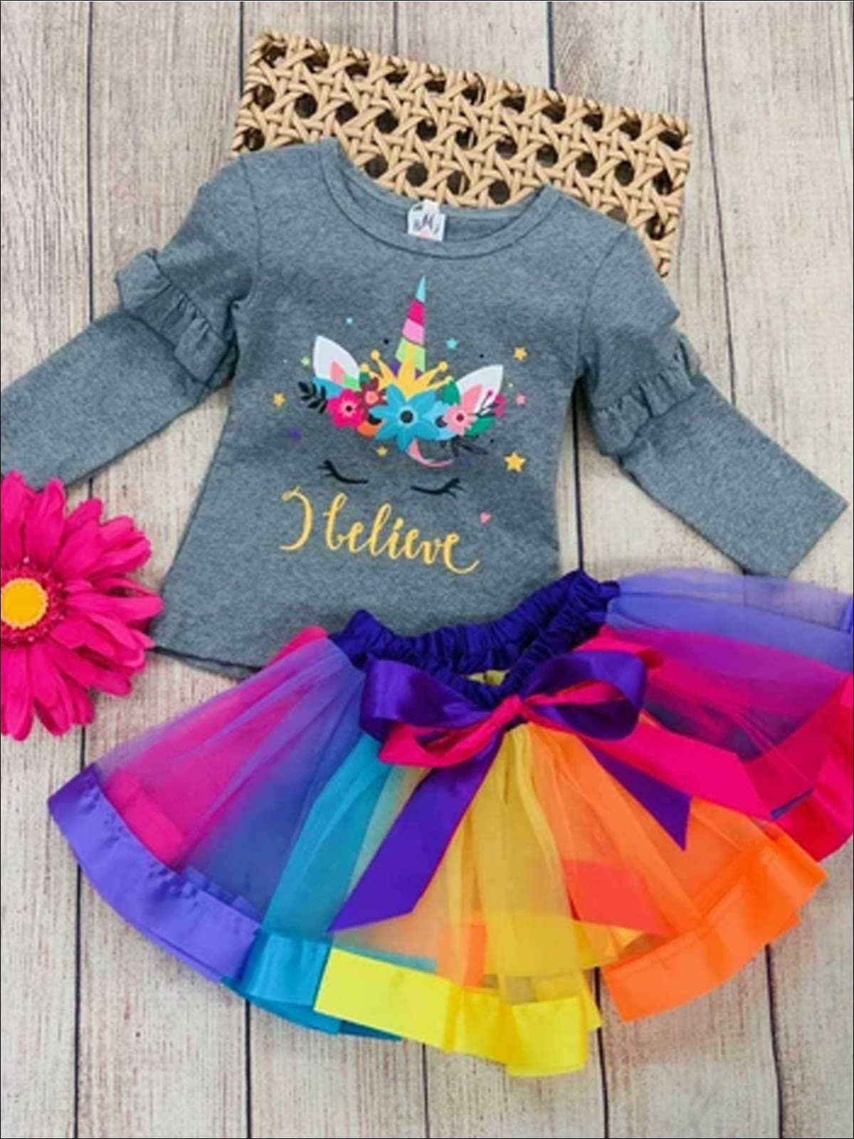 Girls Ruffled Floral "I Believe" Unicorn Top And Rainbow Tutu Skirt Set