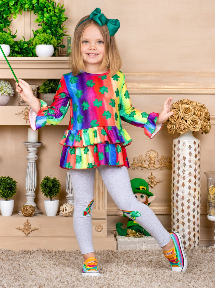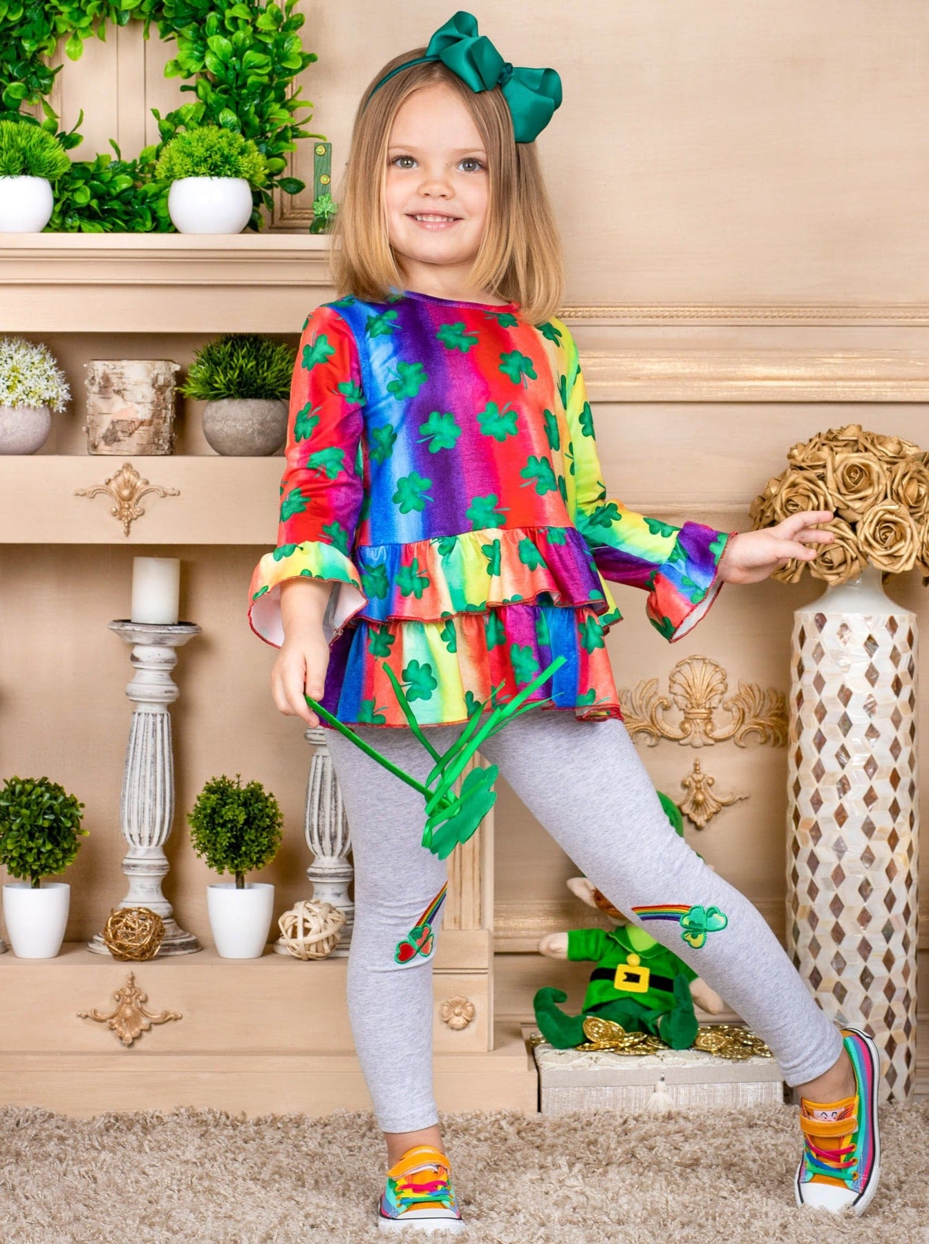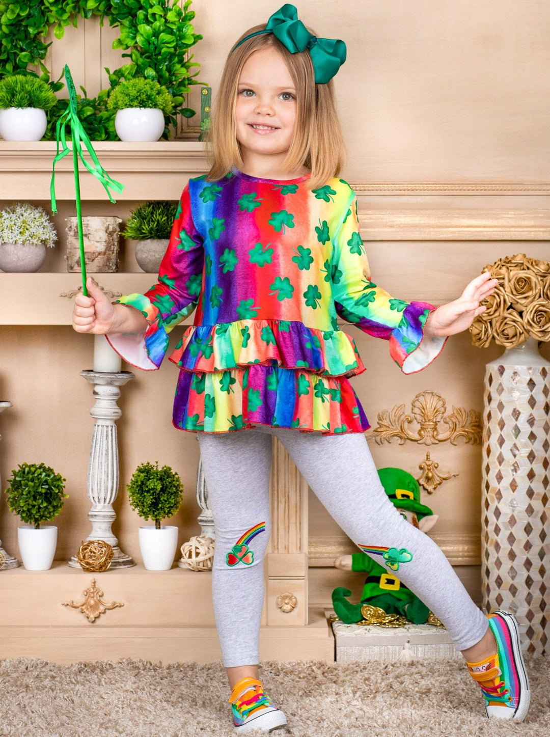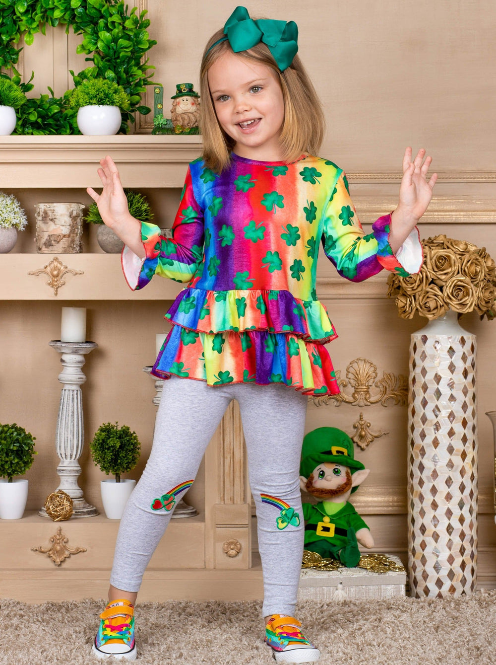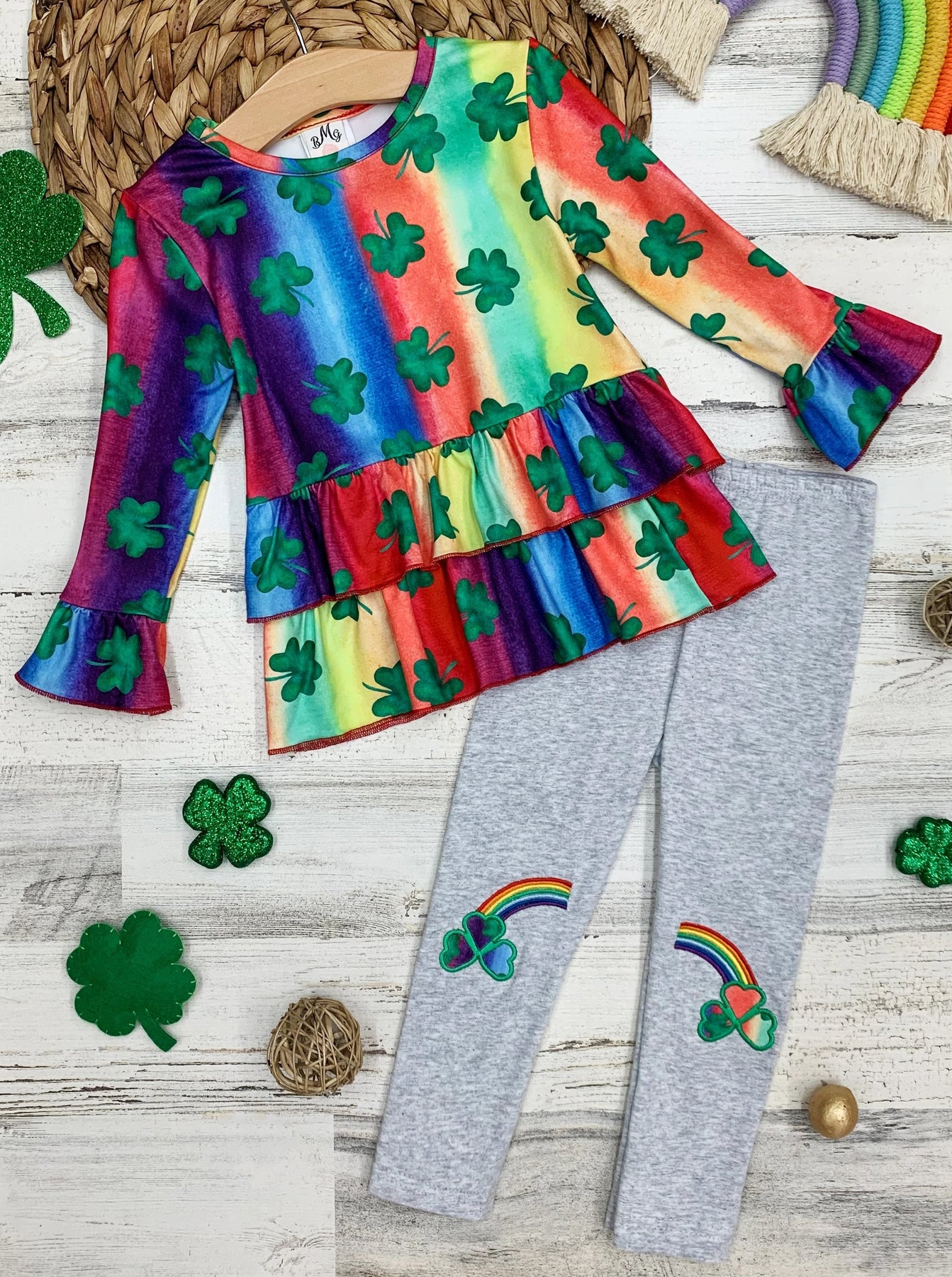 The set features a top with rainbow printed strips and clovers with grey leggings and rainbow/clover knee patches