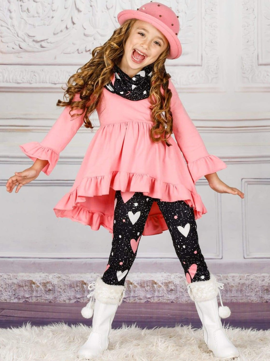 • The set features a ruffled long-sleeved hi-lo pink tunic with heart print leggings and matching infinity wrap scarf