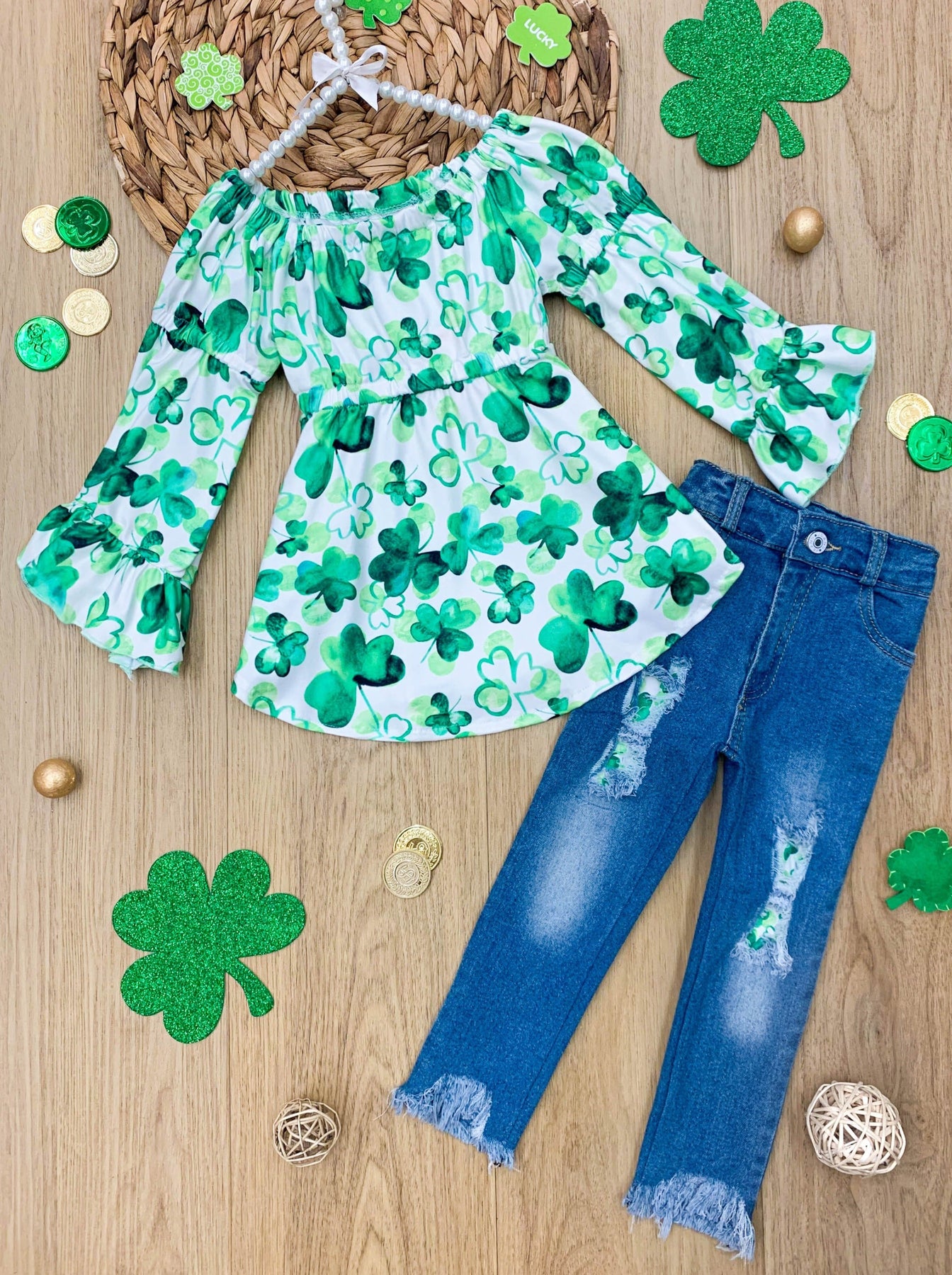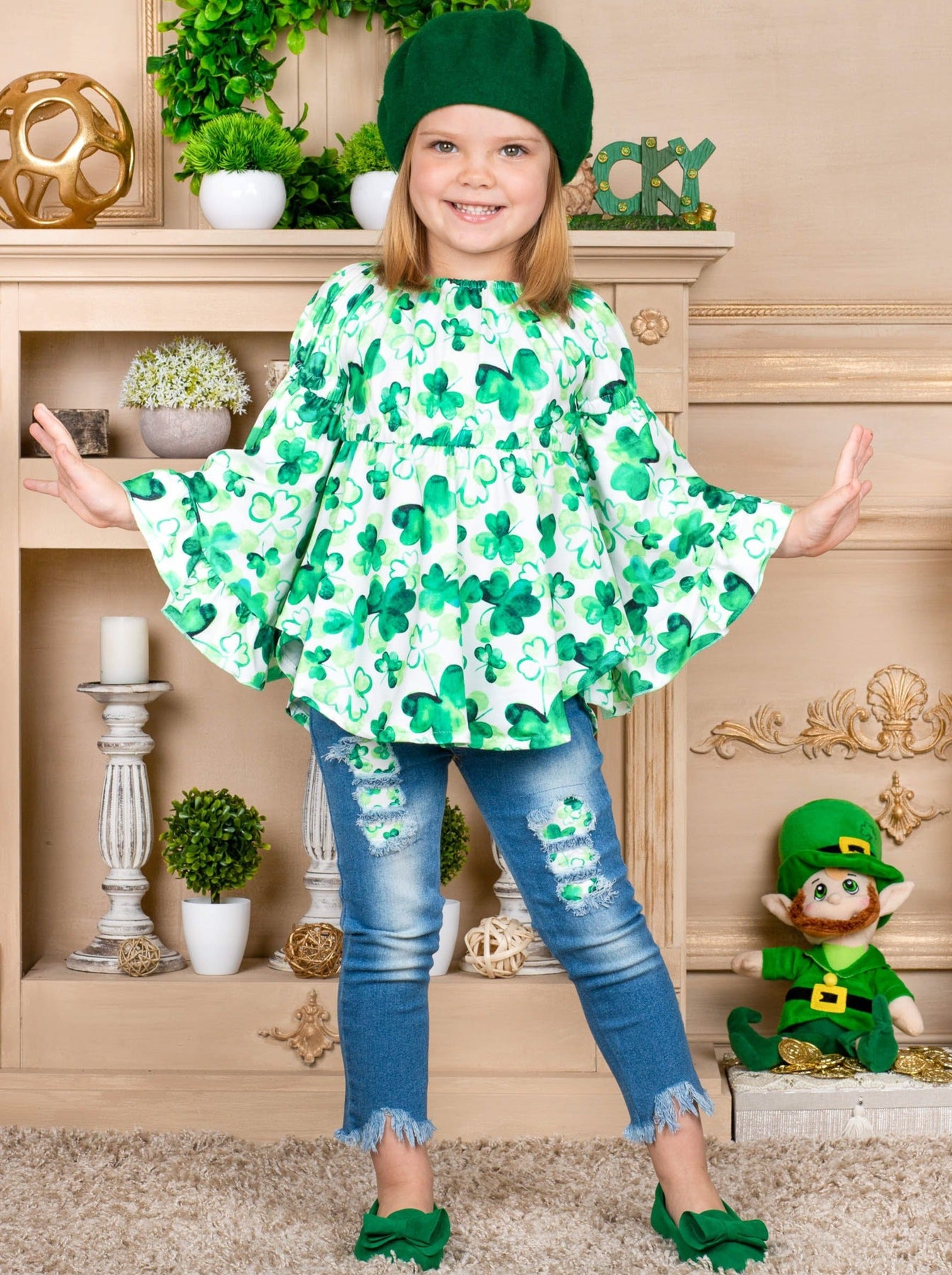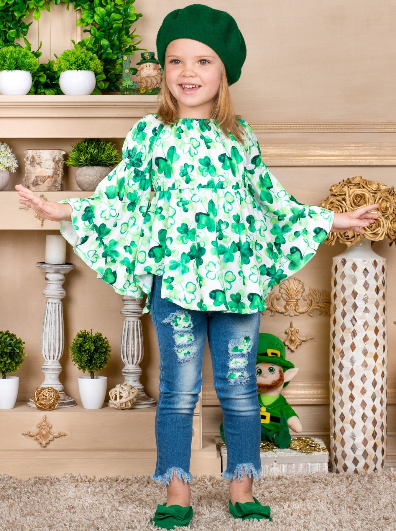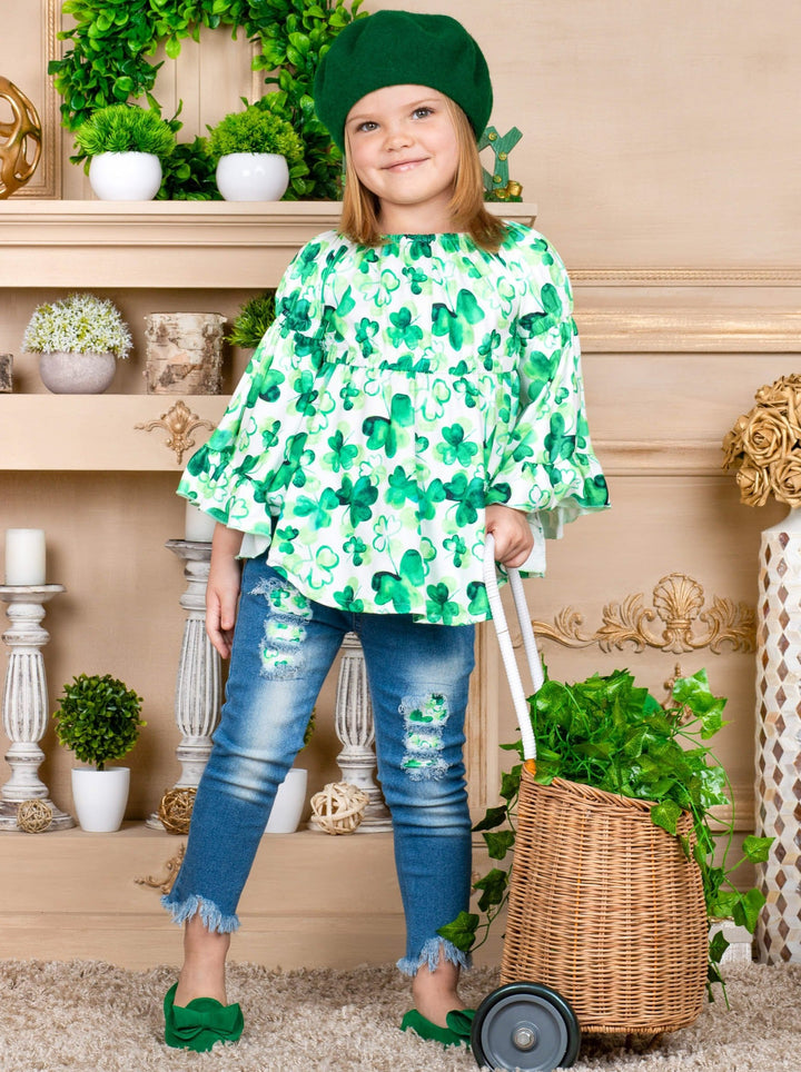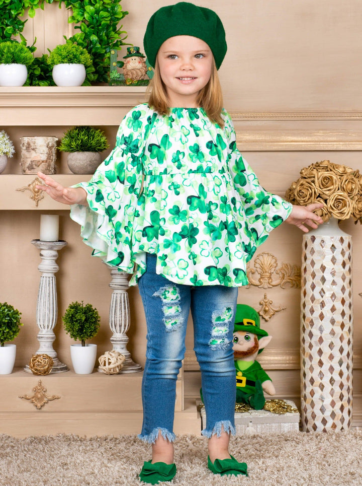 Break out the charm this St. Patty's Day with this chic bell-sleeve tunic and matching patched jeans set. 4-leaf clover print covers the pullover top gorgeously, and similar patches are found in distressed denim. Such a stylish outfit for your girl to sham-ROCK all day long.