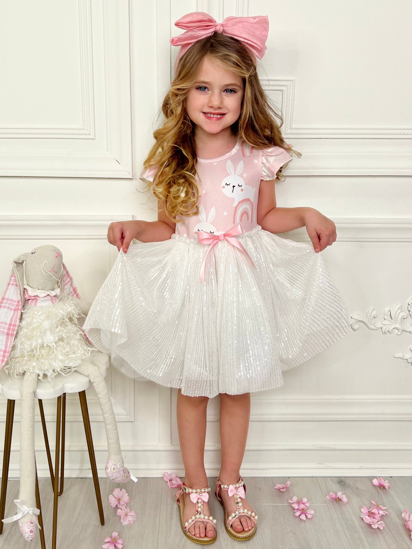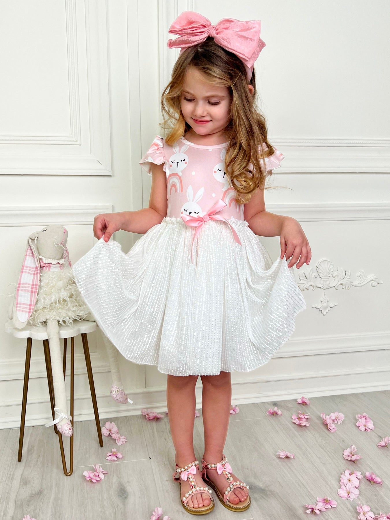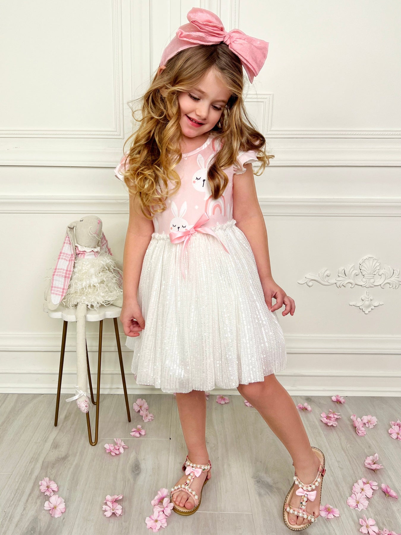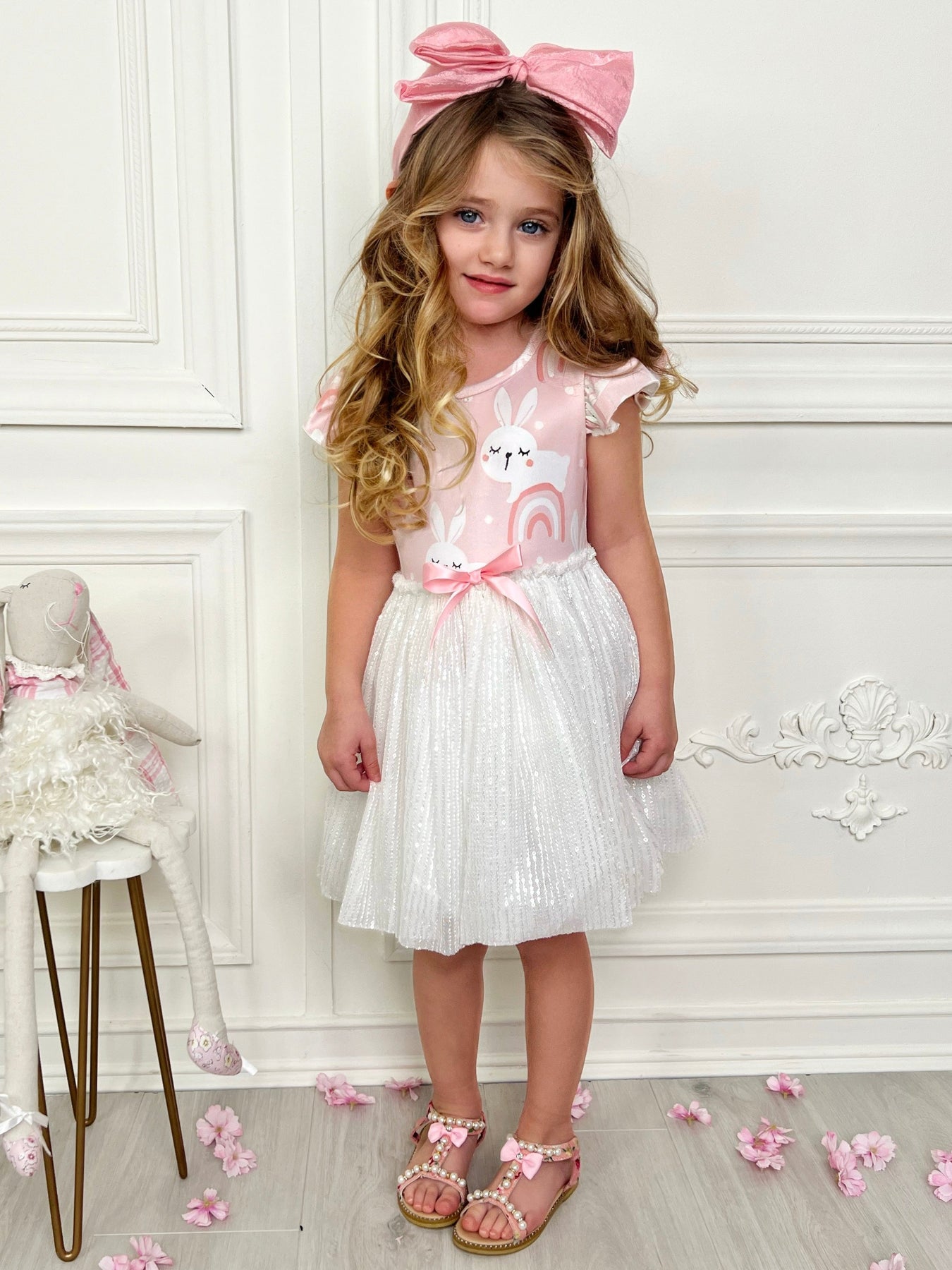 • Dress features scalloped flutter sleeves, bunny and rainbow print bodice, small ribbon bow at the waist, and a sequin mesh tulle skirt with full lining and elastic waistband